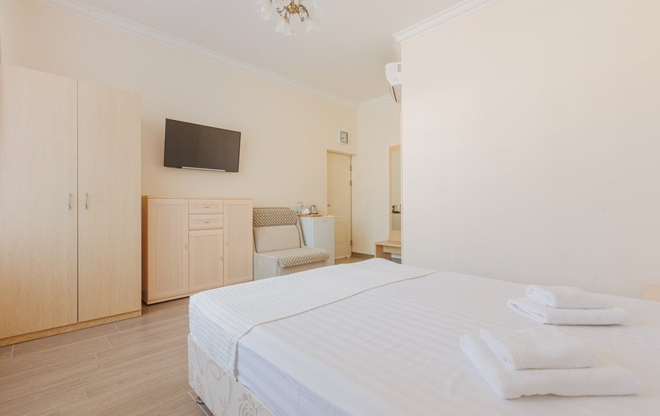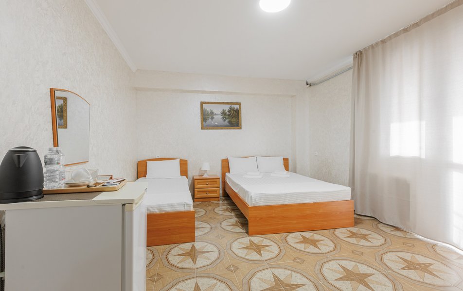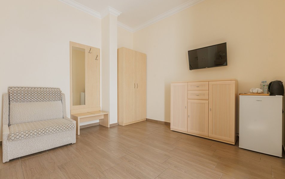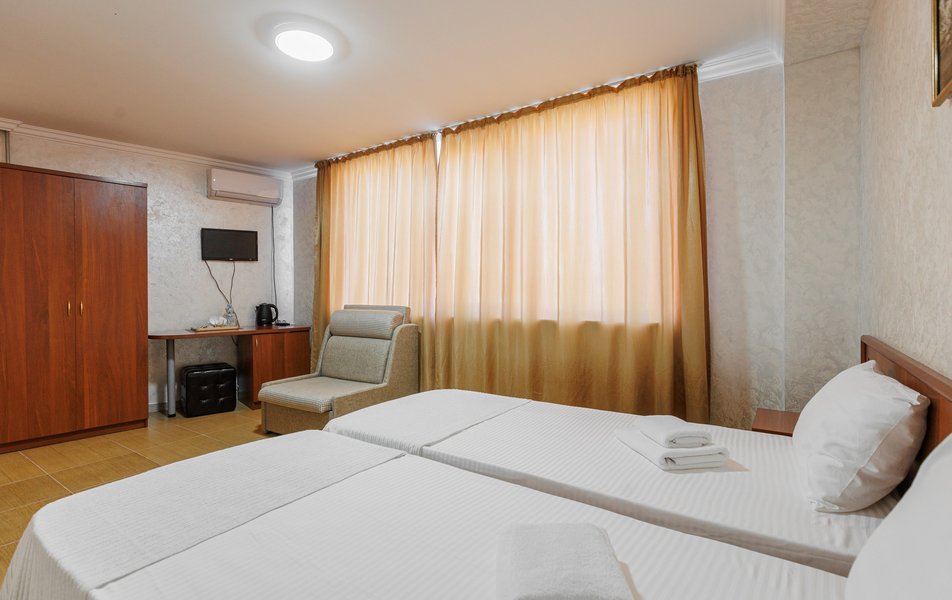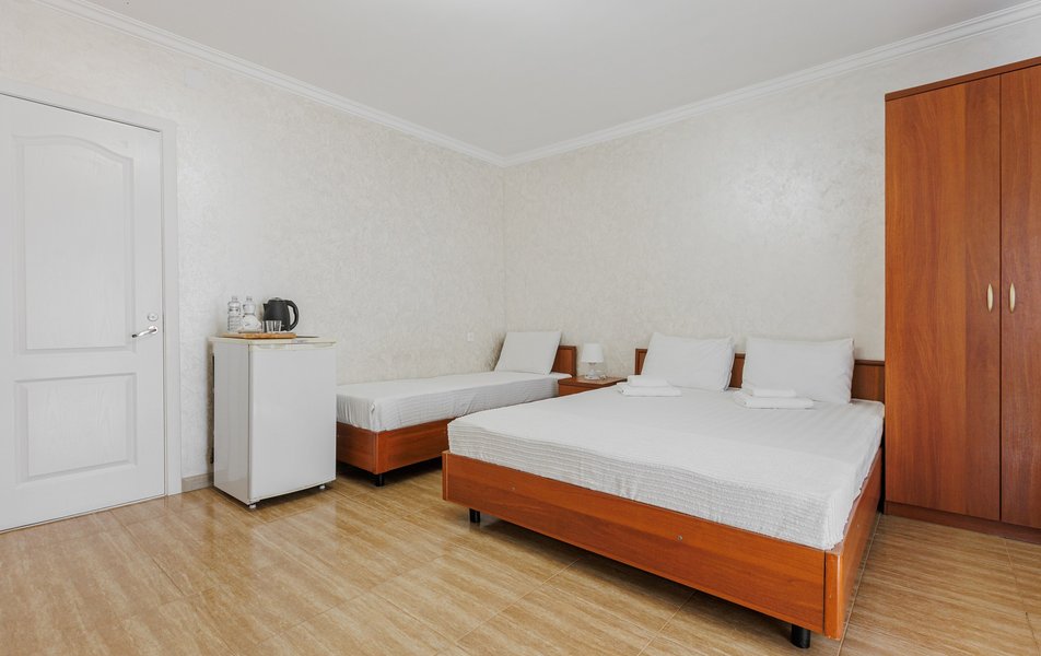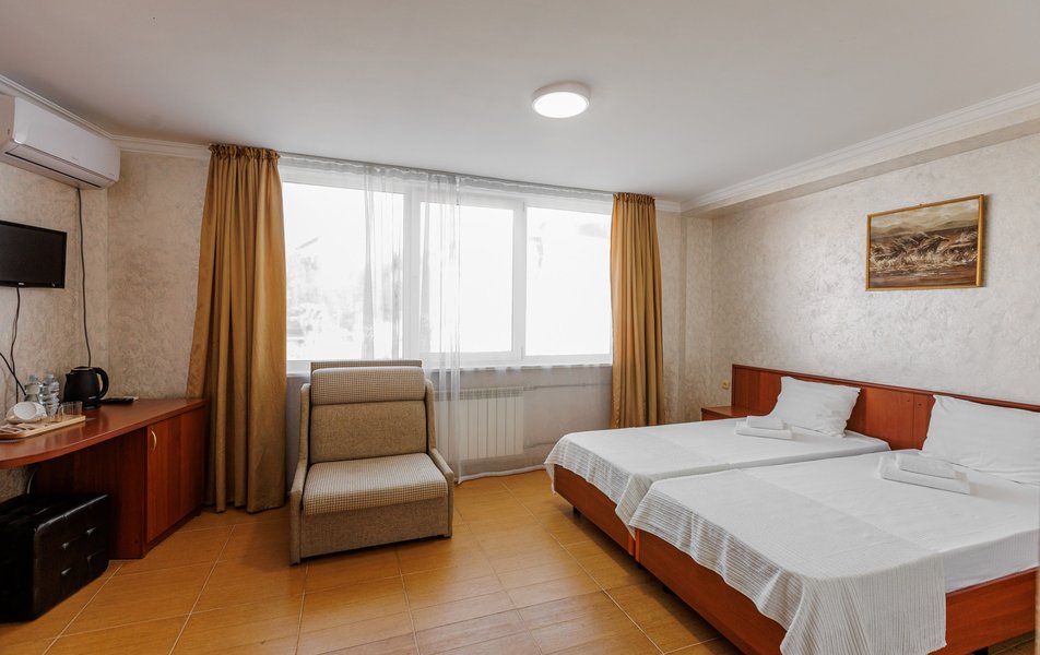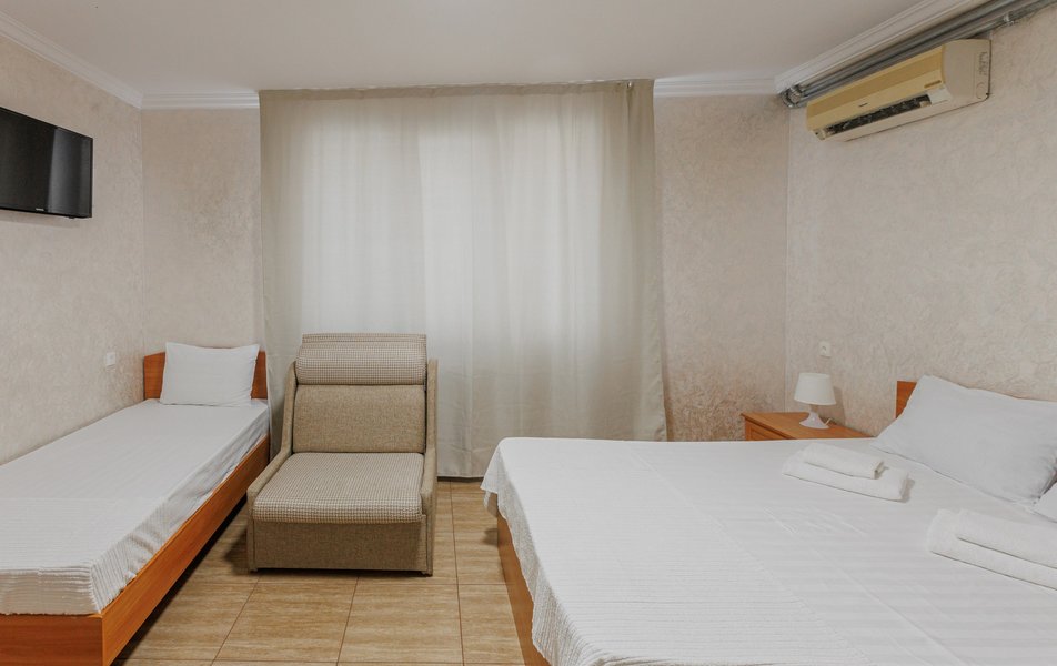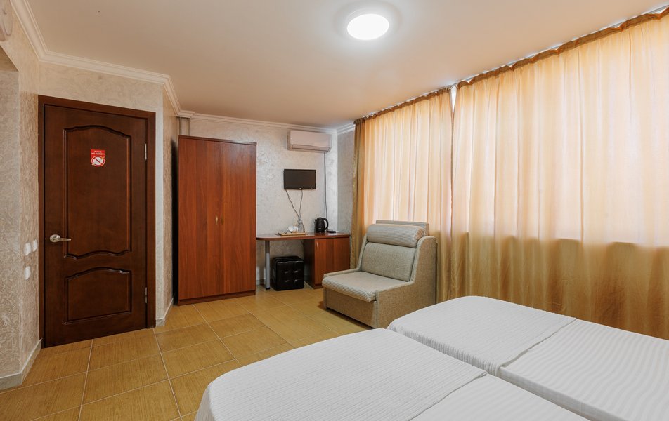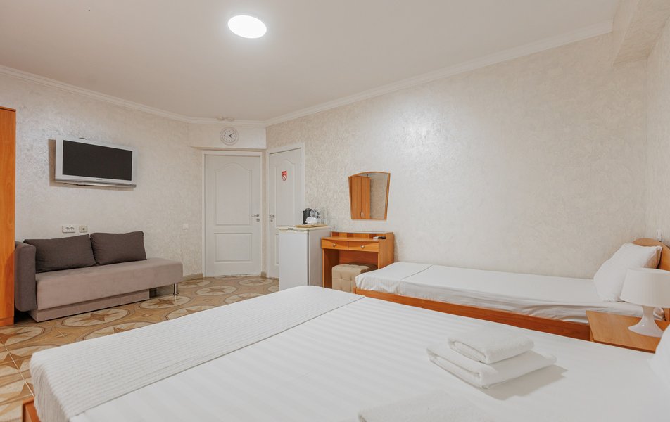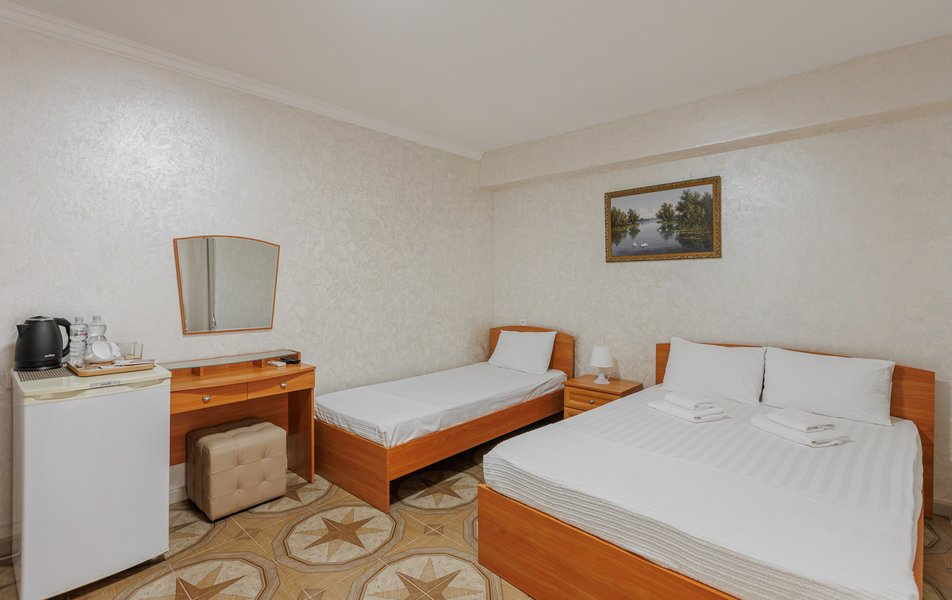 Делюкс 3-местный 1-комнатный Количество комнат: 1-комнатный Тип номера: Делюкс Кол-во основных мест: 3 Корпус: Новый корпус Площадь (кв. м): 19 Этаж: 1 Мебель: комод, кресло-кровать, кровати односпальные /одна двуспальная кровать, прикроватные тумбочки, тумба багажная, шкаф, шкаф-купе Оборудование: гладильная доска: по запросу, кондиционер, телевизор ЖК, утюг: по запросу, холодильник, электрочайник Санузел: с душевой кабиной, туалетные принадлежности, фен Сервис: Wi-Fi бесплатно, смена полотенец, смена постельного белья, уборка номера