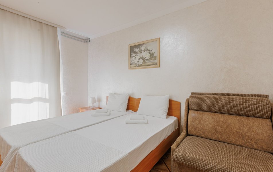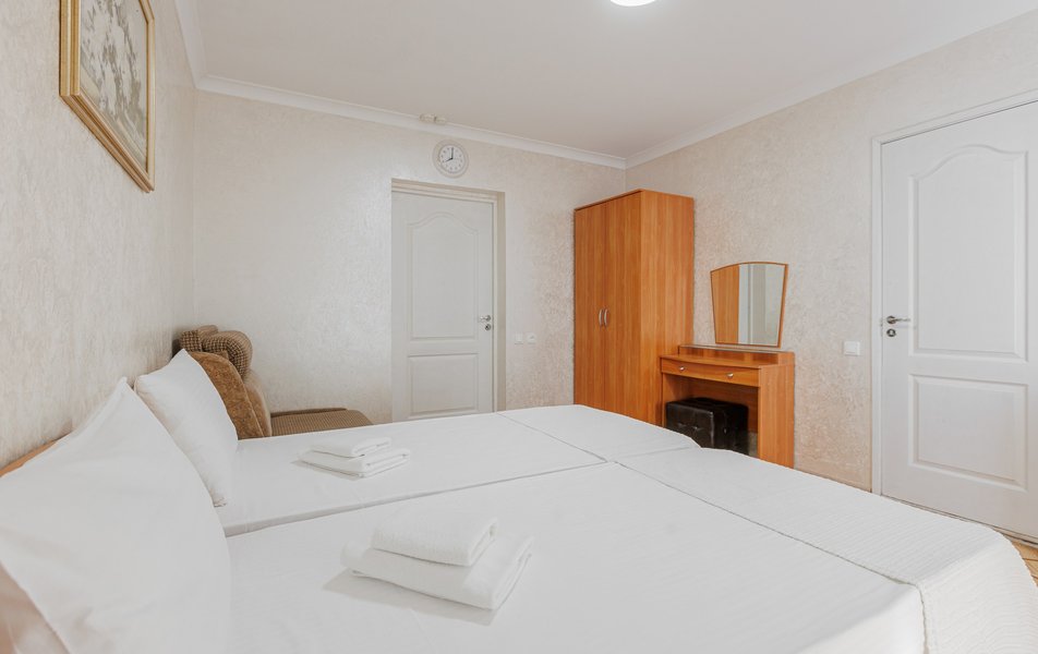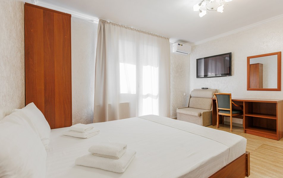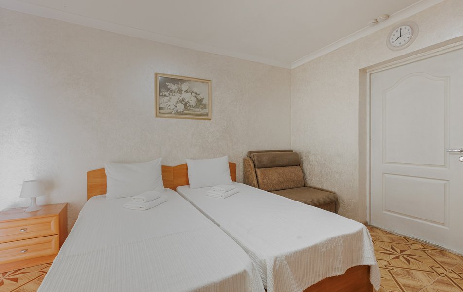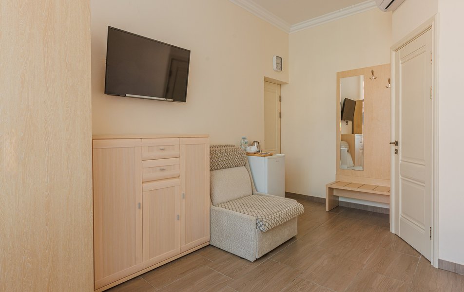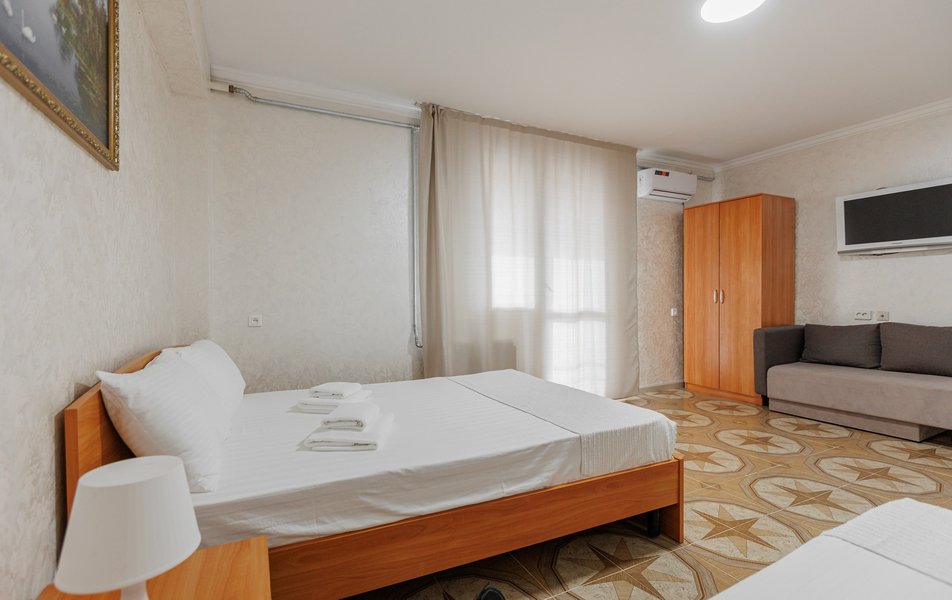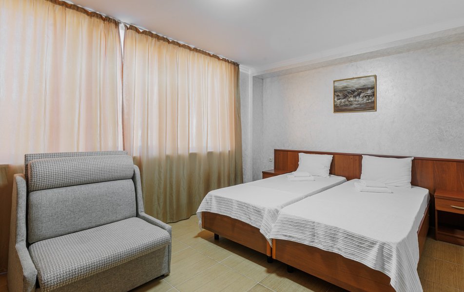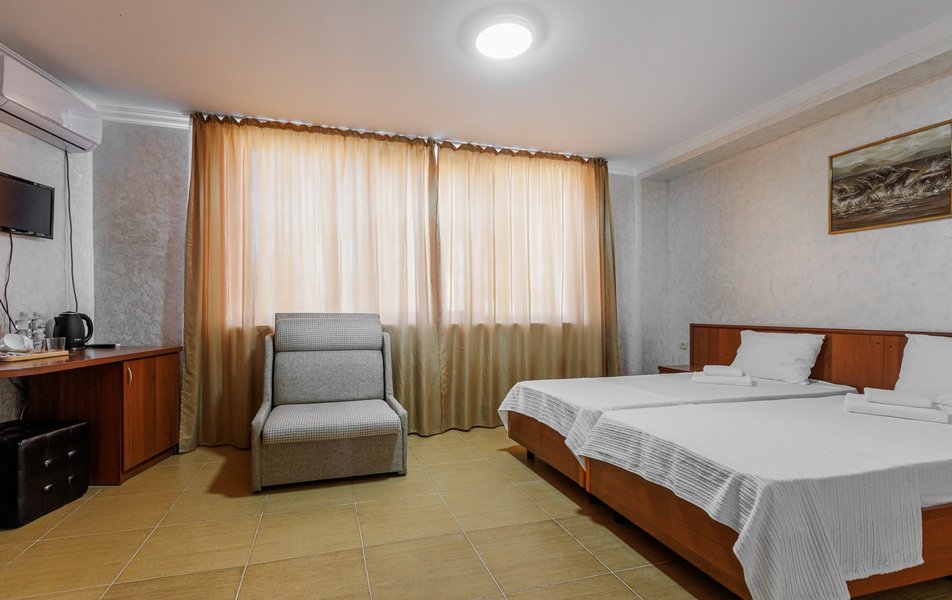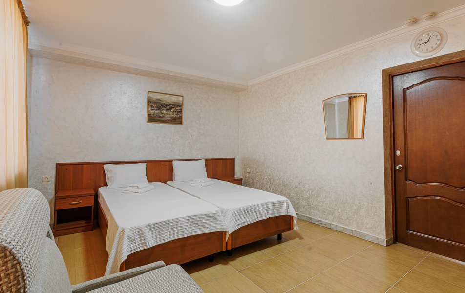 Делюкс 3-местный 1-комнатный Количество комнат: 1-комнатный Тип номера: Делюкс Кол-во основных мест: 3 Корпус: Новый корпус Площадь (кв. м): 19 Этаж: 1 Мебель: комод, кресло-кровать, кровати односпальные /одна двуспальная кровать, прикроватные тумбочки, тумба багажная, шкаф, шкаф-купе Оборудование: гладильная доска: по запросу, кондиционер, телевизор ЖК, утюг: по запросу, холодильник, электрочайник Санузел: с душевой кабиной, туалетные принадлежности, фен Сервис: Wi-Fi бесплатно, смена полотенец, смена постельного белья, уборка номера