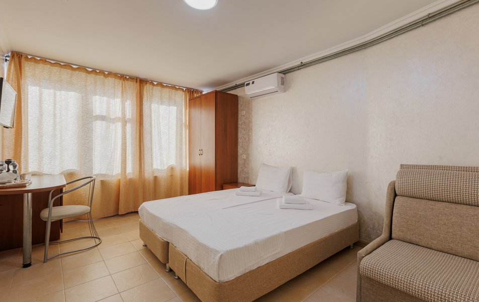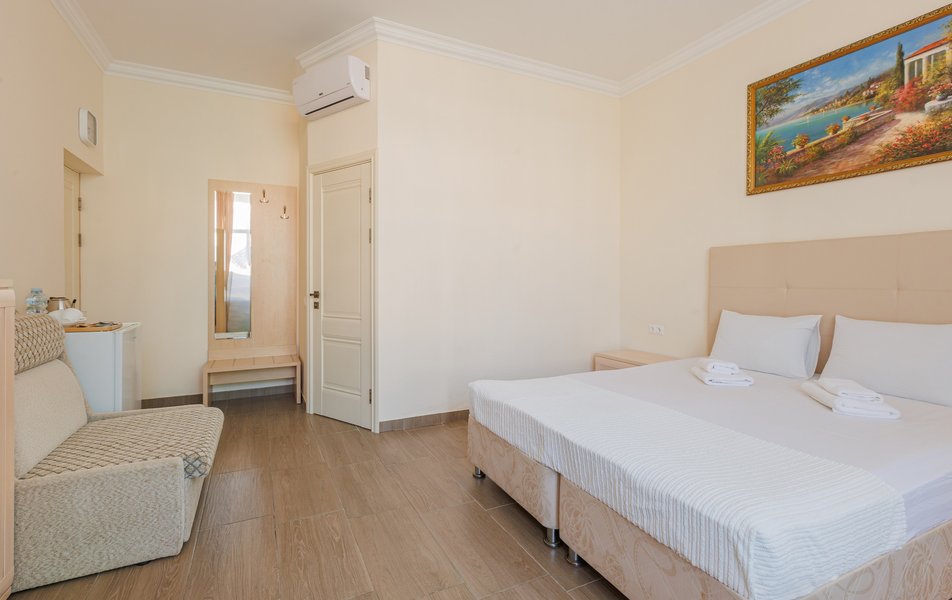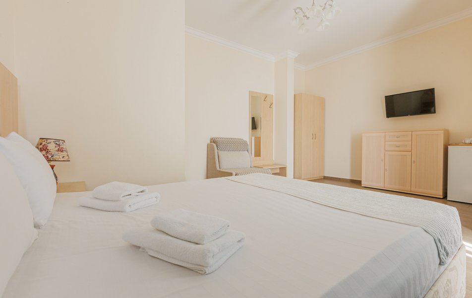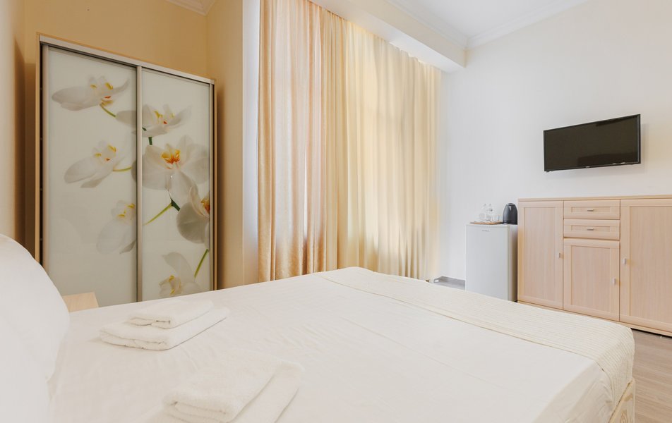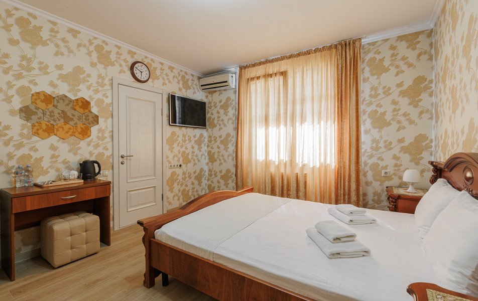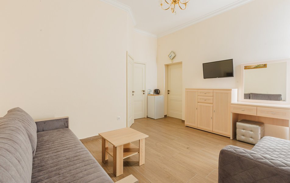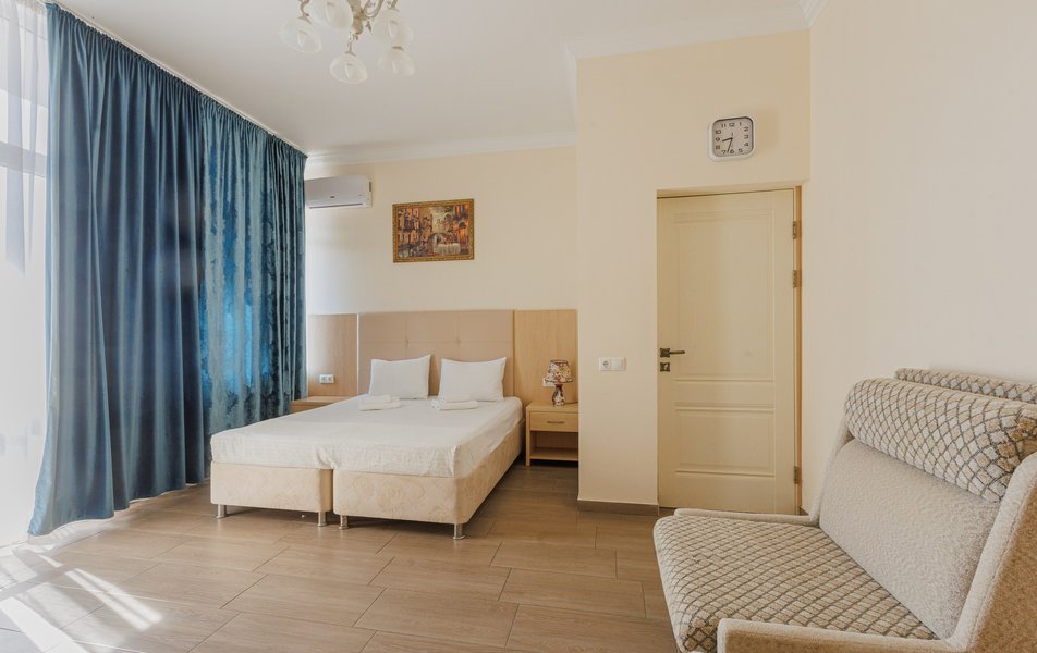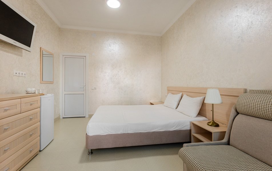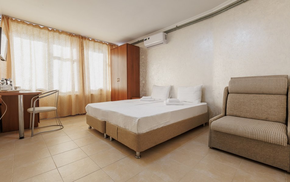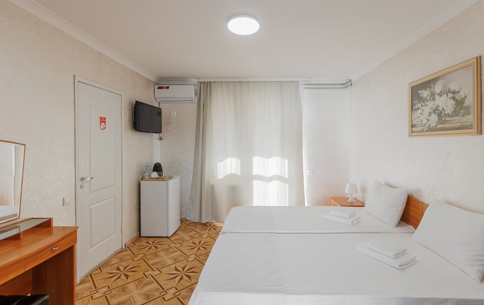 Делюкс 3-местный 1-комнатный Количество комнат: 1-комнатный Тип номера: Делюкс Кол-во основных мест: 3 Корпус: Новый корпус Площадь (кв. м): 19 Этаж: 1 Мебель: комод, кресло-кровать, кровати односпальные /одна двуспальная кровать, прикроватные тумбочки, тумба багажная, шкаф, шкаф-купе Оборудование: гладильная доска: по запросу, кондиционер, телевизор ЖК, утюг: по запросу, холодильник, электрочайник Санузел: с душевой кабиной, туалетные принадлежности, фен Сервис: Wi-Fi бесплатно, смена полотенец, смена постельного белья, уборка номера