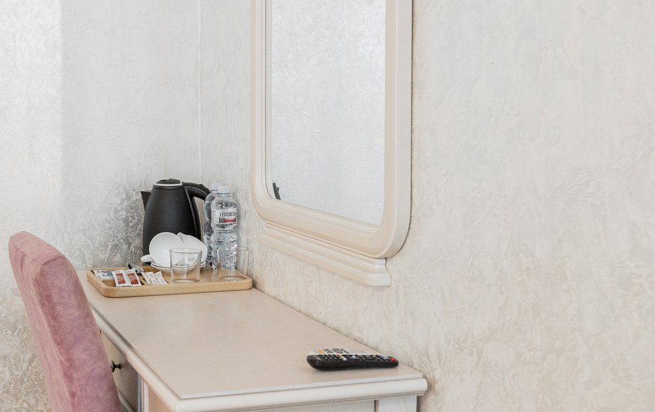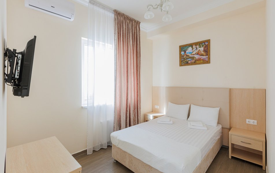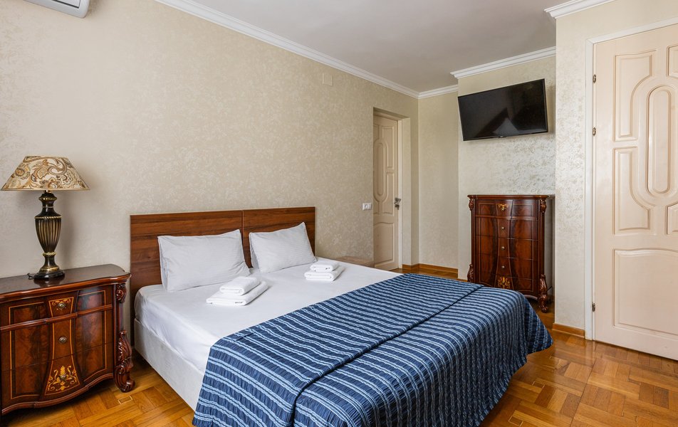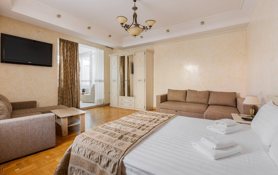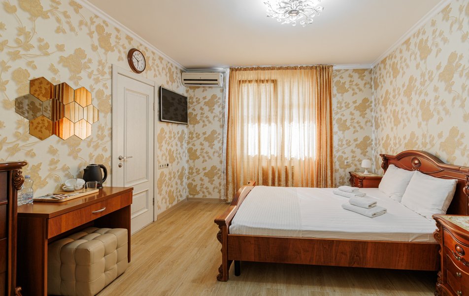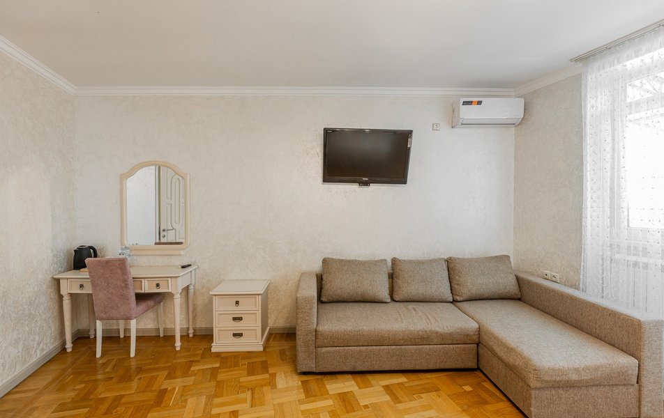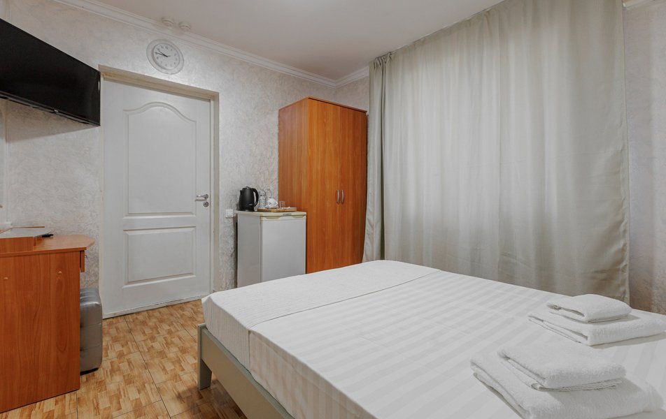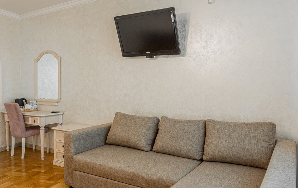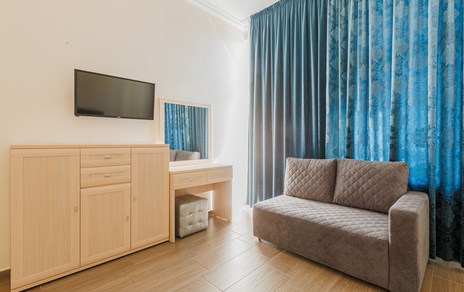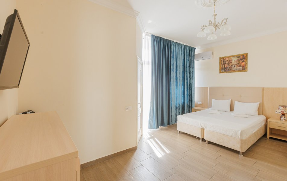 Делюкс 3-местный 1-комнатный Количество комнат: 1-комнатный Тип номера: Делюкс Кол-во основных мест: 3 Корпус: Новый корпус Площадь (кв. м): 19 Этаж: 1 Мебель: комод, кресло-кровать, кровати односпальные /одна двуспальная кровать, прикроватные тумбочки, тумба багажная, шкаф, шкаф-купе Оборудование: гладильная доска: по запросу, кондиционер, телевизор ЖК, утюг: по запросу, холодильник, электрочайник Санузел: с душевой кабиной, туалетные принадлежности, фен Сервис: Wi-Fi бесплатно, смена полотенец, смена постельного белья, уборка номера