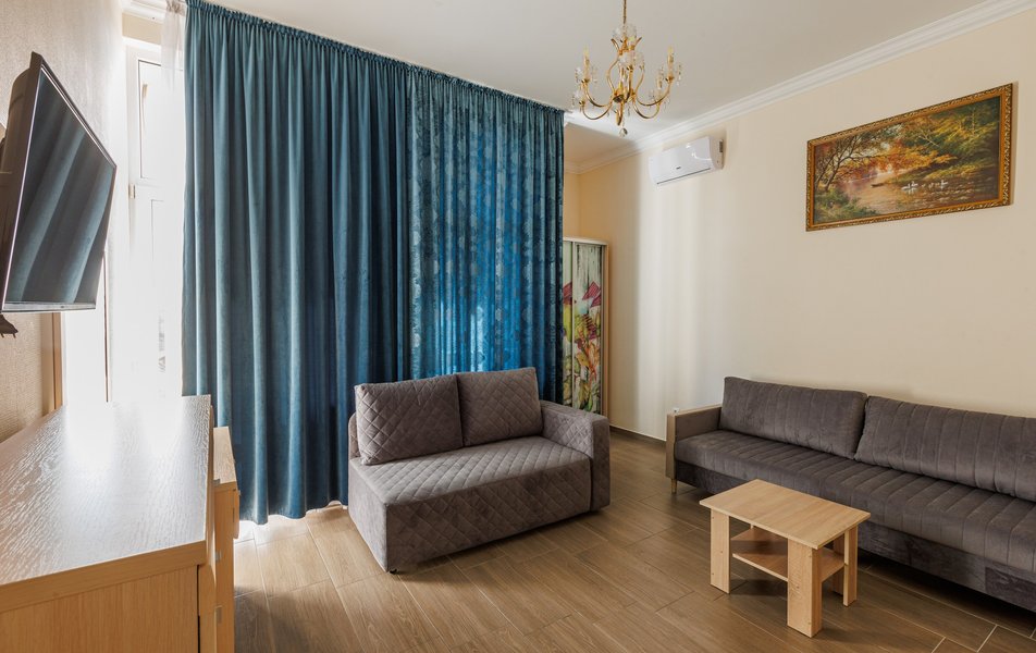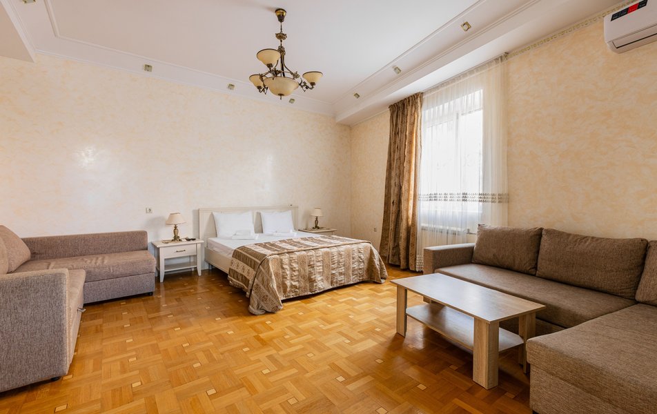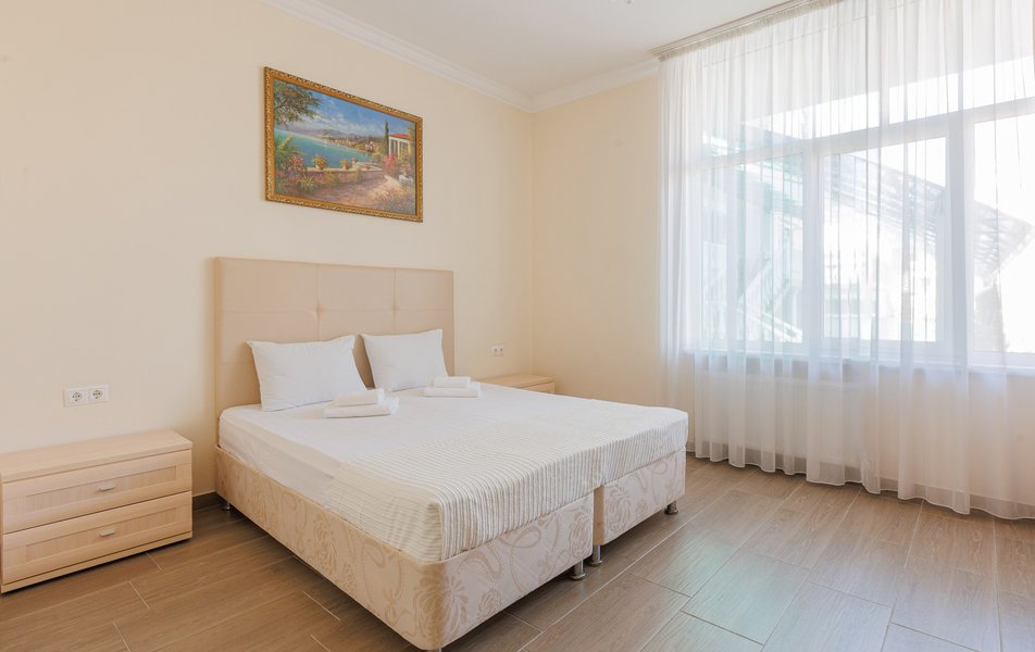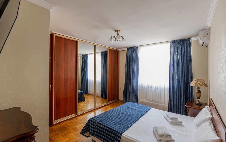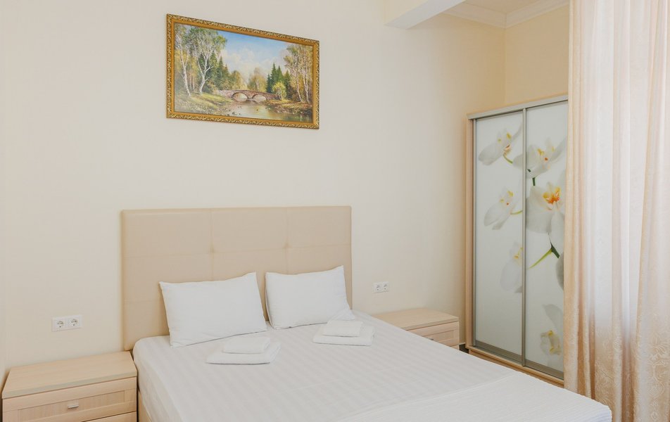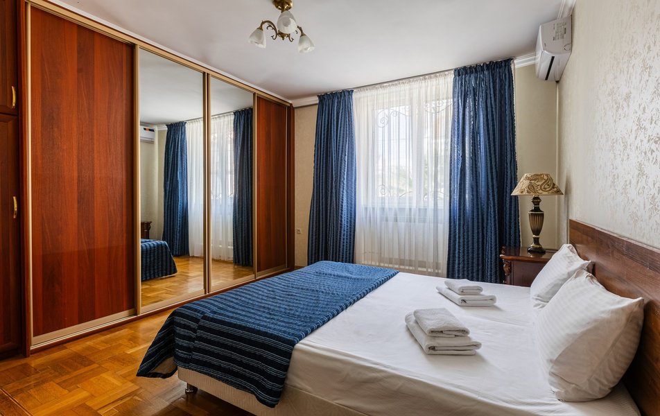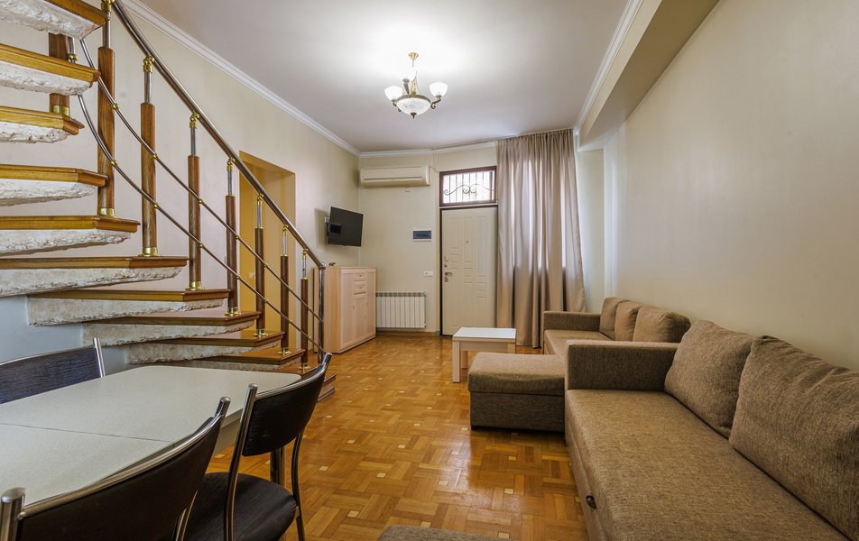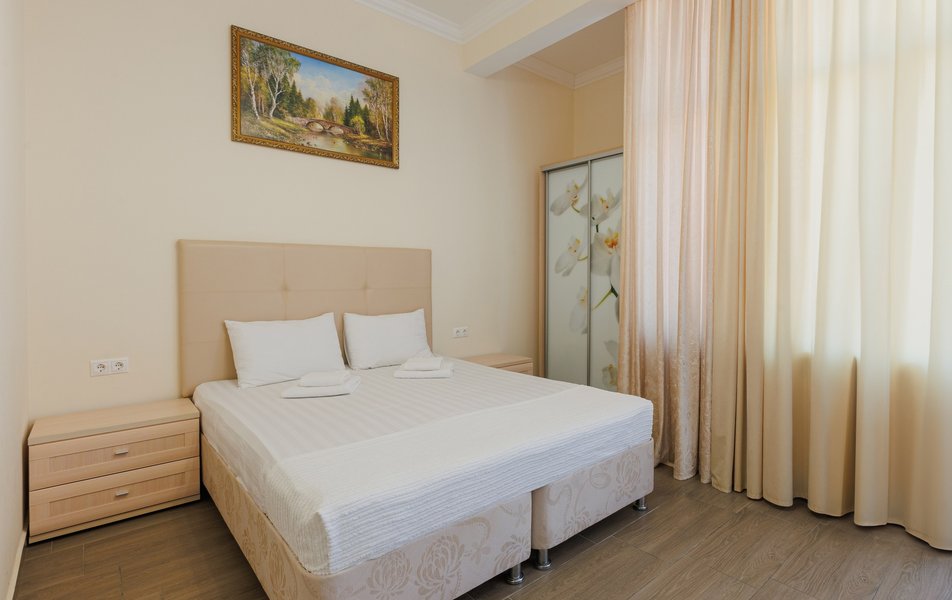 Апартаменты 7-местный 2-уровневый Количество комнат: 1-комнатный Тип номера: Апартаменты Кол-во основных мест: 7 Площадь (кв. м): 80 Мебель: диван раскладной, комод, кровать двуспальная, кухонная мебель, прикроватная тумбочка, стол, столик журнальный, стулья, шкаф-купе Оборудование: гладильная доска: по запросу, духовой шкаф, кондиционер, микроволновая печь, набор посуды, плита электрическая, пылесос, стиральная машина, телевизор ЖК, утюг: по запросу, холодильник, электрочайник Санузел: 2 санузла, с душевой кабиной, туалетные принадлежности, фен Сервис: Wi-Fi бесплатно