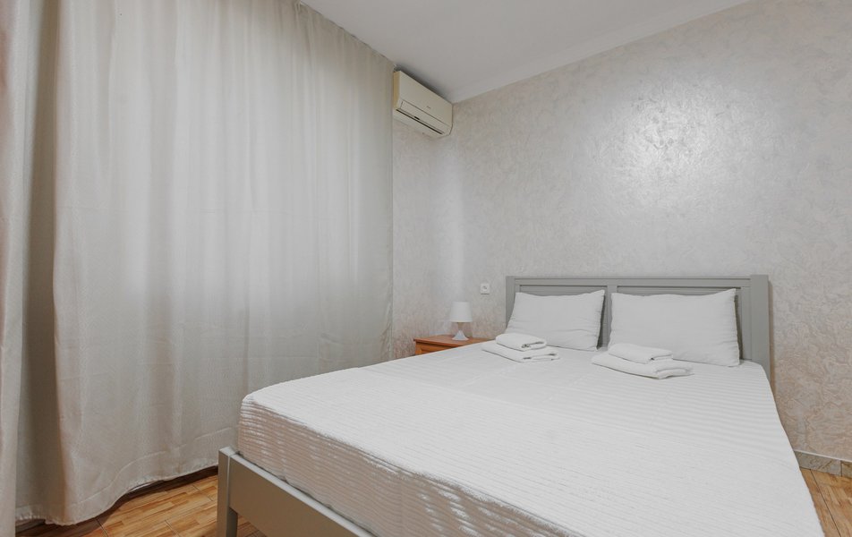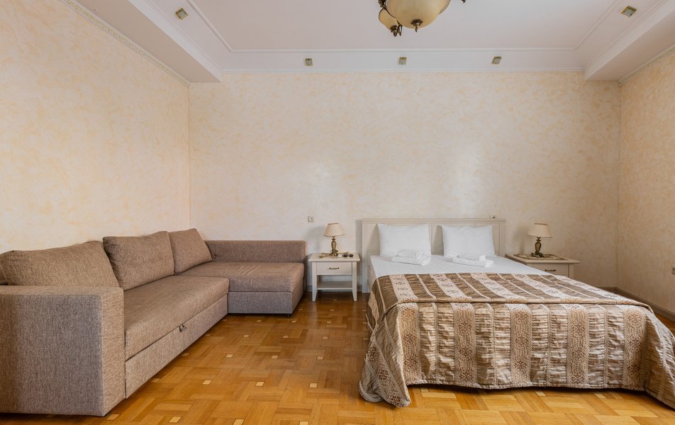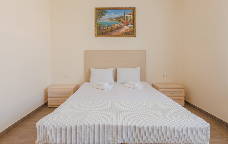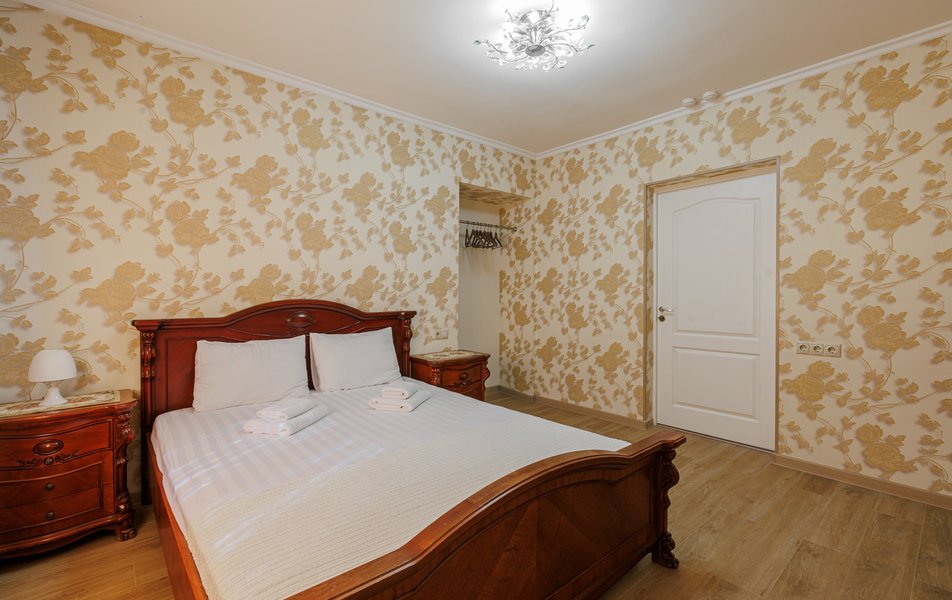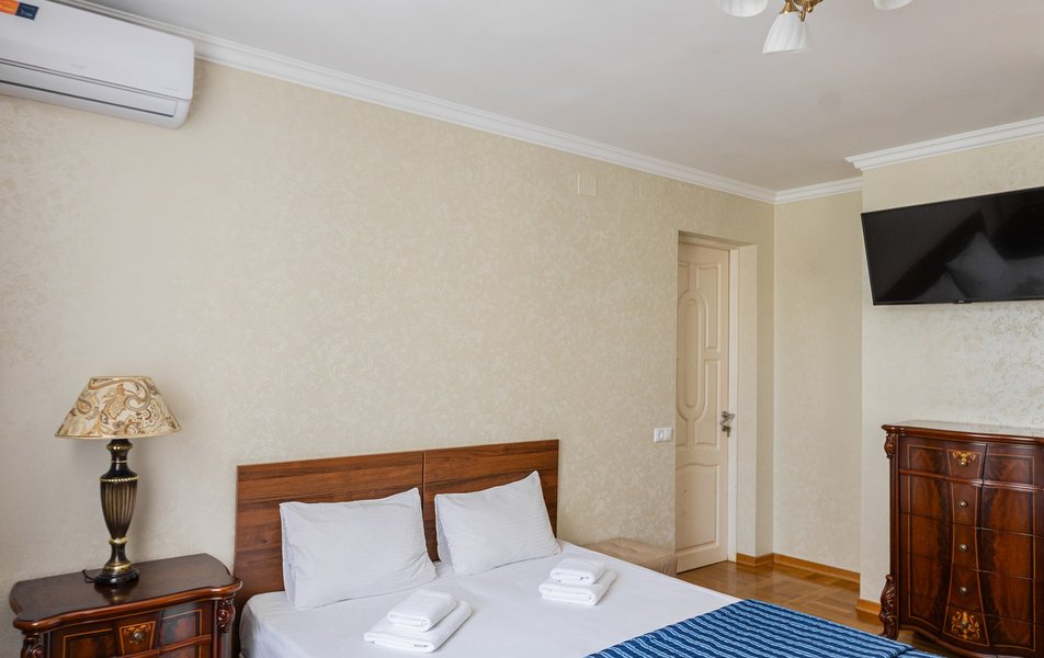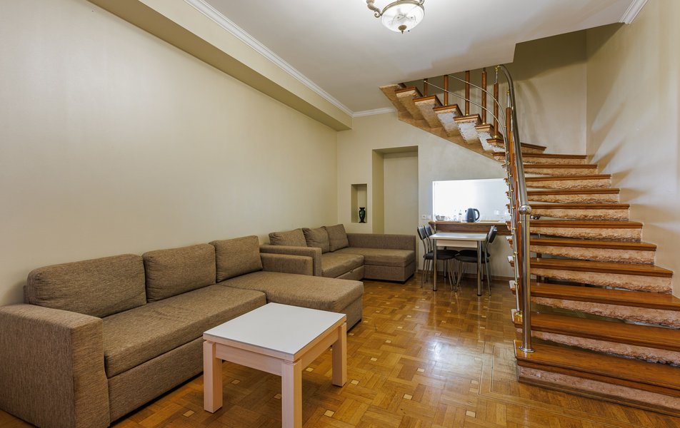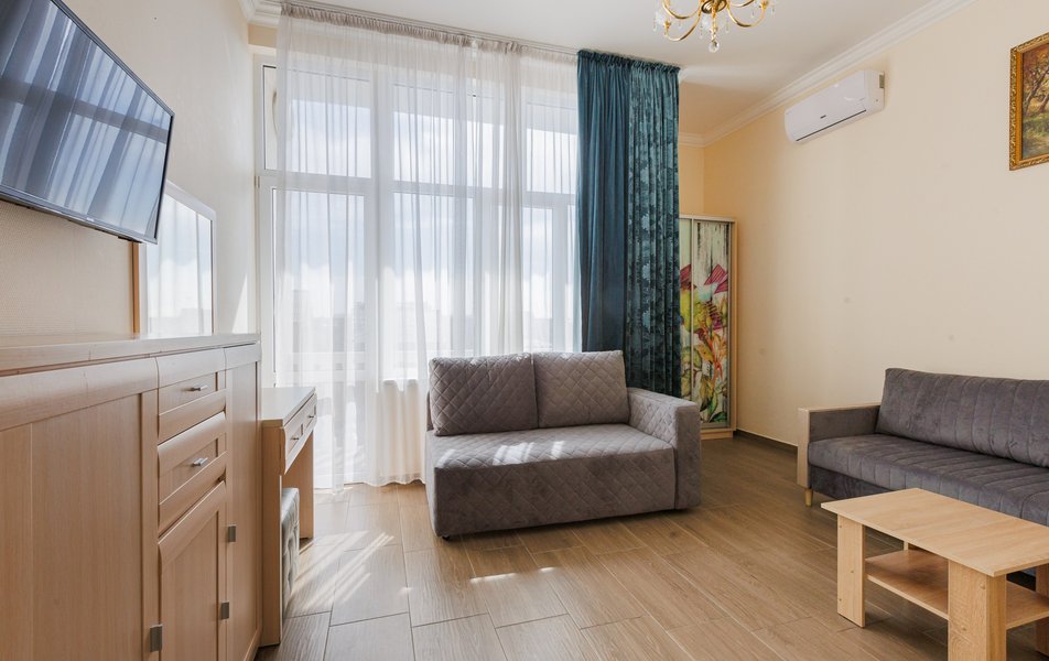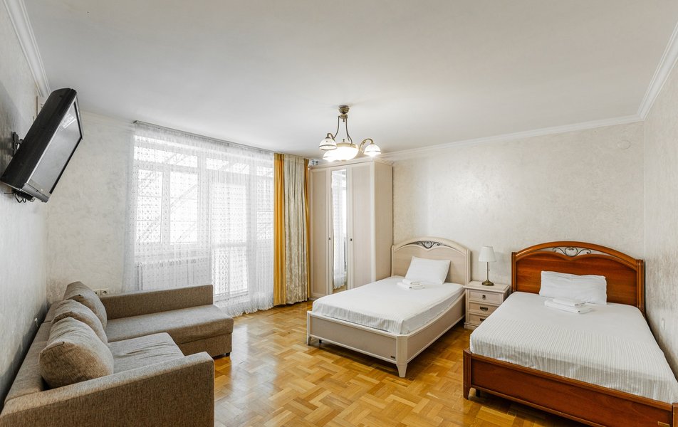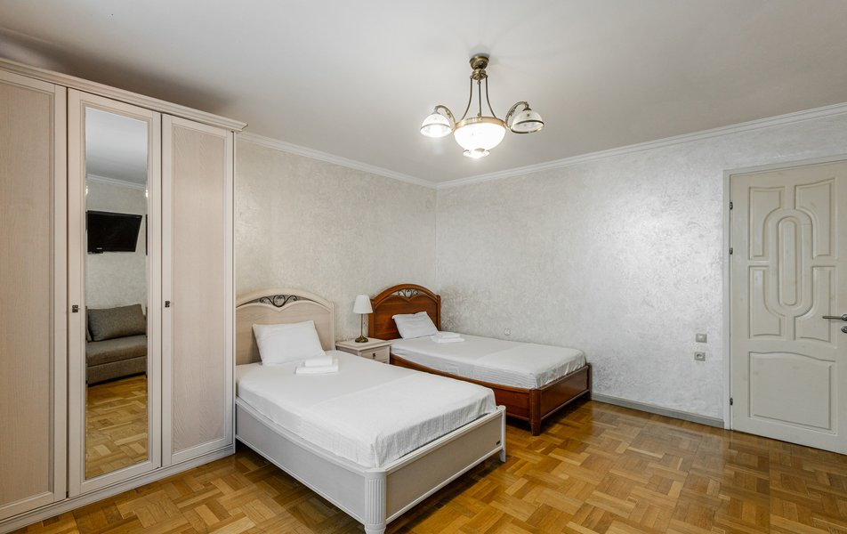 Апартаменты 7-местный 2-уровневый Количество комнат: 1-комнатный Тип номера: Апартаменты Кол-во основных мест: 7 Площадь (кв. м): 80 Мебель: диван раскладной, комод, кровать двуспальная, кухонная мебель, прикроватная тумбочка, стол, столик журнальный, стулья, шкаф-купе Оборудование: гладильная доска: по запросу, духовой шкаф, кондиционер, микроволновая печь, набор посуды, плита электрическая, пылесос, стиральная машина, телевизор ЖК, утюг: по запросу, холодильник, электрочайник Санузел: 2 санузла, с душевой кабиной, туалетные принадлежности, фен Сервис: Wi-Fi бесплатно