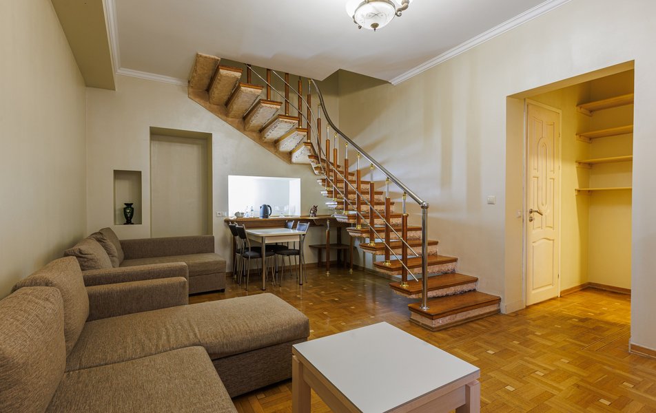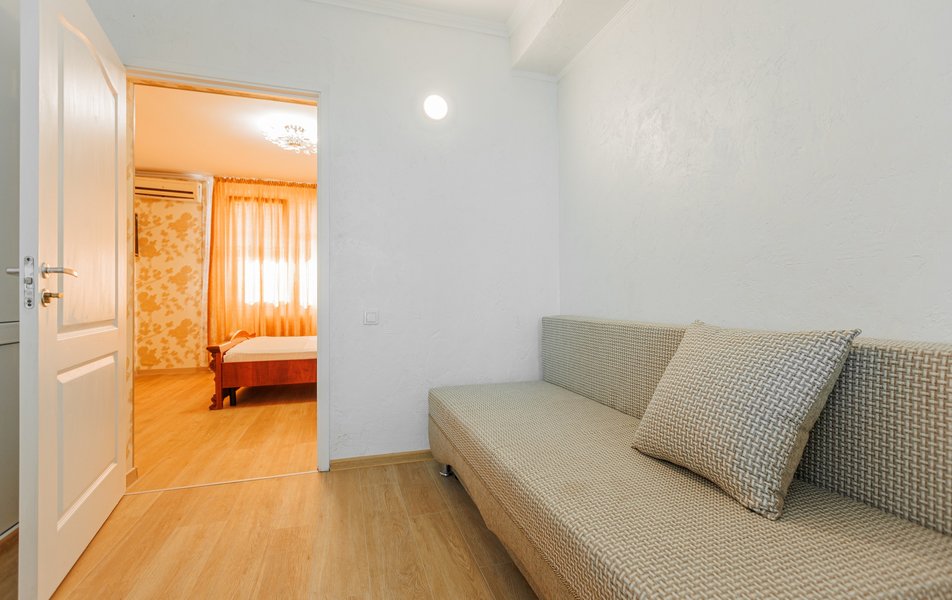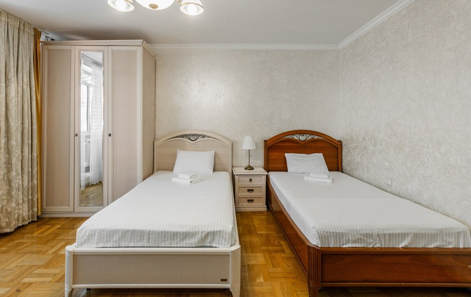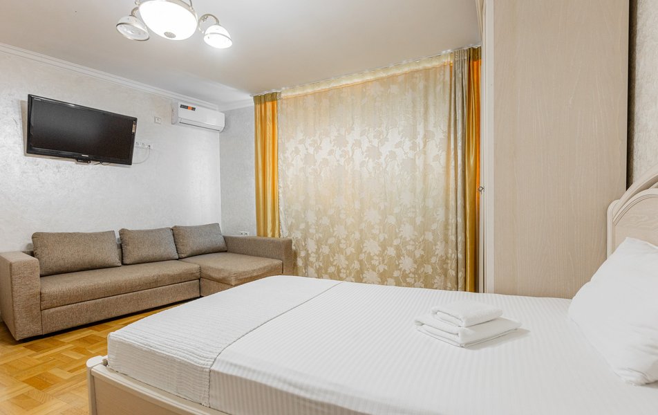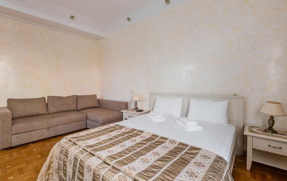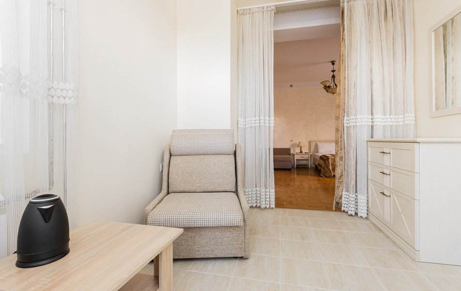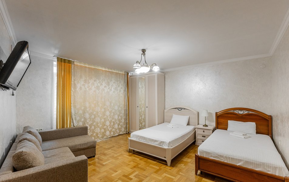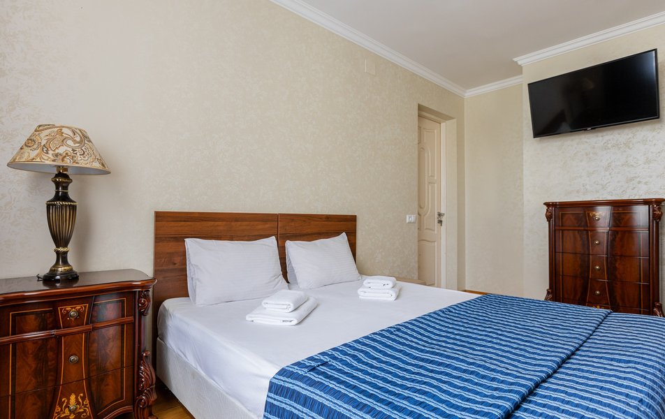 Апартаменты 7-местный 2-уровневый Количество комнат: 1-комнатный Тип номера: Апартаменты Кол-во основных мест: 7 Площадь (кв. м): 80 Мебель: диван раскладной, комод, кровать двуспальная, кухонная мебель, прикроватная тумбочка, стол, столик журнальный, стулья, шкаф-купе Оборудование: гладильная доска: по запросу, духовой шкаф, кондиционер, микроволновая печь, набор посуды, плита электрическая, пылесос, стиральная машина, телевизор ЖК, утюг: по запросу, холодильник, электрочайник Санузел: 2 санузла, с душевой кабиной, туалетные принадлежности, фен Сервис: Wi-Fi бесплатно