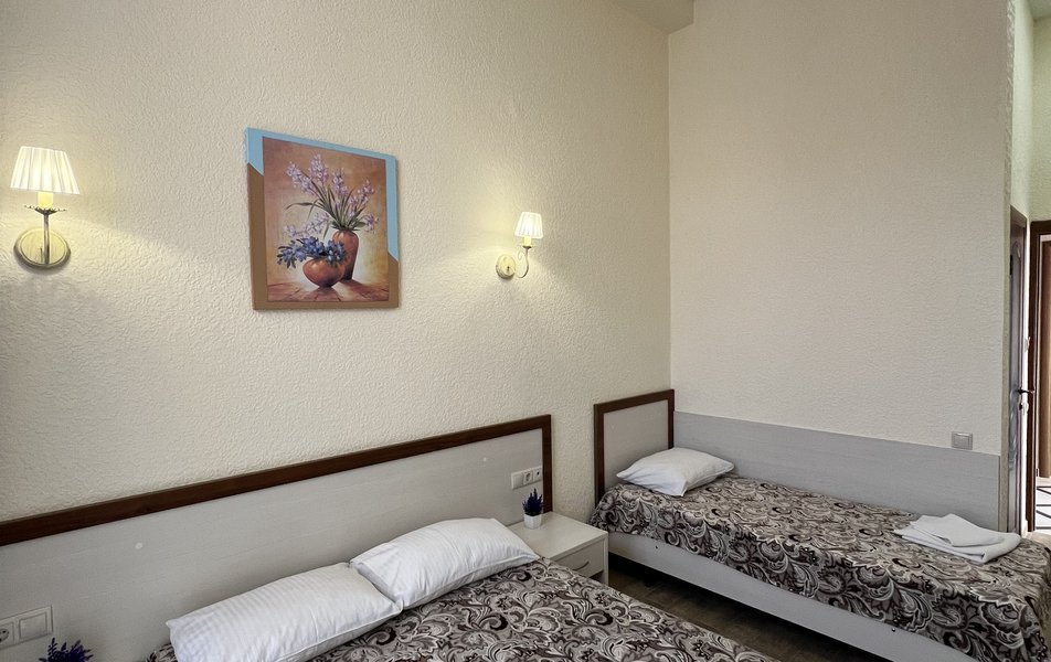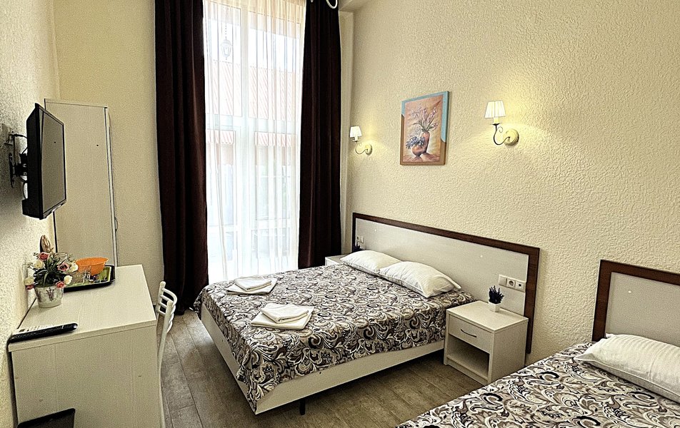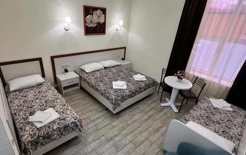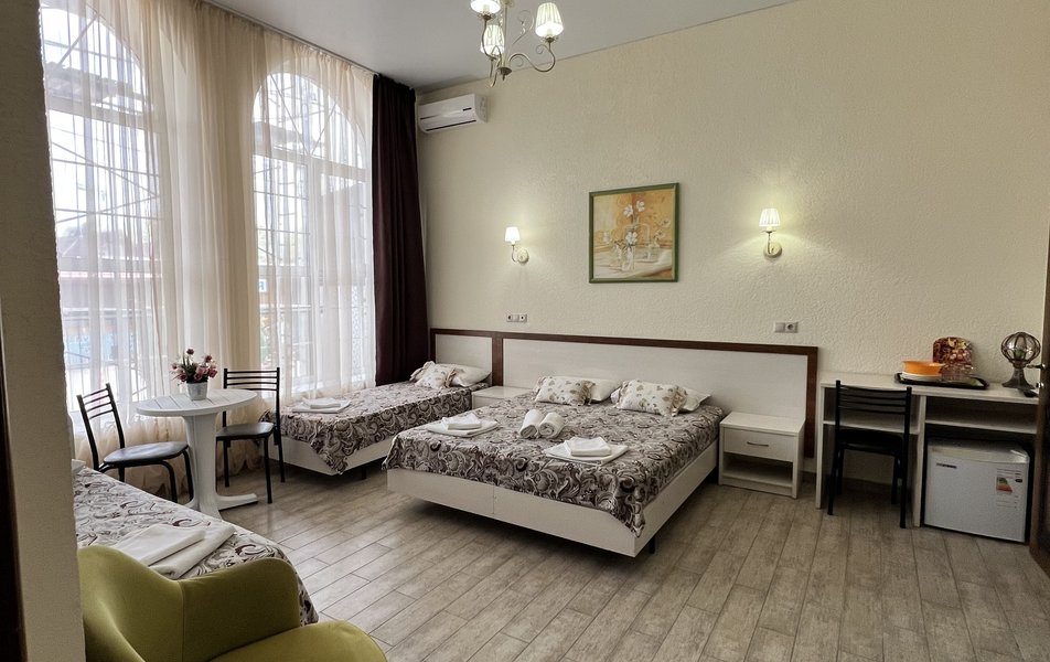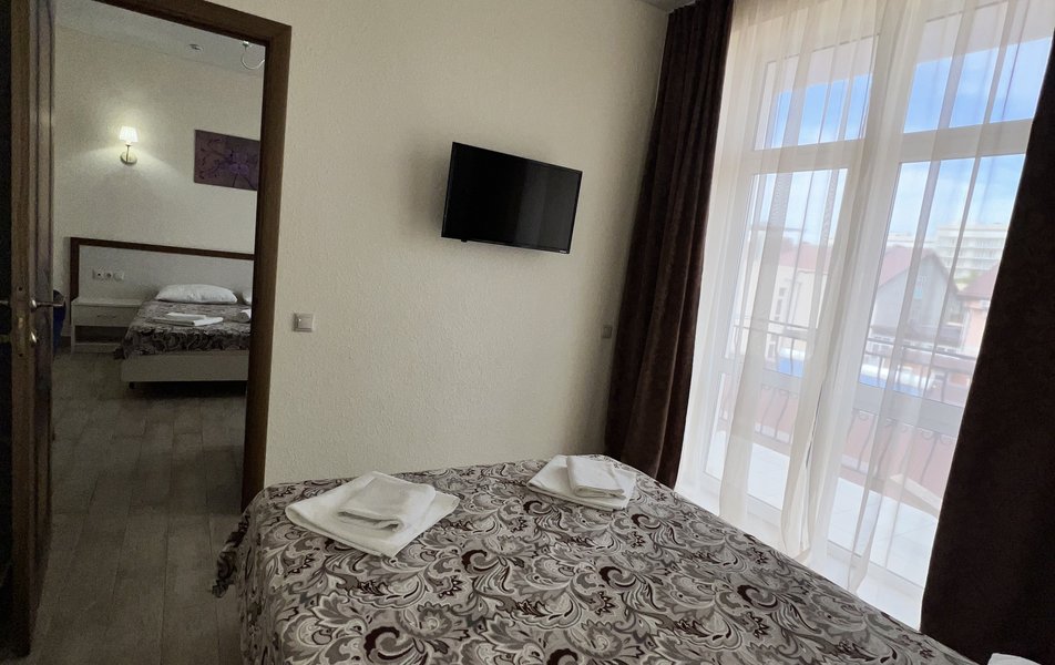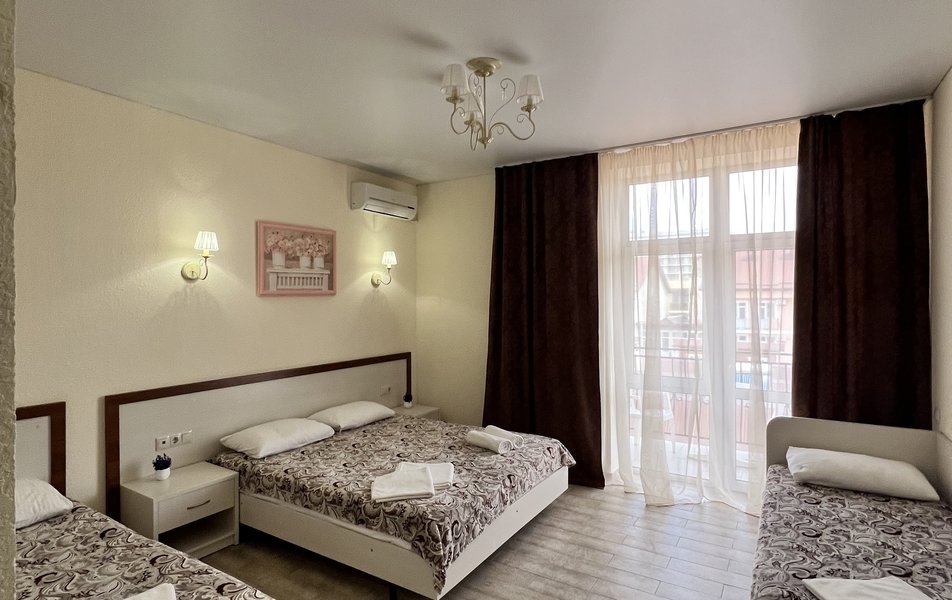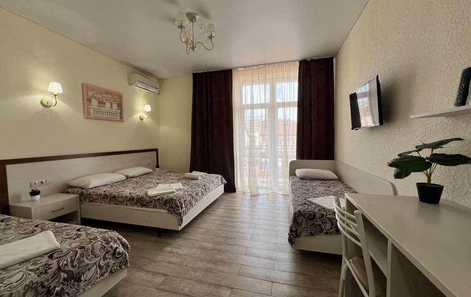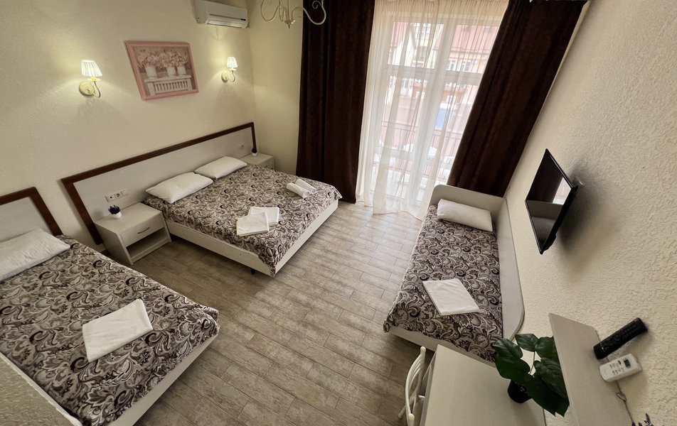 Комфорт 4-местный (с балконом) Количество комнат: 1-комнатный Тип номера: Комфорт Кол-во основных мест: 4 Площадь (кв. м): 24 Балкон: с мебелью Мебель: вешалка, зеркало, кровати односпальные, кровать двуспальная, прикроватные тумбочки, стол, стулья, шкаф Оборудование: мини-холодильник, сплит-система, телевизор Санузел: с душем, фен Сервис: Wi-Fi бесплатно, смена полотенец: 1 раз в 3 дня, смена постельного белья: 1 раз в 4 дня, уборка номера: 1 раз в 3 дня