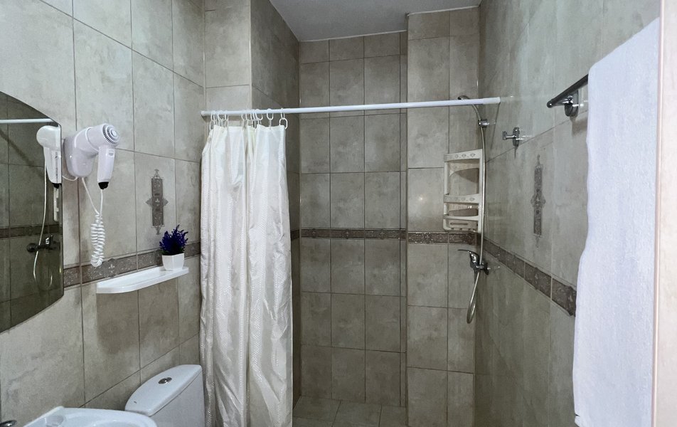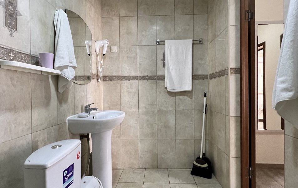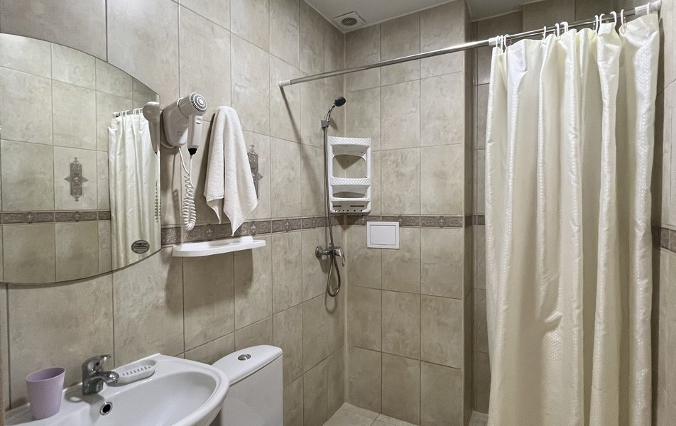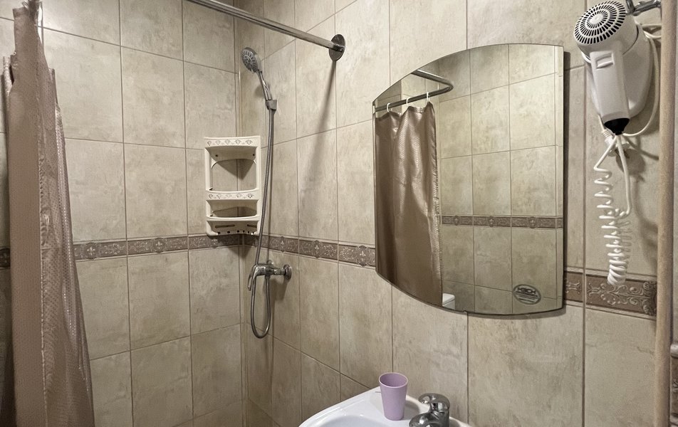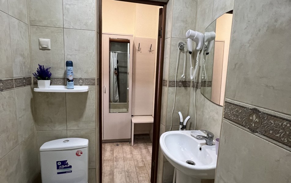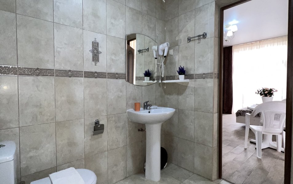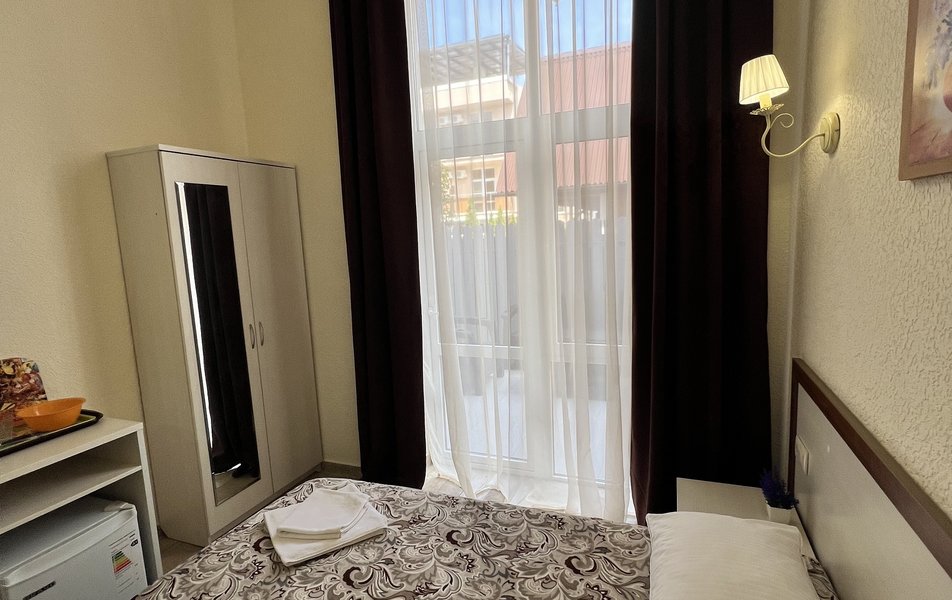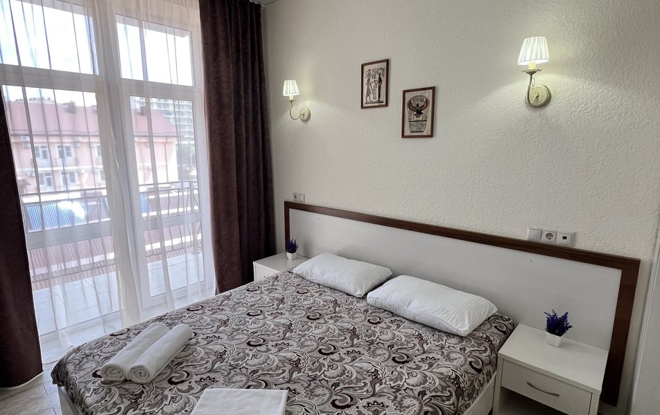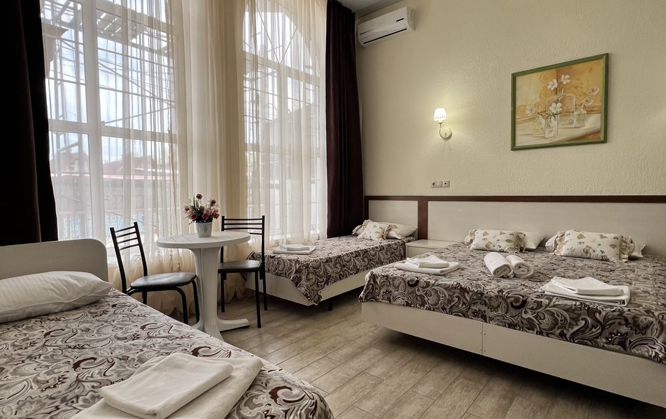 Комфорт 4-местный (с балконом) Количество комнат: 1-комнатный Тип номера: Комфорт Кол-во основных мест: 4 Площадь (кв. м): 24 Балкон: с мебелью Мебель: вешалка, зеркало, кровати односпальные, кровать двуспальная, прикроватные тумбочки, стол, стулья, шкаф Оборудование: мини-холодильник, сплит-система, телевизор Санузел: с душем, фен Сервис: Wi-Fi бесплатно, смена полотенец: 1 раз в 3 дня, смена постельного белья: 1 раз в 4 дня, уборка номера: 1 раз в 3 дня
