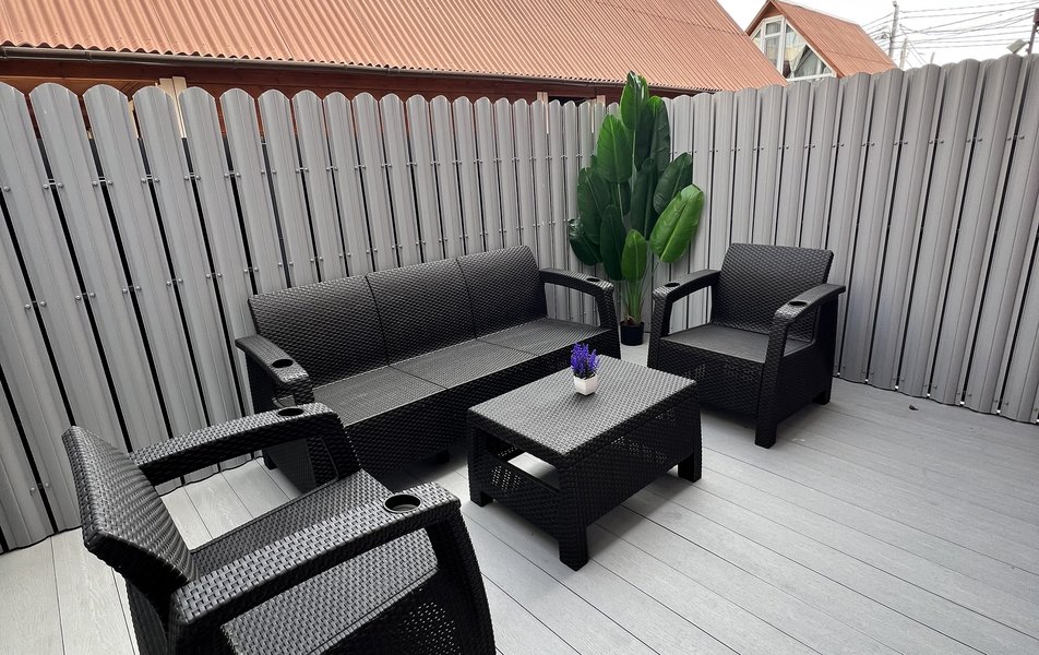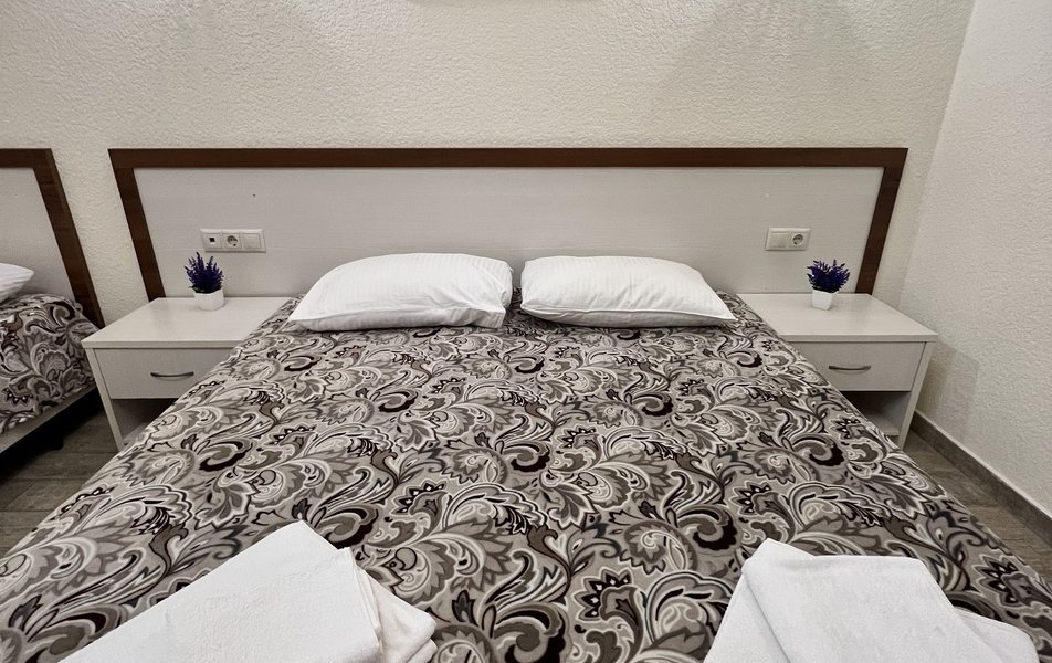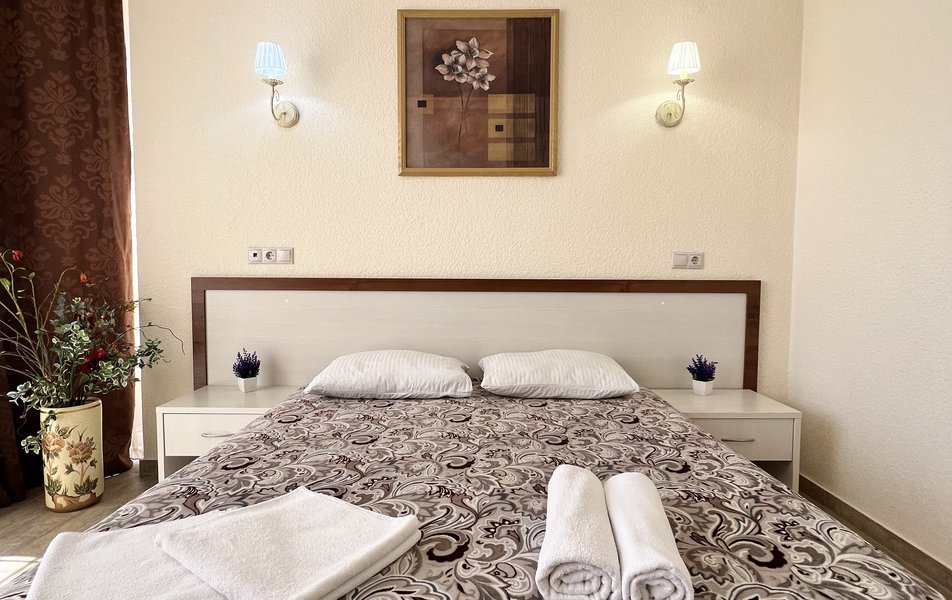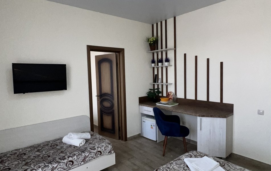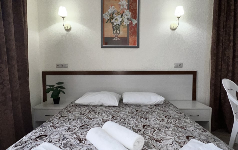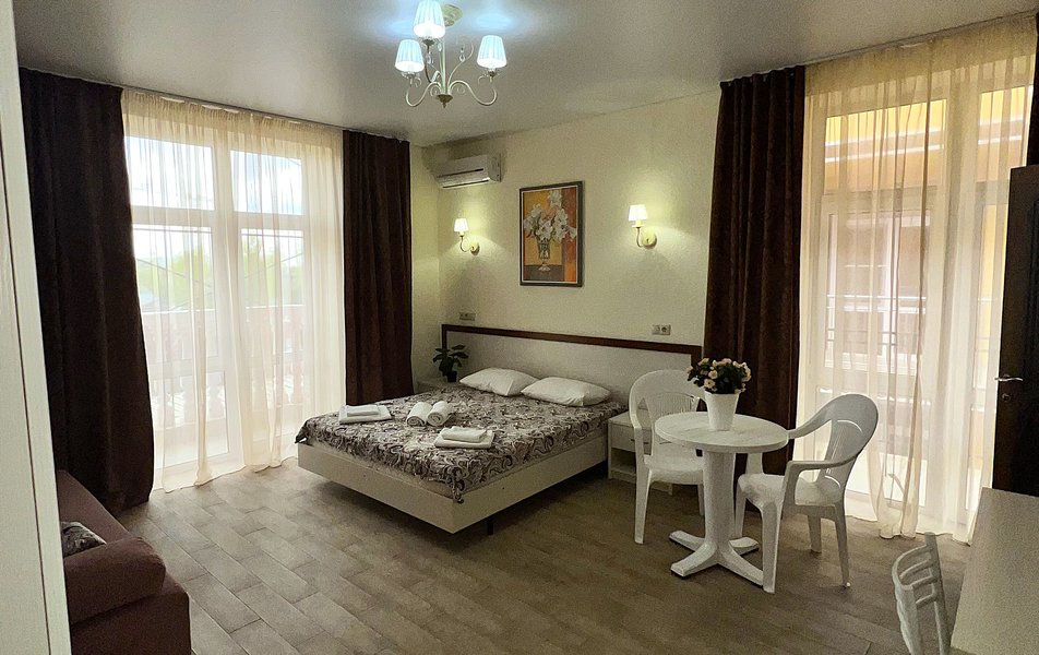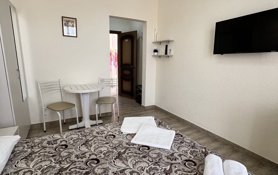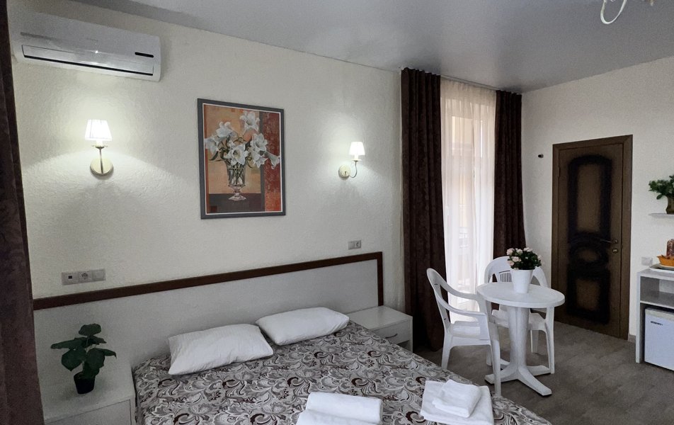 Комфорт 4-местный (с террасой) Количество комнат: 1-комнатный Тип номера: Комфорт Кол-во основных мест: 4 Площадь (кв. м): 40 Мебель: вешалка, зеркало, кровать двуспальная: 2, прикроватные тумбочки, стол, стулья, шкаф Оборудование: мини-холодильник, сплит-система, телевизор Санузел: с душем, фен Сервис: Wi-Fi бесплатно, смена полотенец: 1 раз в 3 дня, смена постельного белья: 1 раз в 4 дня, уборка номера: 1 раз в 3 дня Терраса: оборудована мебелью