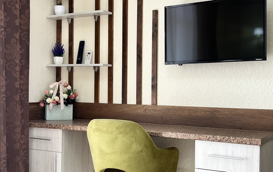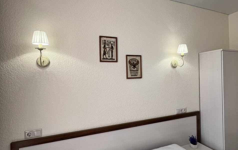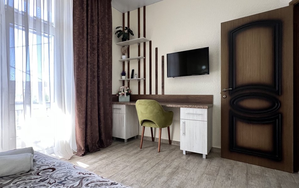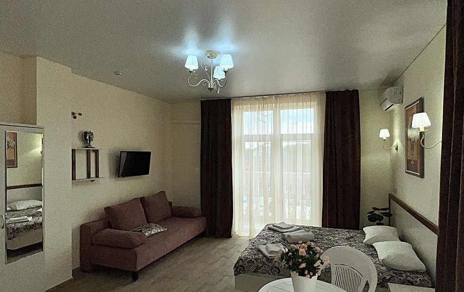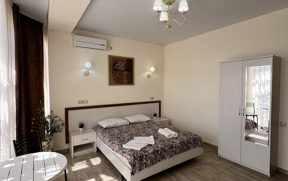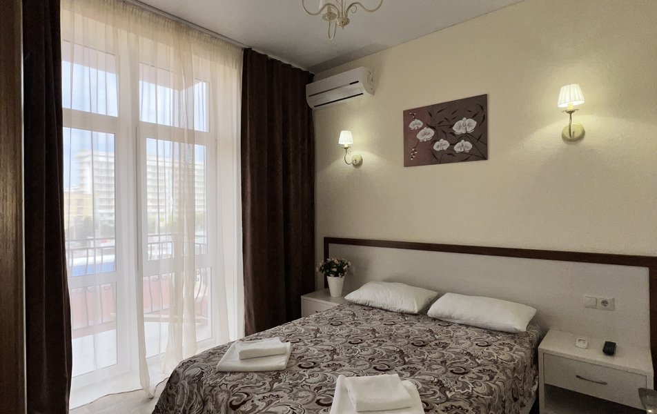 Делюкс 4-местный (с балконом) Количество комнат: 1-комнатный Тип номера: Делюкс Кол-во основных мест: 4 Балкон: с мебелью Мебель: вешалка, диван раскладной, зеркало, кровать двуспальная, прикроватные тумбочки, стол, стулья, шкаф Оборудование: мини-холодильник, сплит-система, телевизор Санузел: с душем, фен Сервис: Wi-Fi бесплатно, смена полотенец: 1 раз в 3 дня, смена постельного белья: 1 раз в 4 дня, уборка номера: 1 раз в 3 дня