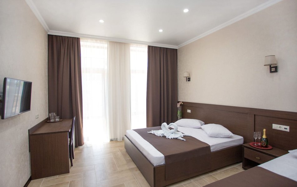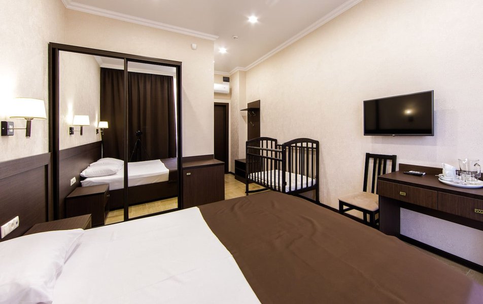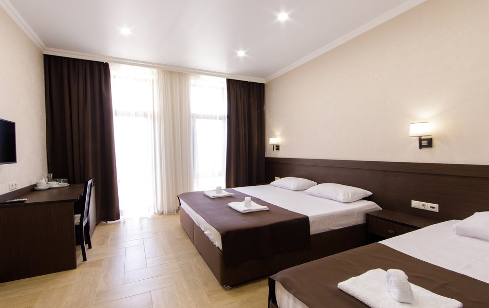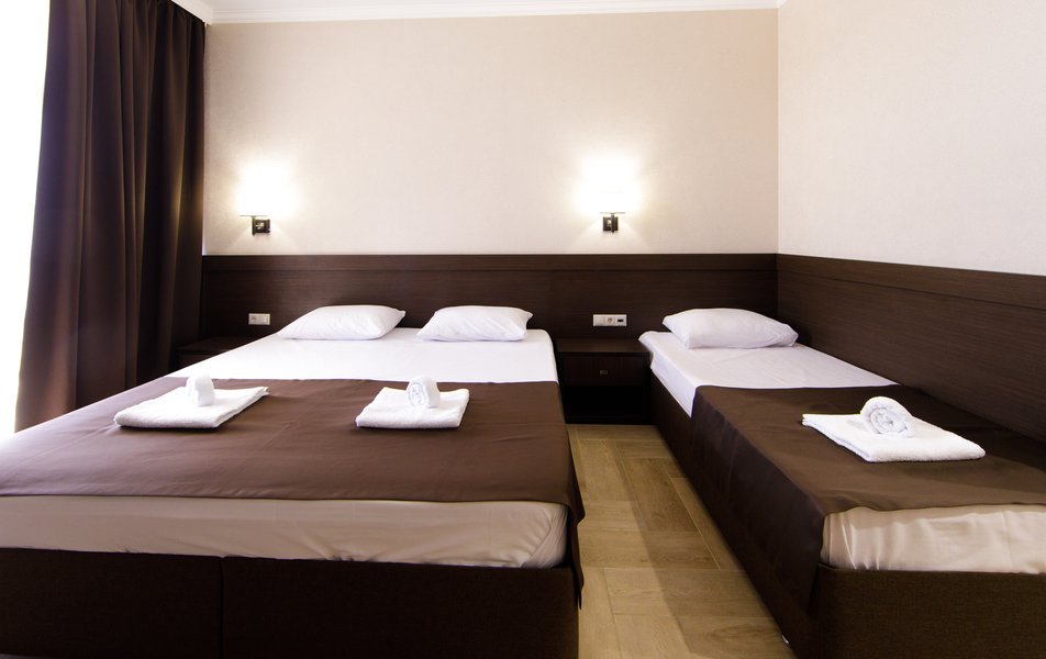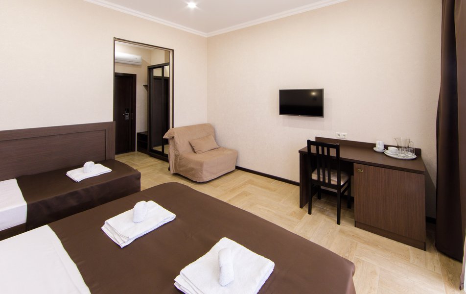 Стандартный 3-местный Количество комнат: 1-комнатный Тип номера: Стандартный Кол-во основных мест: 3 Площадь (кв. м): 25 Мебель: вешалка, зеркало, кровать двуспальная, кровать односпальная, прикроватные тумбочки, стол, стулья, шкаф Оборудование: мини-холодильник, сплит-система, телевизор Санузел: с душем, туалетные принадлежности, фен Сервис: Wi-Fi бесплатно, смена полотенец, смена постельного белья, уборка номера