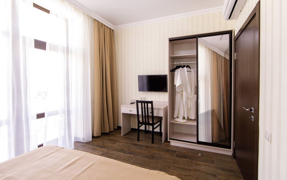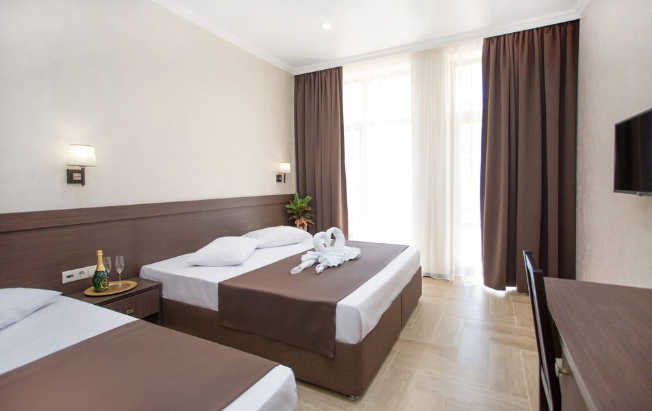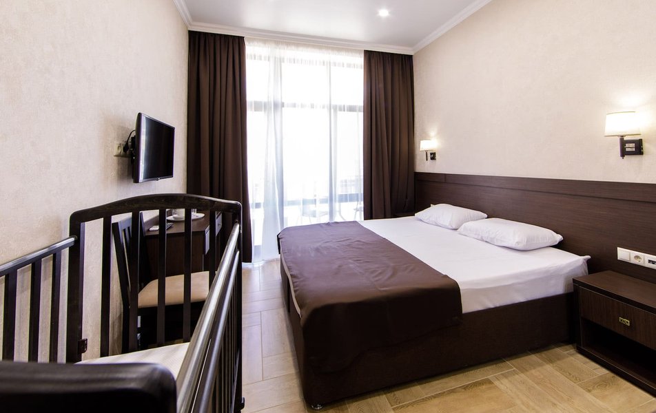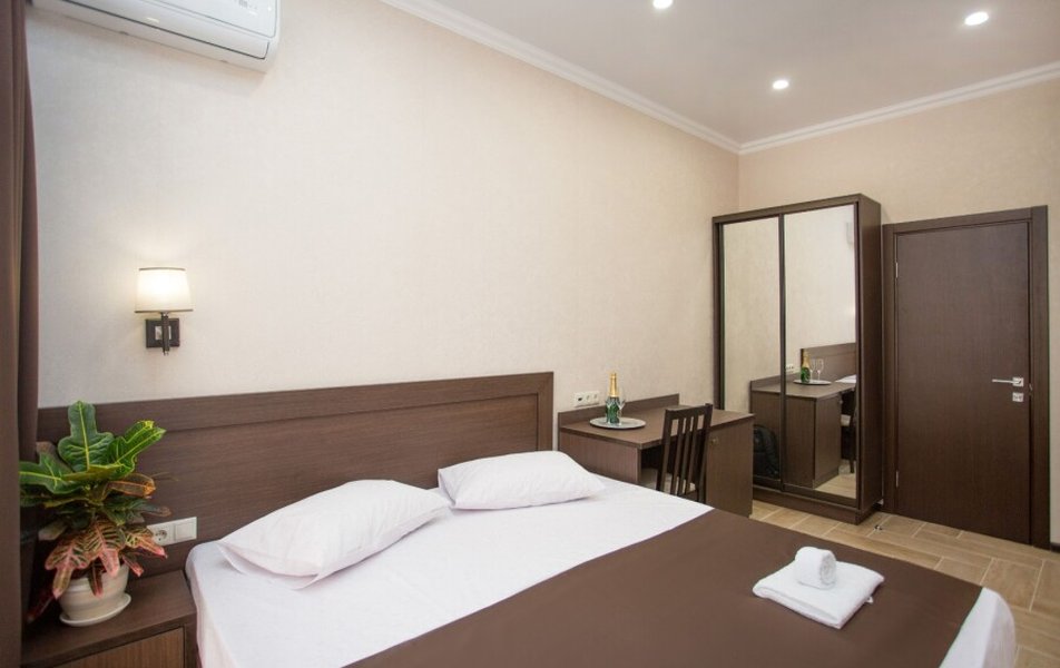 Стандартный 2-местный Количество комнат: 1-комнатный Тип номера: Стандартный Кол-во основных мест: 2 Площадь (кв. м): 17 Мебель: вешалка, зеркало, кровать двуспальная, прикроватные тумбочки, стол, стулья, шкаф Оборудование: мини-холодильник, сплит-система, телевизор Санузел: с душем, туалетные принадлежности, фен Сервис: Wi-Fi бесплатно, смена полотенец, смена постельного белья, уборка номера