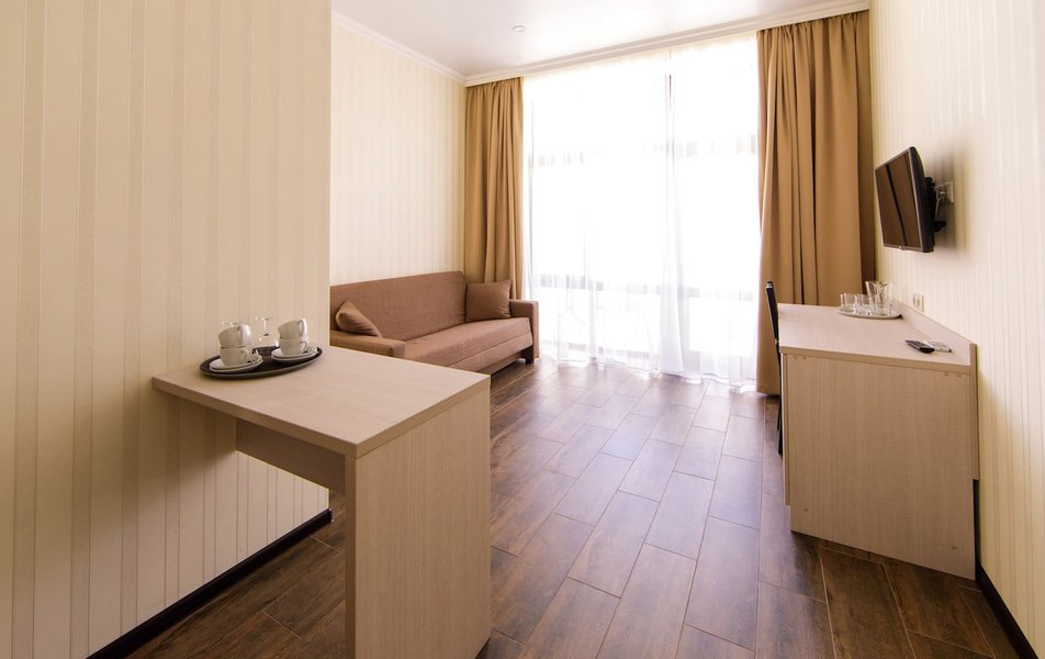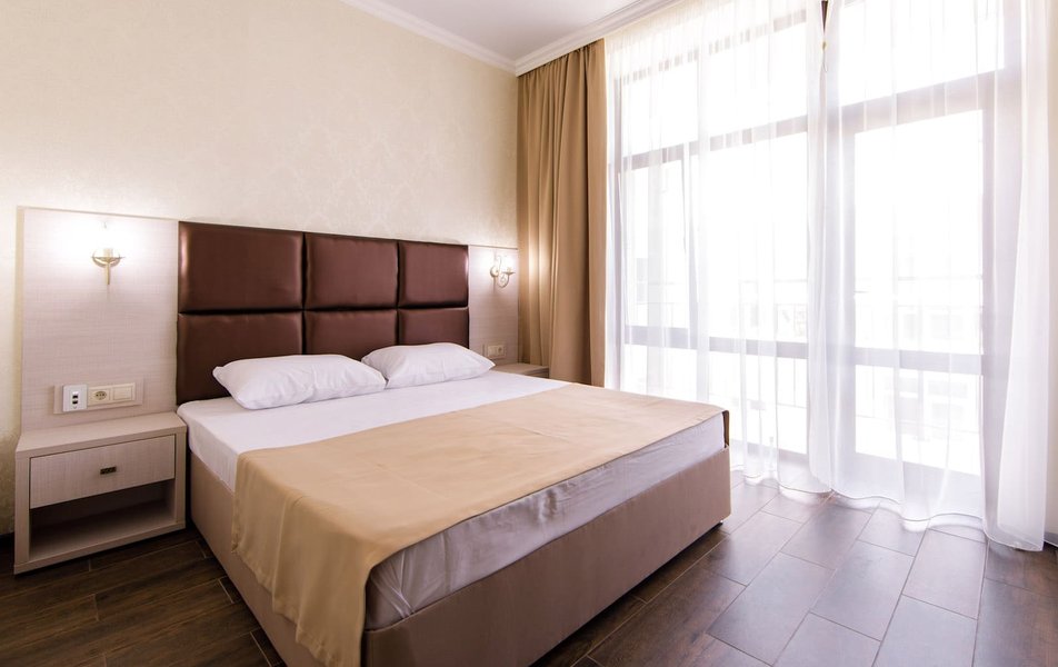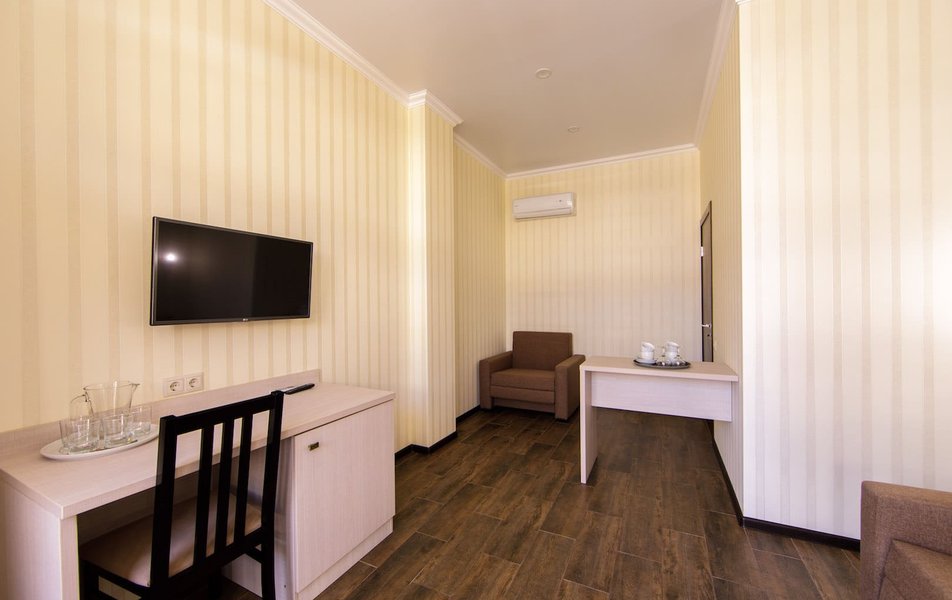 Люкс 5-местный 2-комнатный Количество комнат: 2-комнатный Тип номера: Люкс Кол-во основных мест: 5 Площадь (кв. м): 35 Мебель: вешалка, диван, кресло, кровать двуспальная, прикроватные тумбочки, стол, стулья, шкаф Оборудование: мини-холодильник, сплит-система, телевизор Санузел: с душем, тапочки, туалетные принадлежности, фен, халат Сервис: Wi-Fi бесплатно, смена полотенец, смена постельного белья, уборка номера