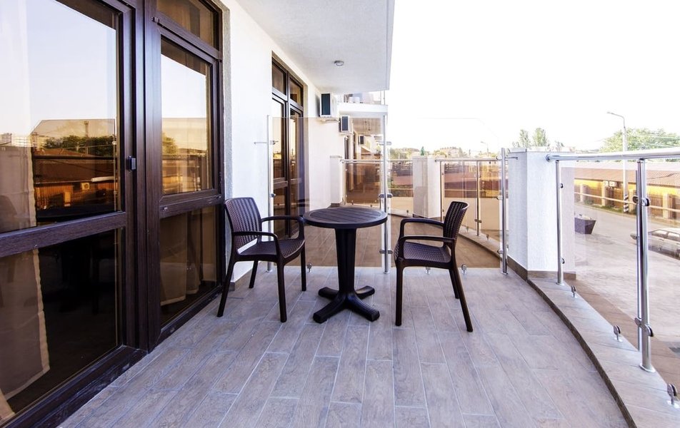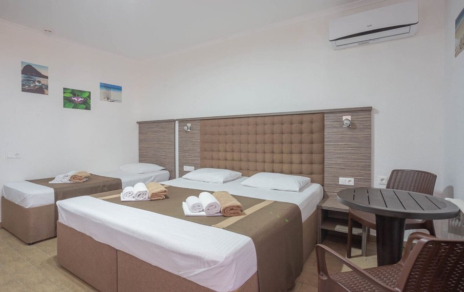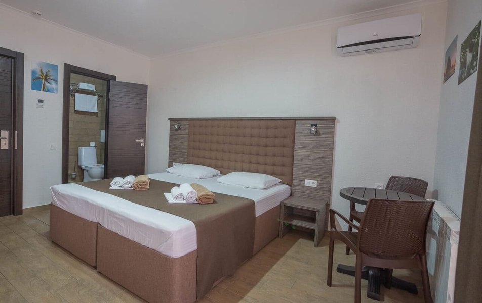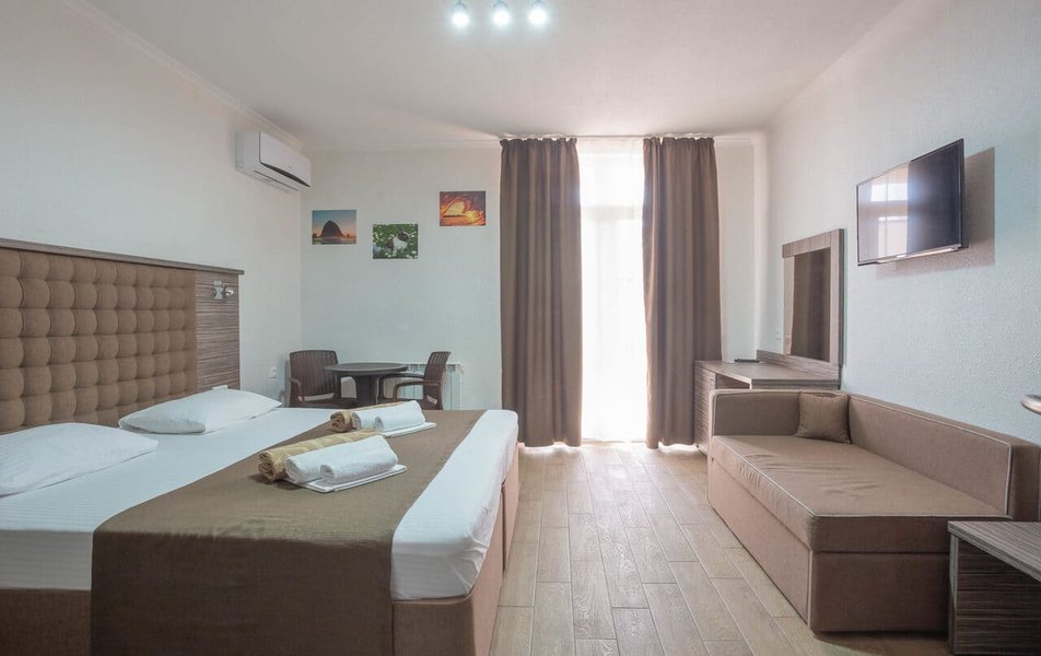 Стандартный 2-местный (частичный вид на море) Количество комнат: 1-комнатный Тип номера: Стандартный Вид из номера: на море: частичный Кол-во доп. мест: 2 Кол-во основных мест: 2 Площадь (кв. м): 21 Мебель: вешалка, диван, зеркало, кровать двуспальная, прикроватные тумбочки, стол, стулья, шкаф Оборудование: мини-холодильник, сейф, сплит-система, телевизор Санузел: с душем, туалетные принадлежности, фен Сервис: Wi-Fi бесплатно, смена полотенец, смена постельного белья, уборка номера