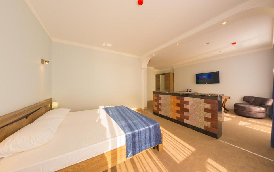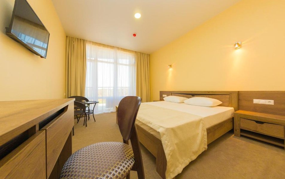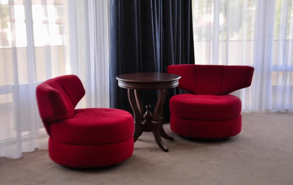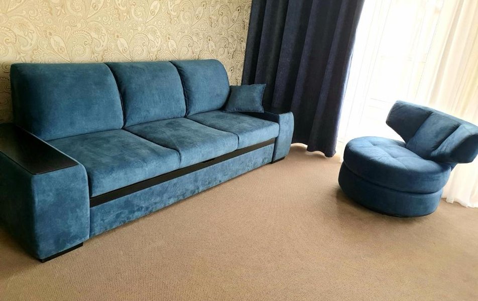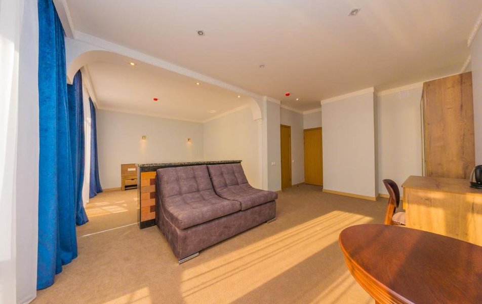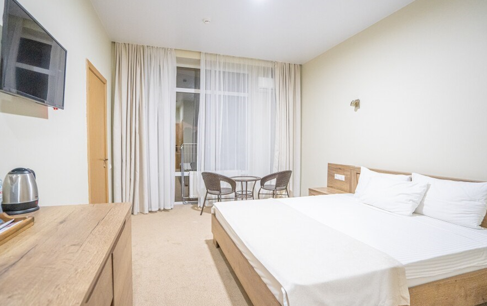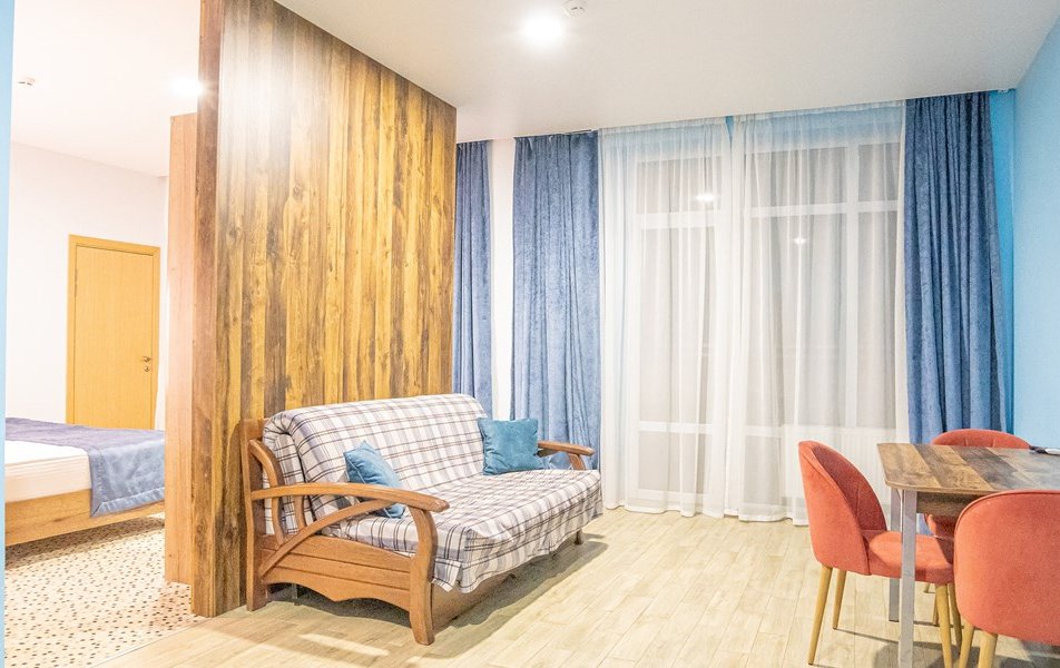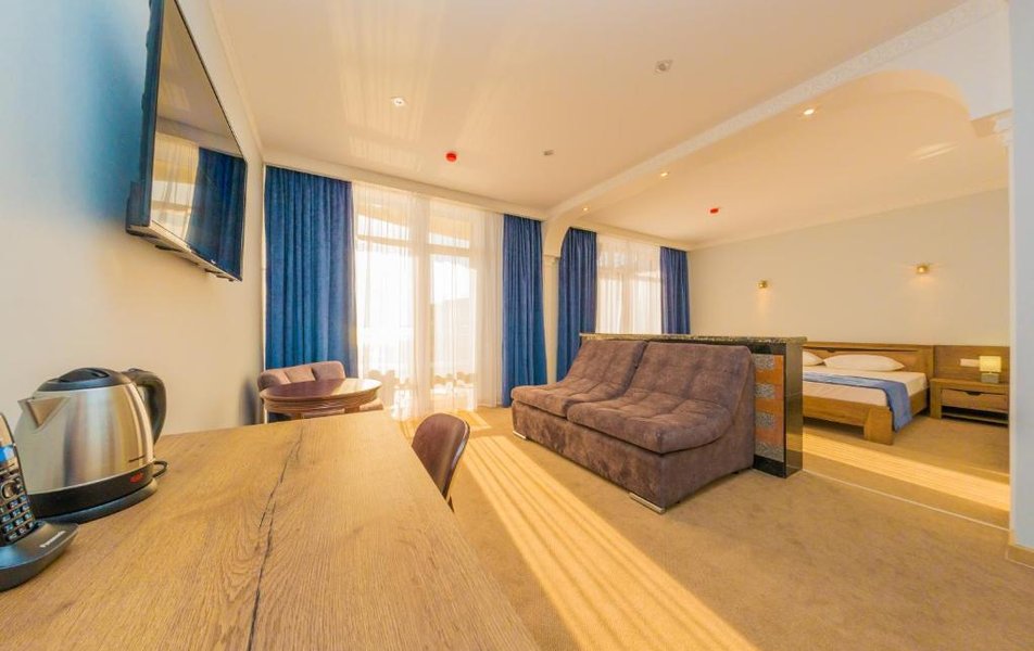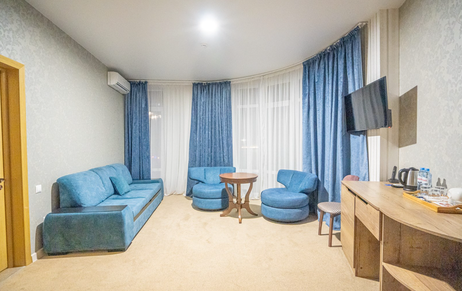Джуниор Сьют 2-местный Количество комнат: 1-комнатный Тип номера: Джуниор Сюит Дополнительное место: диван Кол-во доп. мест: 2 Кол-во основных мест: 2 Площадь (кв. м): 35 Балкон: с мебелью и сушилкой Мебель: вешалка, диван, кресло, кровать двуспальная, прикроватные тумбочки, стол, столик журнальный, стул, шкаф Оборудование: мини-холодильник, набор посуды, сплит-система, телевизор, электрочайник Санузел: с душем, туалетные принадлежности Сервис: смена полотенец, смена постельного белья, уборка номера: ежедневно