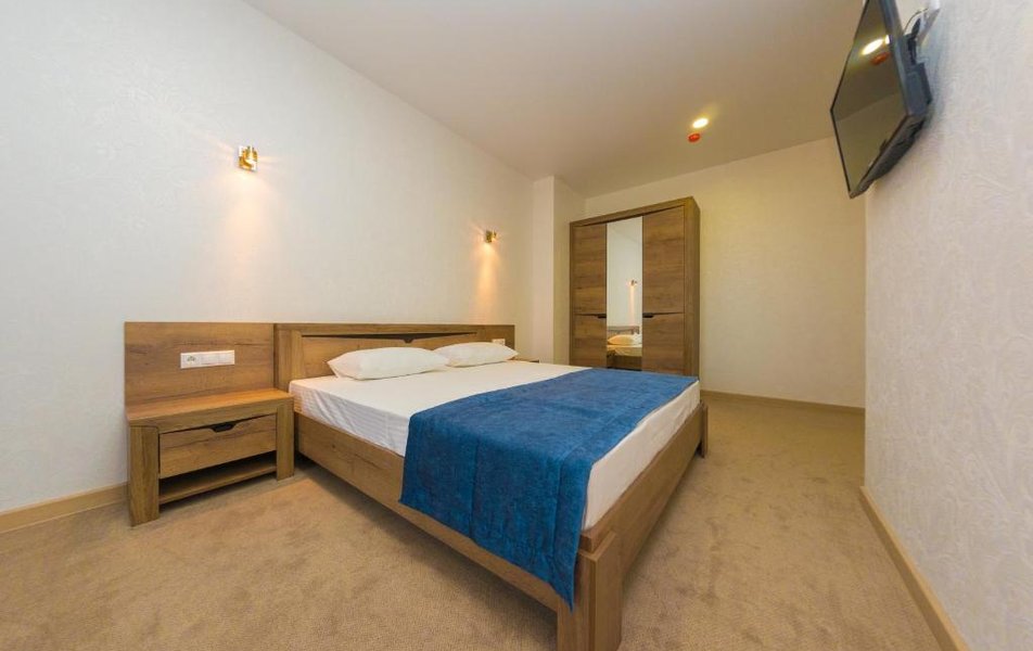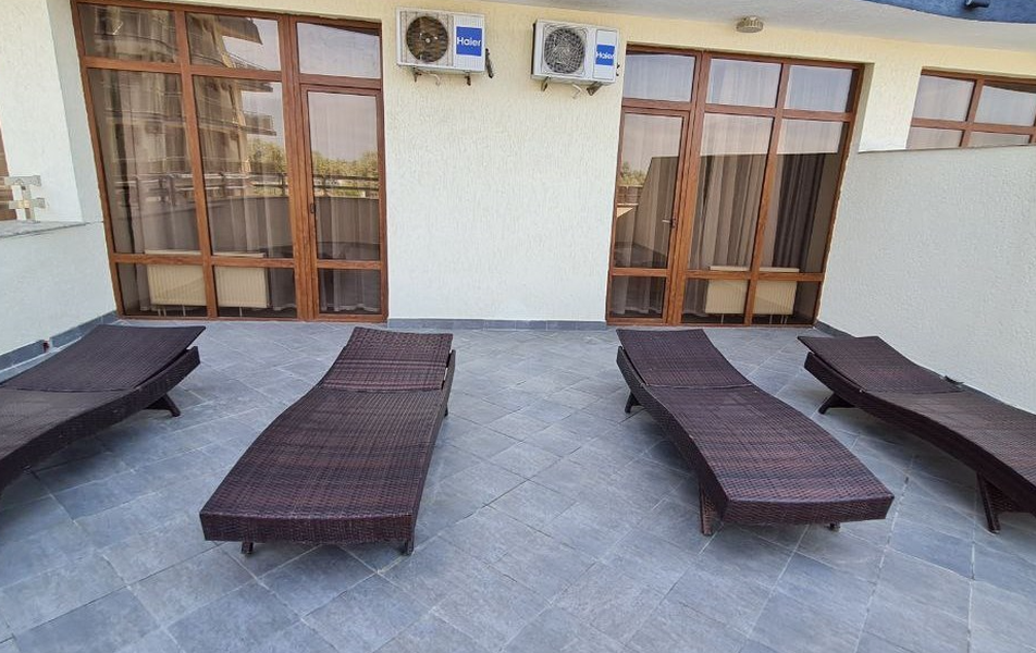 Апартаменты 2-местный 2-комнатный Sea View Количество комнат: 2-комнатный Тип номера: Апартаменты Кол-во основных мест: 6 Площадь (кв. м): 60 Мебель: вешалка, диван, зеркало, кровати односпальные, кровать двуспальная, прикроватные тумбочки, стол, стулья, шкаф Оборудование: кофемашина, микроволновая печь, набор посуды, сейф, сплит-система, телевизор, холодильник, электрочайник Санузел: с джакузи, туалетные принадлежности, фен Сервис: смена полотенец, смена постельного белья, уборка номера Терраса: оборудована мебелью