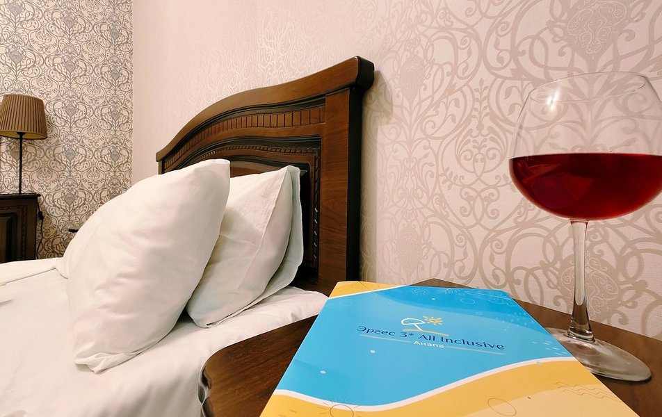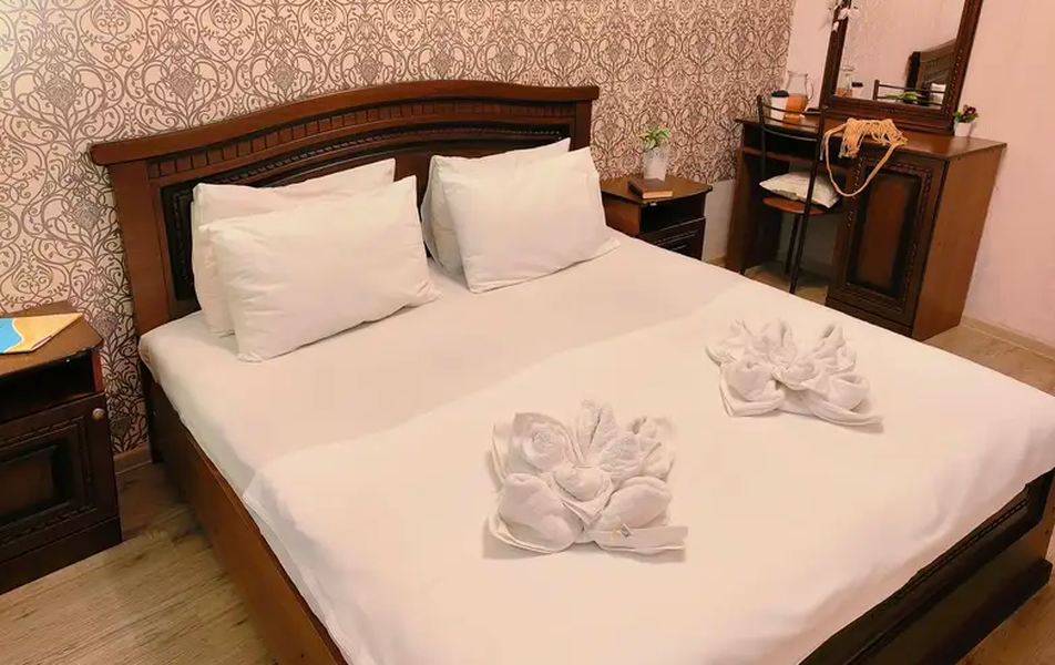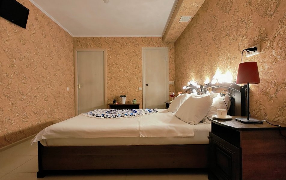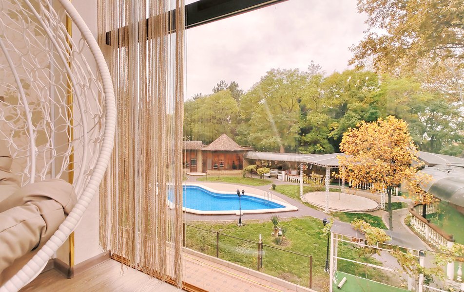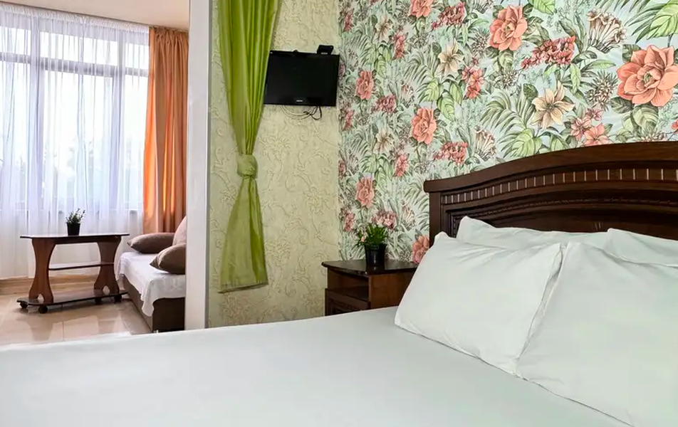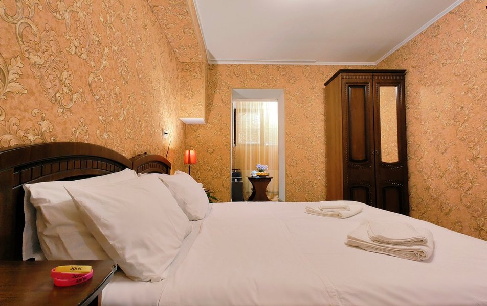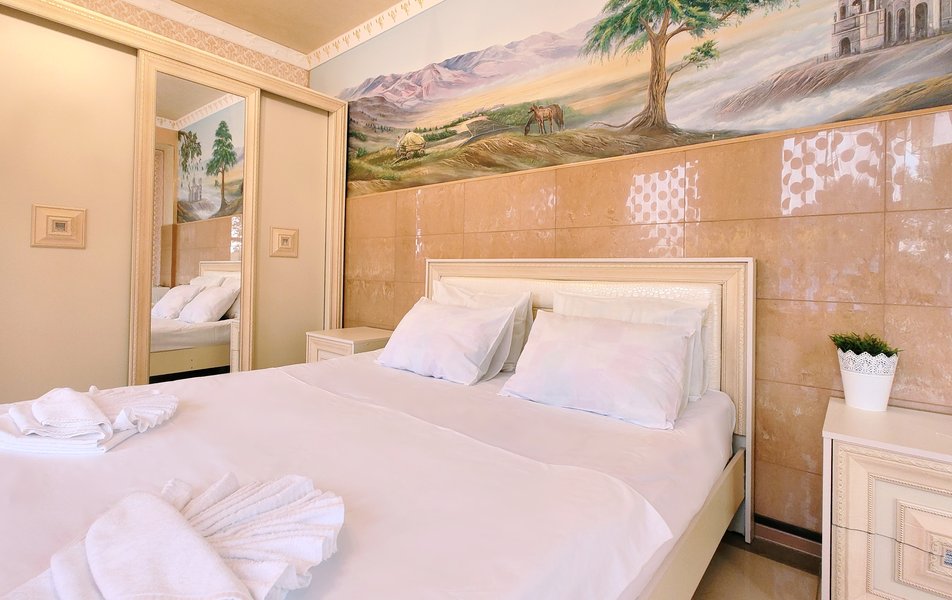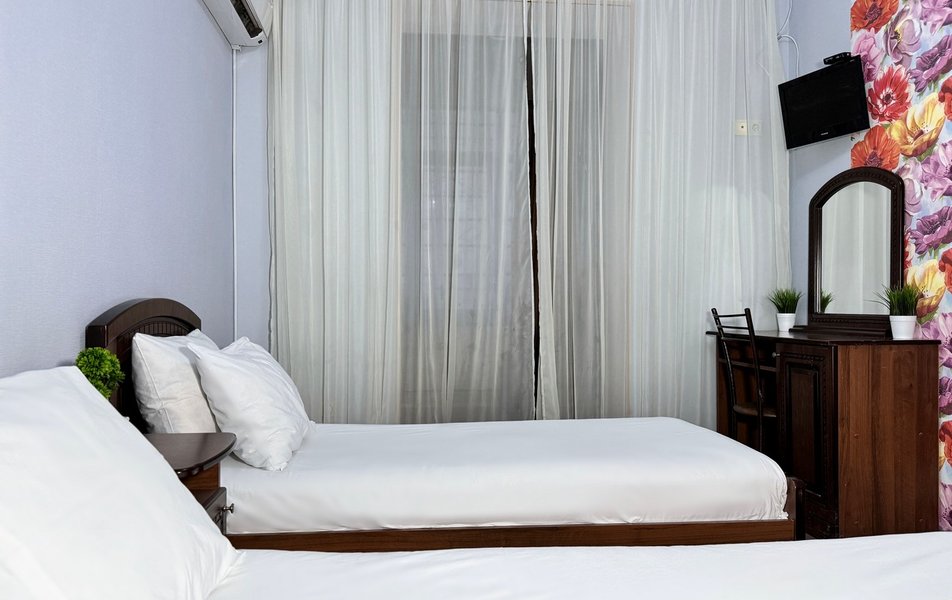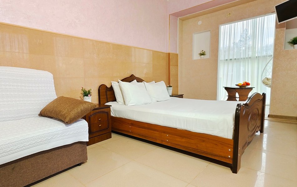 Выбирала отель, учитывая наличие 3 звёзд и системы все включено, выбрала самый дорогой номер и хочу предостеречь всех, кто вдруг почитает купленные отзывы с оценкой 5 или вдруг решит, что именно ему повезет. Так вот: не повезет! Атмосфера армянской советской селухи - начиная от персонала заканчивая обстановкой. ОЧЕНЬ ГРЯЗНО! Грязь во дворе, грязь на прибитых на столах клеенках, грязно в номере. В номере невозможно находится из-за тухлого запаха запах канализации. Обои драные, стекла заляпанные лет как 10, мебель затертая советская. Кровать это отдельная песня. Матрасы несколько слоев слипшиеся, белье затертое самое дешёвое. Еда: майонезные салаты. Взяли куриную лапшу: вода и картошка. Сосиски бумажные, овощи нарезаны как скоту. Мы больше не ели ВСЕ включено. Ходили в кафе в городе. Все было настолько грязно, что в бассейн даже не было желания идти купаться. И на весь маленький двор стоит машина хозяина) В общем и целом: очень печальное место. Так же минусом оказалось близость парка аттракционов - все крики и шум были в номере. И до моря не 50 метров, а минут 15 быстрым шагом. НЕ РЕКОМЕНДУЮ!