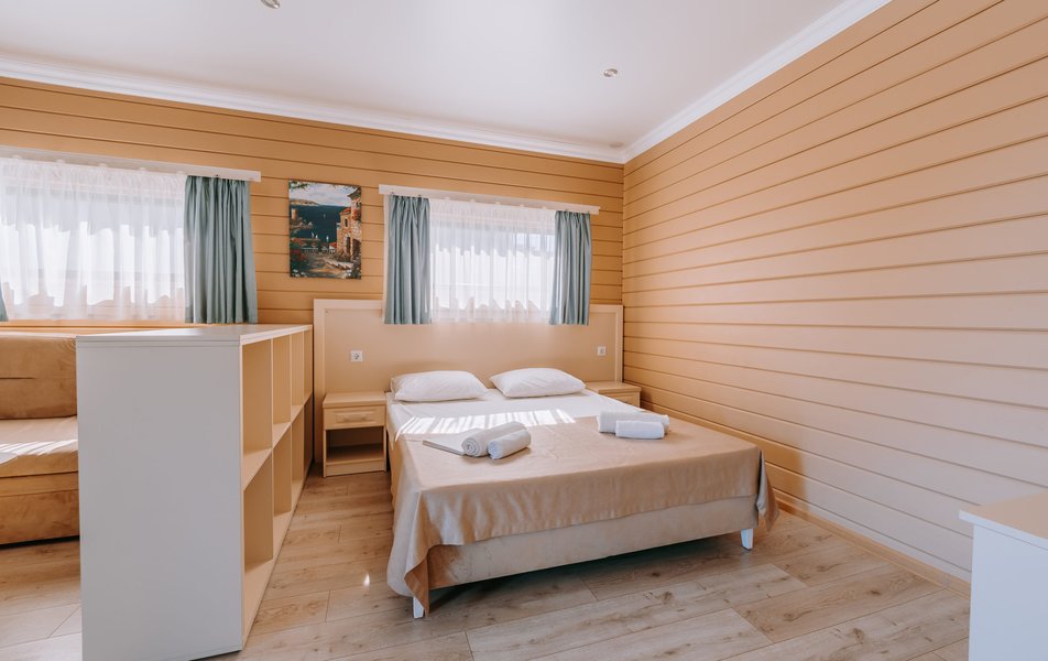 Отель на 5. Отдыхали в домике с 14 по 20 июля 2023 год, семьей 2 взрослых и дети 12 лет и 4 года. Брали всё включено. Отличный сервис, развлечения для детей и взрослых. Хороший бассейн. . Уборка комнаты каждый день. Спасибо большое персоналу, особенно Юлии которая убирала наш номер. . Питание великолепное: на выбор не сколько блюд. Первое, второе, салаты, соки. . Бассейн глубина 1.5м большой, и детский 50 см. . Аниматоры работают 3 раза в день.
