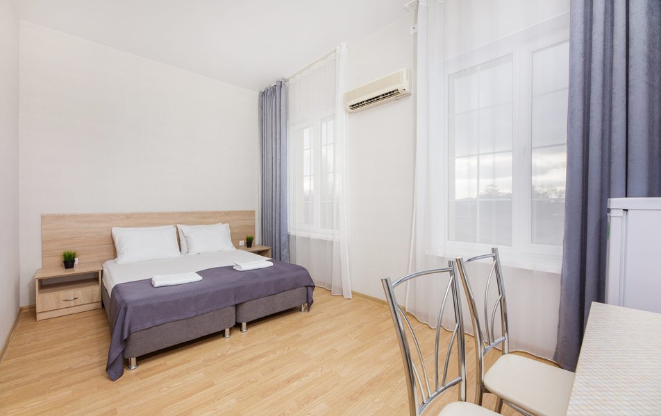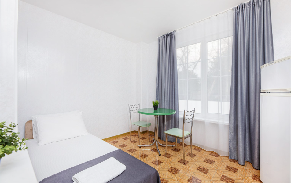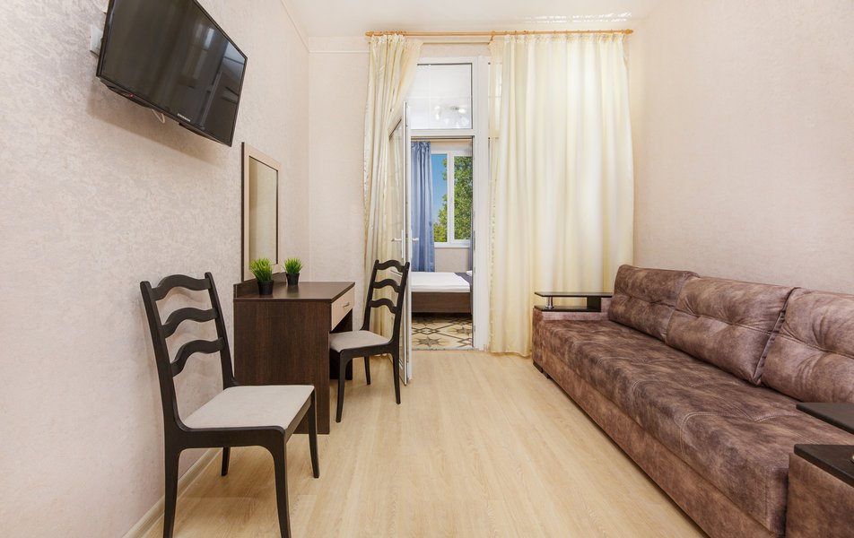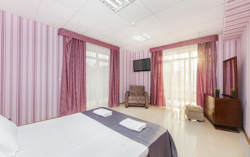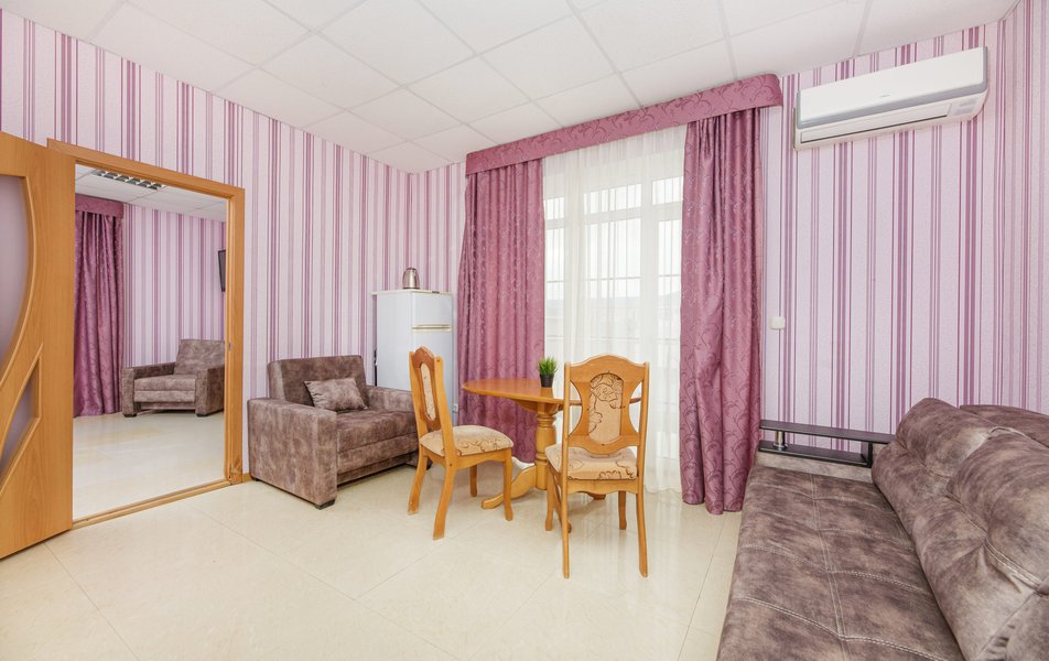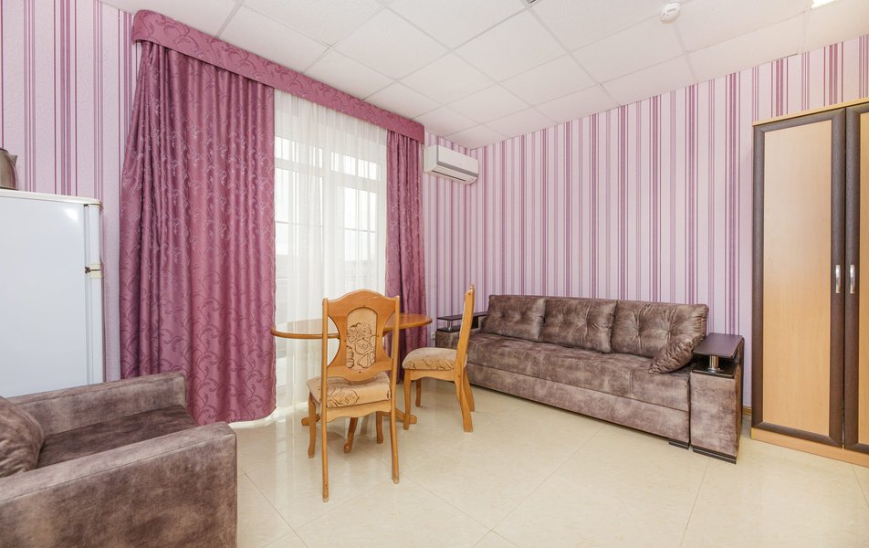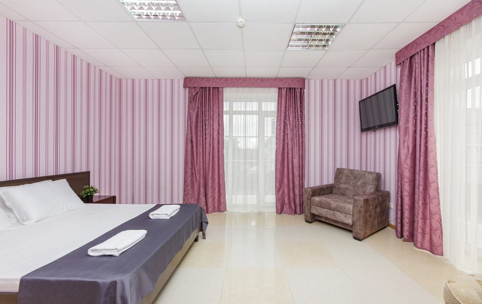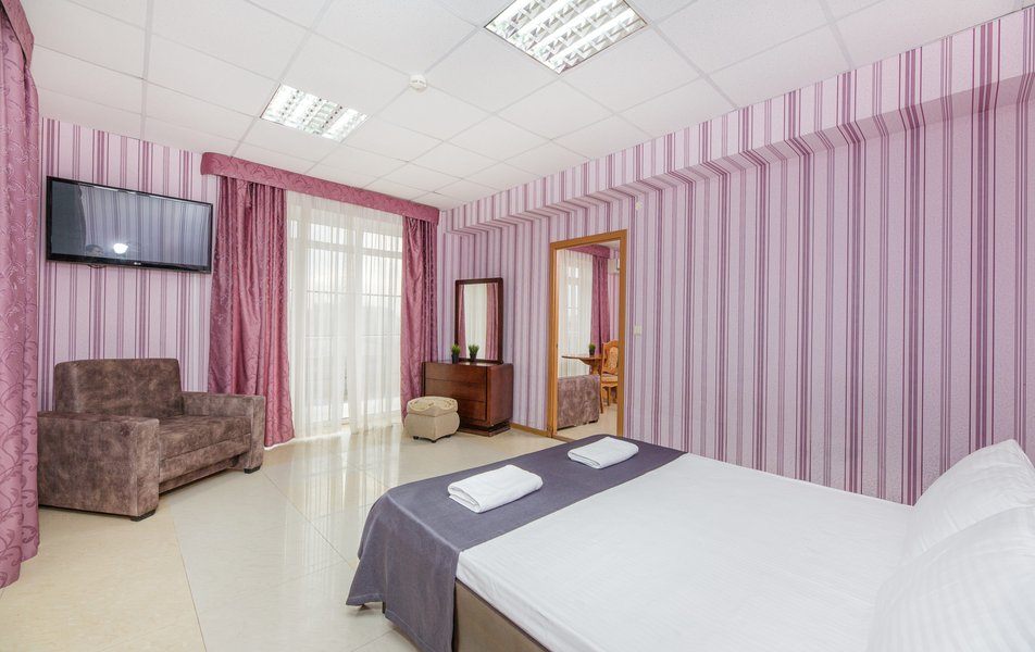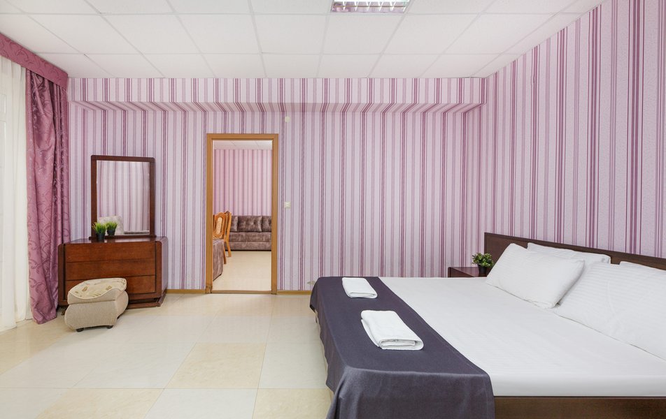 Отель выходит на Пионерский проспект, центральную улицу Джемете. Чтобы оказаться на море нужно перейти дорогу и пройти мимо торговых рядов. Дорога к морю занимает меньше 10 минут, если не задерживаться у торговых рядов. Был прекрасный одноместный номер с двуспальной кроватью, хорошо работающим кондиционером и телевизором. Балкон выходил на стену соседнего здания - это небольшой минус. Отдельно о питании. 3-разовое питание входило в путевку. Столовая находилась в цокольном этаже главного здания. За 9 дней питание было разнообразным, каждый день была новая каша, на столе стояло сгущенное молоко, джемы и другое. Все блюда были вкусные, близки к диетическим. Персонал откликался оперативно на все просьбы.