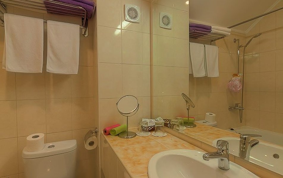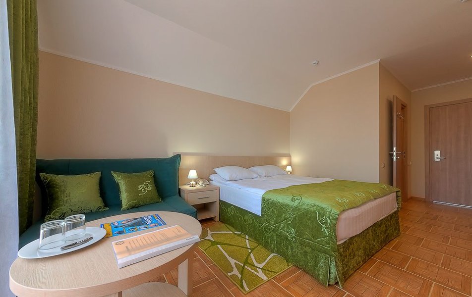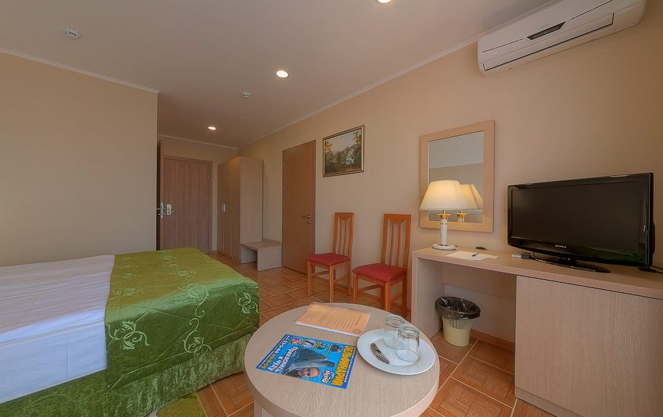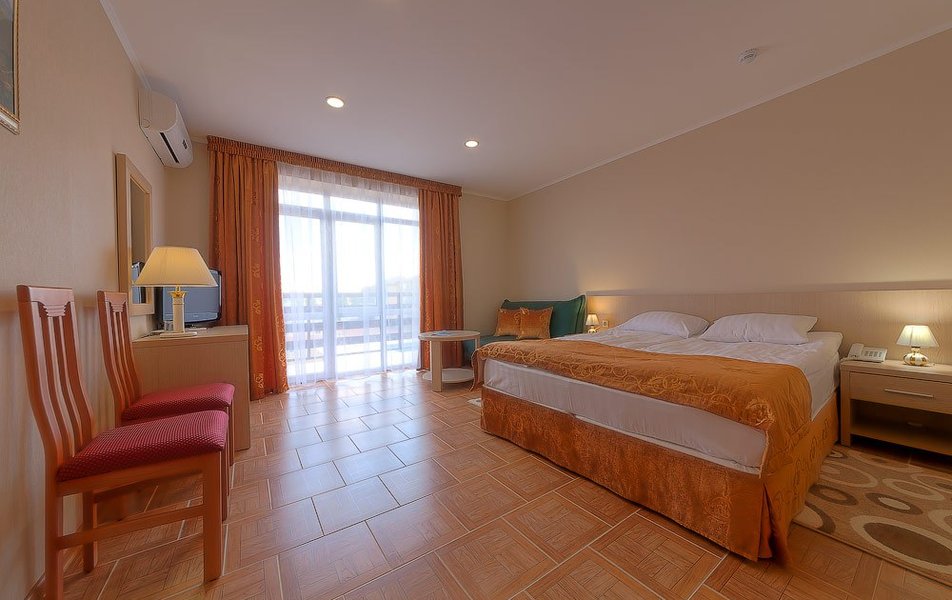 Стандартный 2-местный Тип номера: Стандартный Дополнительное место: еврораскладушка Кол-во доп. мест: 1 Кол-во номеров: 50 Кол-во основных мест: 2 Корпус: 1 Площадь (кв. м): 18-22 Балкон: с мебелью и сушилкой Мебель: вешалка, зеркало, кровать двуспальная, прикроватные тумбочки, стол, стулья, шкаф Оборудование: мини-холодильник, набор посуды, пляжные полотенца, сейф, сплит-система, телевизор ЖК, телефон Санузел: с ванной, туалетные принадлежности Сервис: смена полотенец, смена постельного белья, уборка номера, услуги внутренней телефонной связи