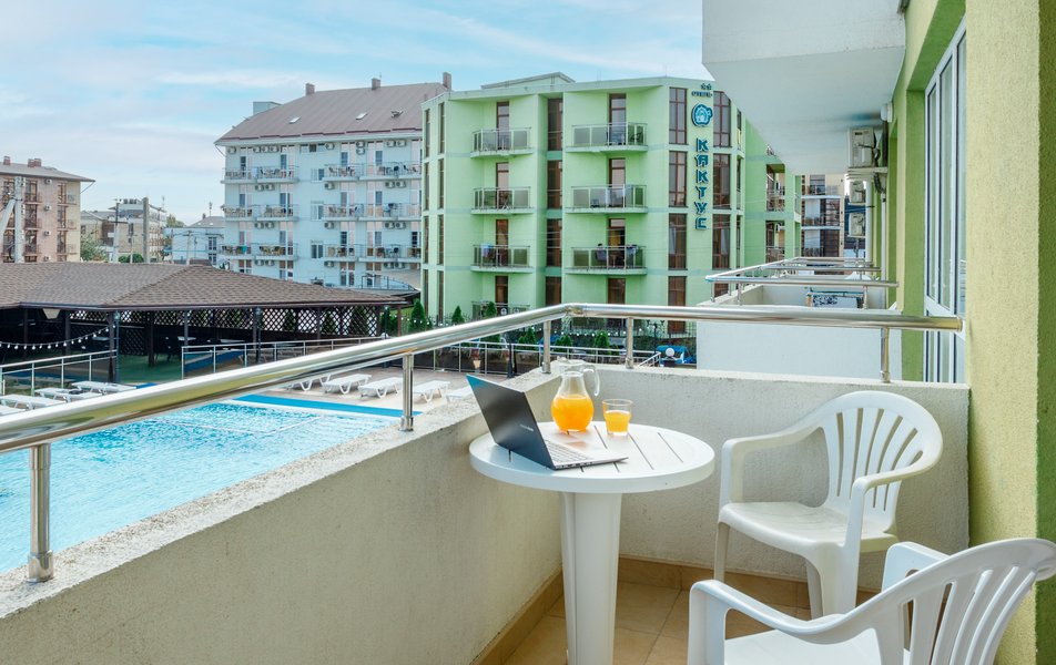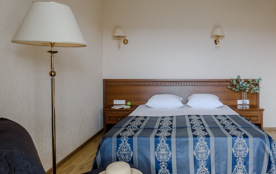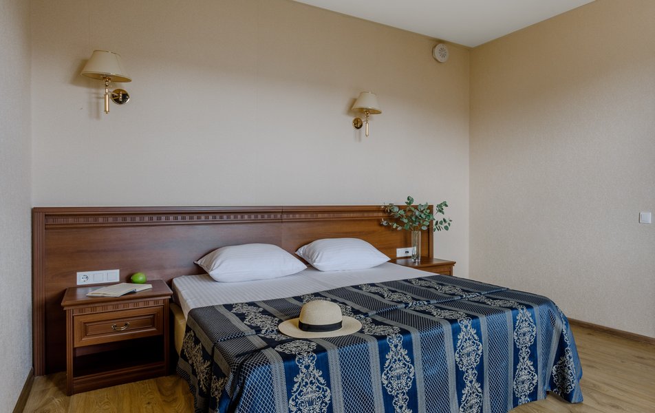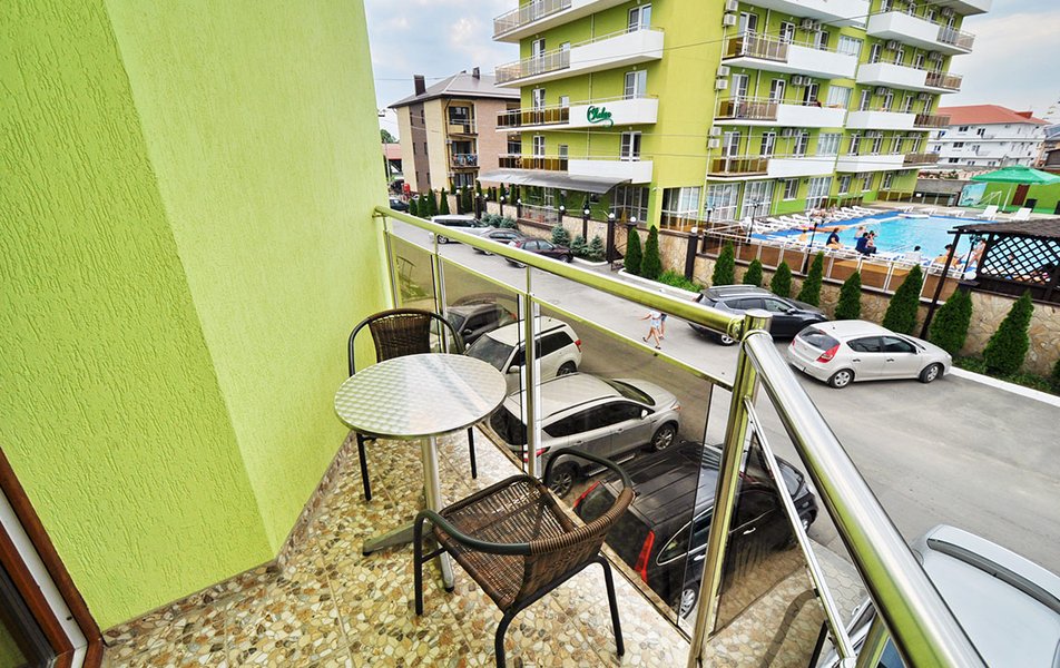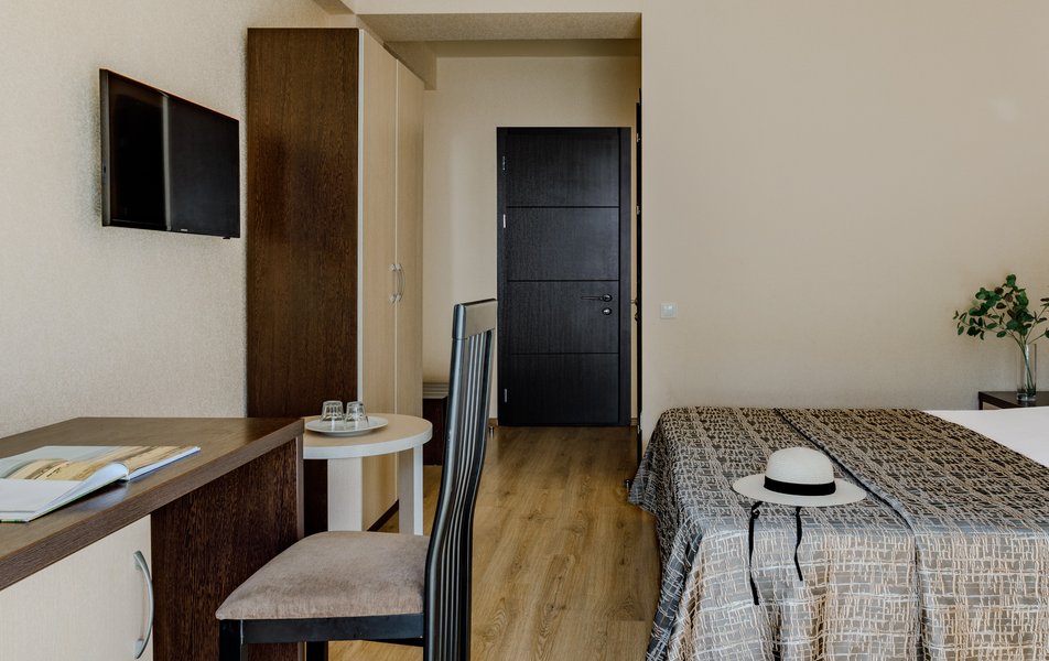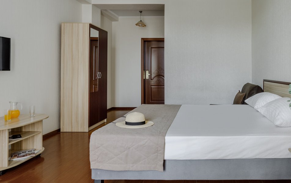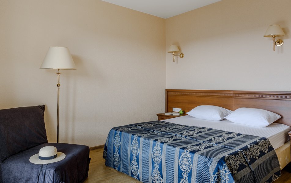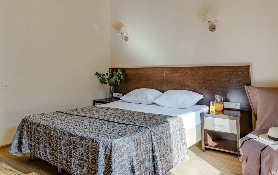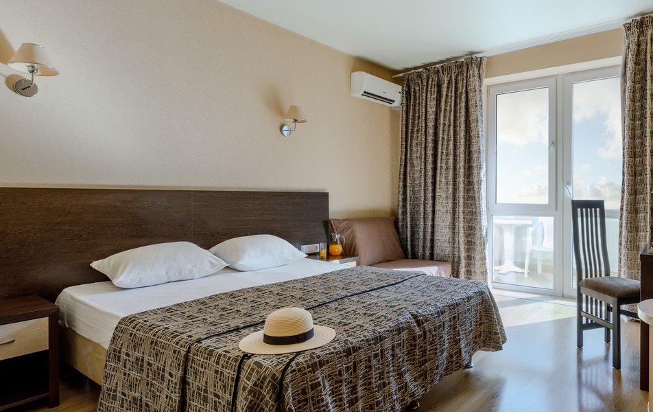 Стандартный 2-местный (с балконом) Количество комнат: 1-комнатный Тип номера: Стандартный Дополнительное место: кресло-кровать Кол-во доп. мест: 1 Кол-во номеров: 53 Кол-во основных мест: 2 Площадь (кв. м): 18 Балкон: с мебелью и сушилкой Мебель: вешалка, зеркало, кресло-кровать, кровати односпальные /одна двуспальная кровать, прикроватные тумбочки, столик журнальный, столик туалетный, стул, шкаф Оборудование: мини-холодильник, набор посуды, пляжные полотенца, сейф, сплит-система, телевизор ЖК, телефон Санузел: с душевой кабиной, тапочки, туалетные принадлежности, фен Сервис: Wi-Fi бесплатно, смена полотенец: ежедневно, смена постельного белья: 1 раз в 3 дня, уборка номера: ежедневно, услуги телефонной связи по территории отеля