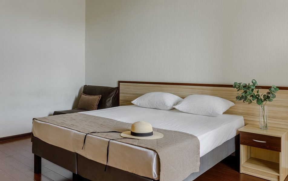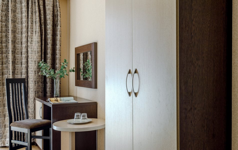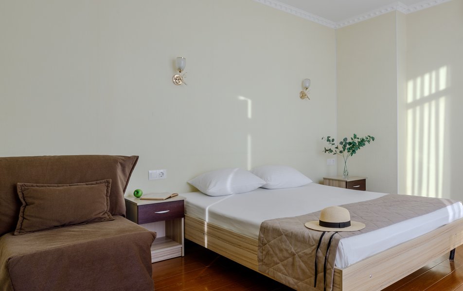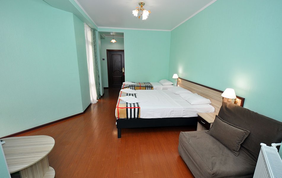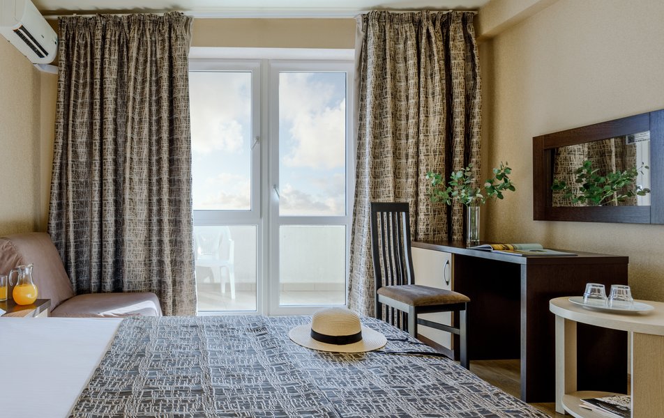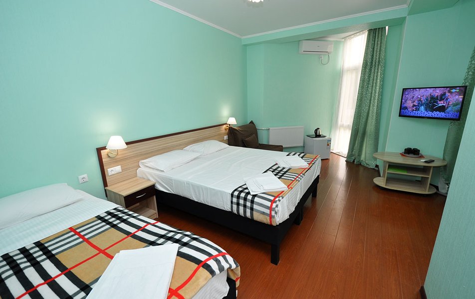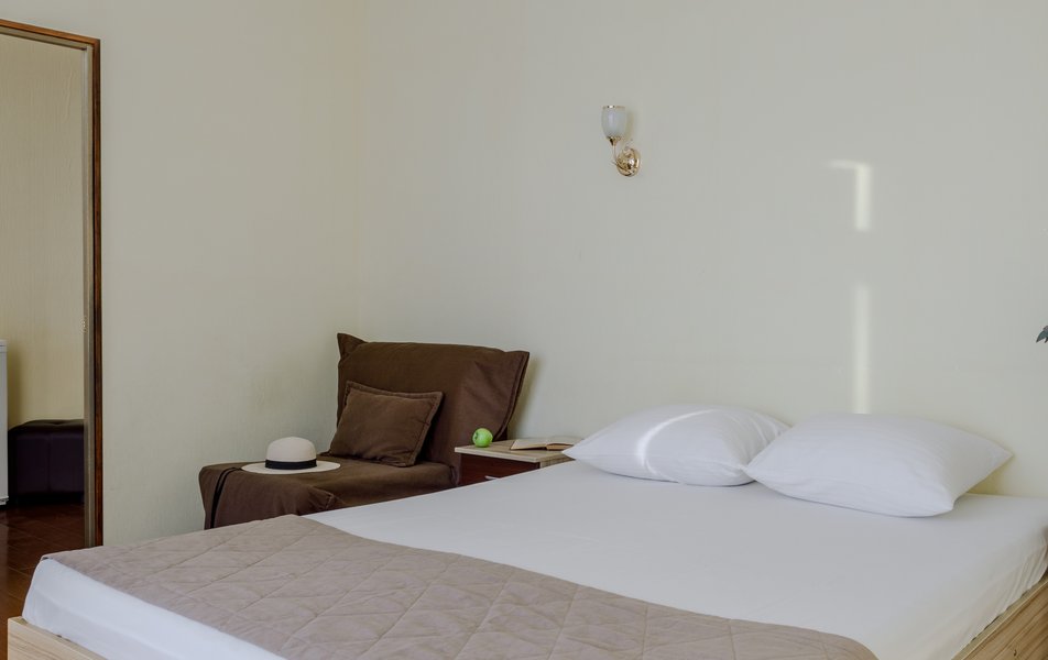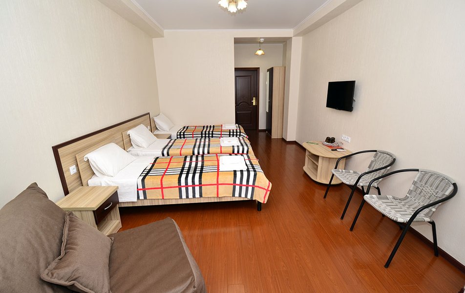 Стандартный 2-местный (с балконом) Количество комнат: 1-комнатный Тип номера: Стандартный Дополнительное место: кресло-кровать Кол-во доп. мест: 1 Кол-во номеров: 53 Кол-во основных мест: 2 Площадь (кв. м): 18 Балкон: с мебелью и сушилкой Мебель: вешалка, зеркало, кресло-кровать, кровати односпальные /одна двуспальная кровать, прикроватные тумбочки, столик журнальный, столик туалетный, стул, шкаф Оборудование: мини-холодильник, набор посуды, пляжные полотенца, сейф, сплит-система, телевизор ЖК, телефон Санузел: с душевой кабиной, тапочки, туалетные принадлежности, фен Сервис: Wi-Fi бесплатно, смена полотенец: ежедневно, смена постельного белья: 1 раз в 3 дня, уборка номера: ежедневно, услуги телефонной связи по территории отеля