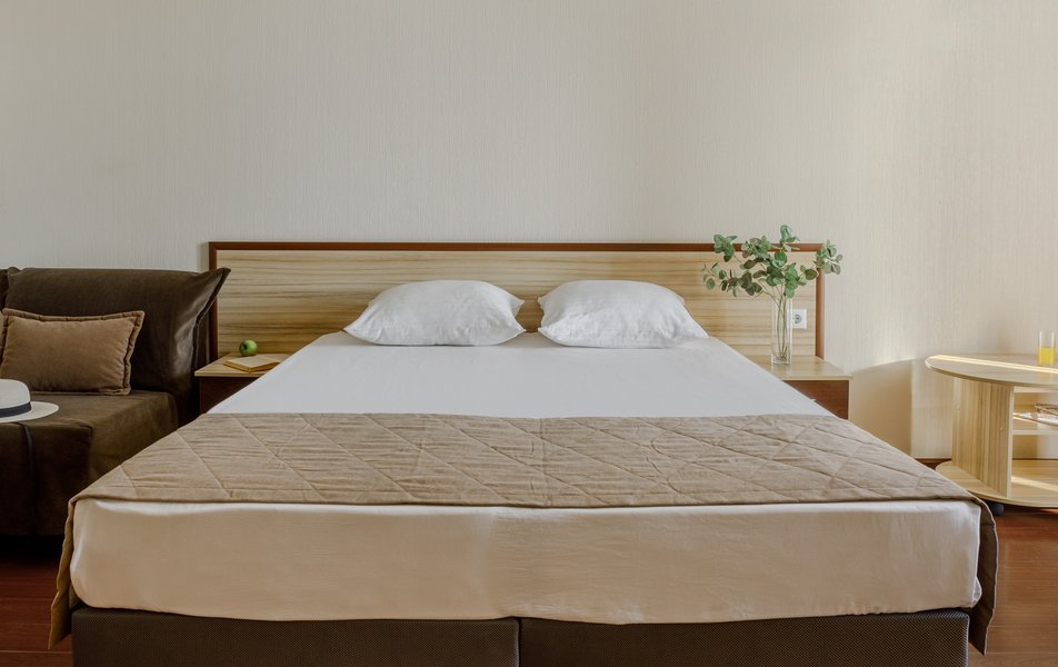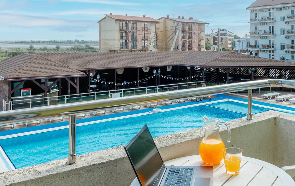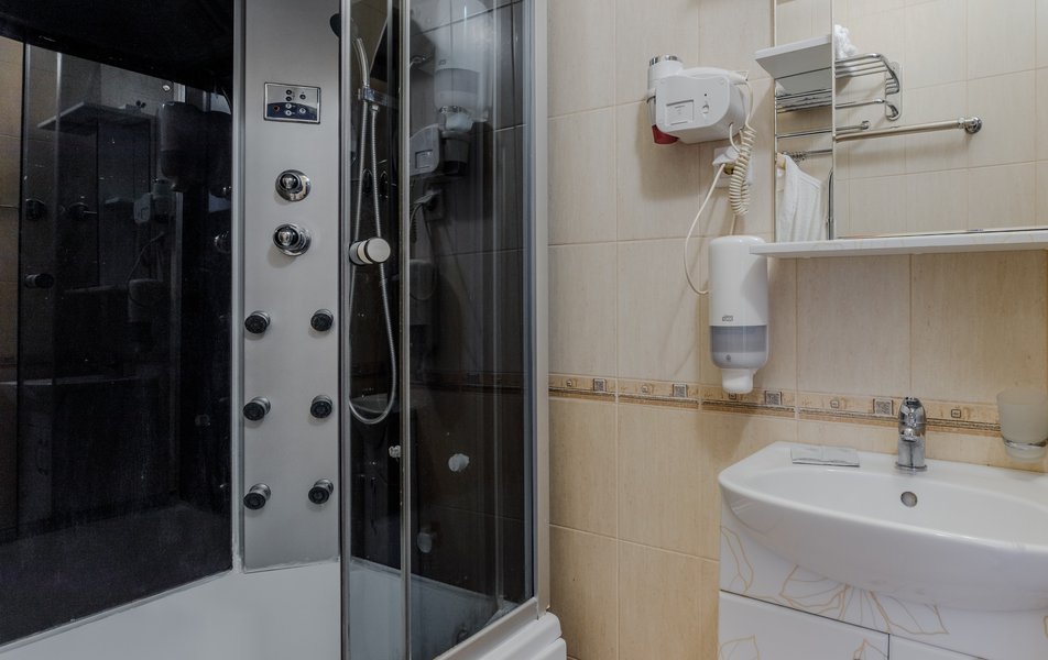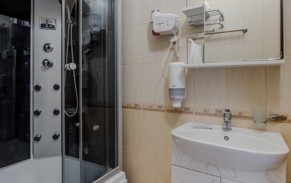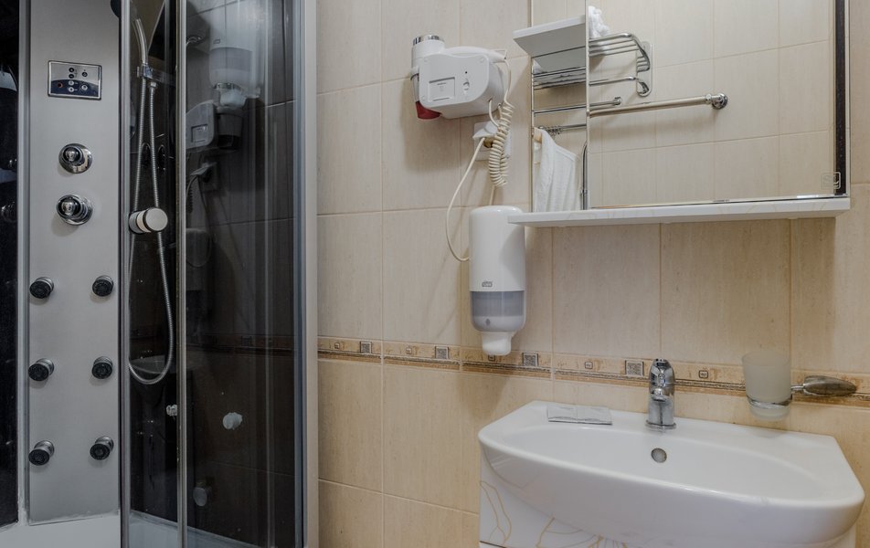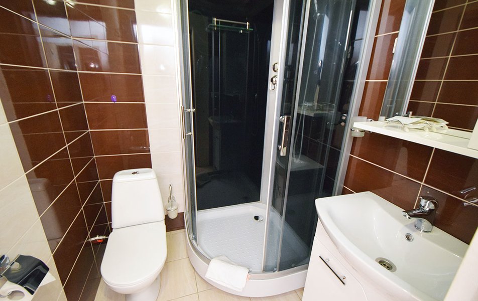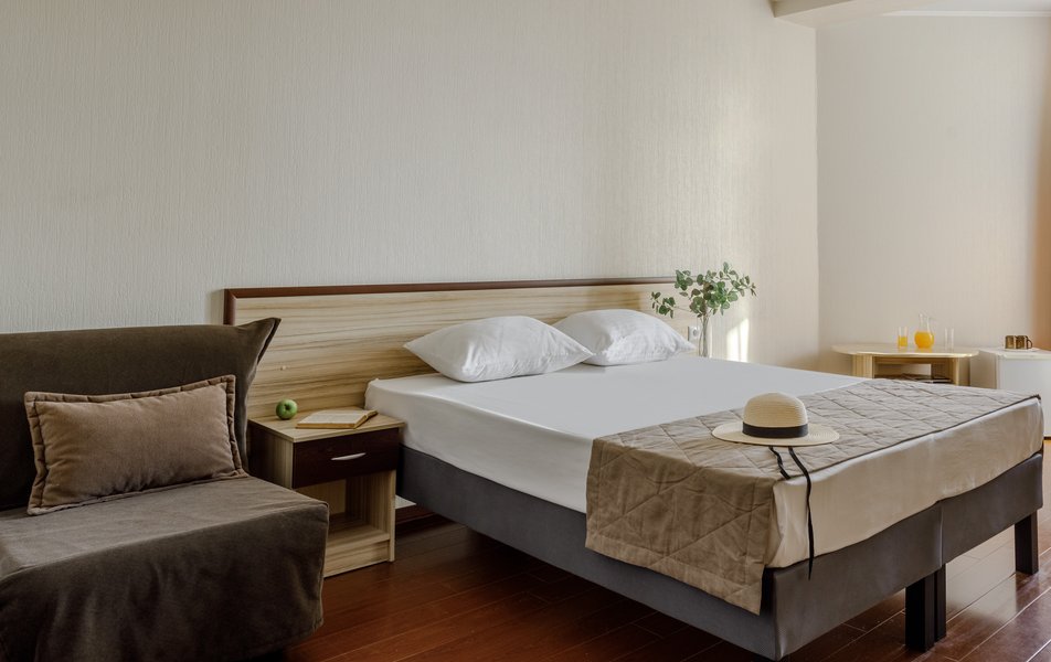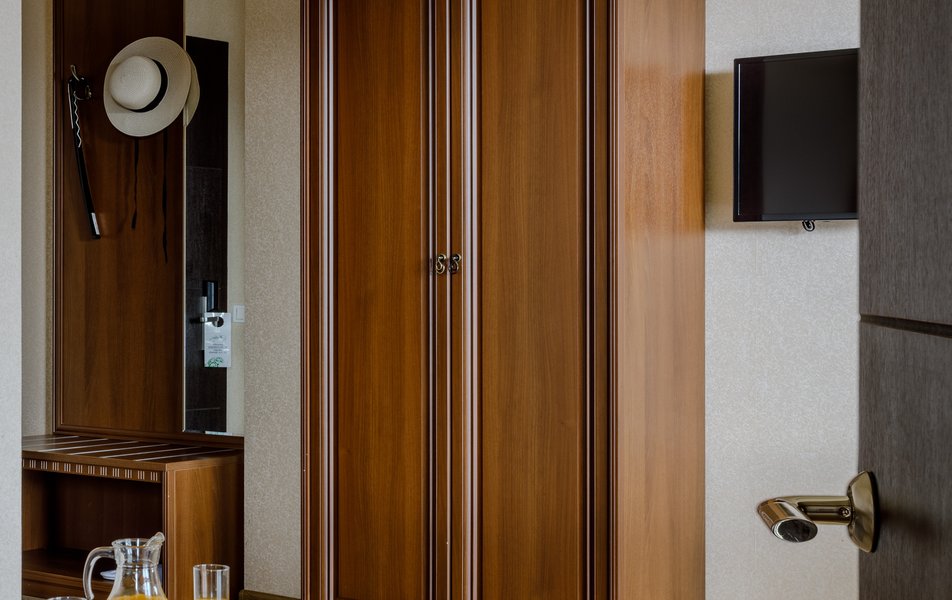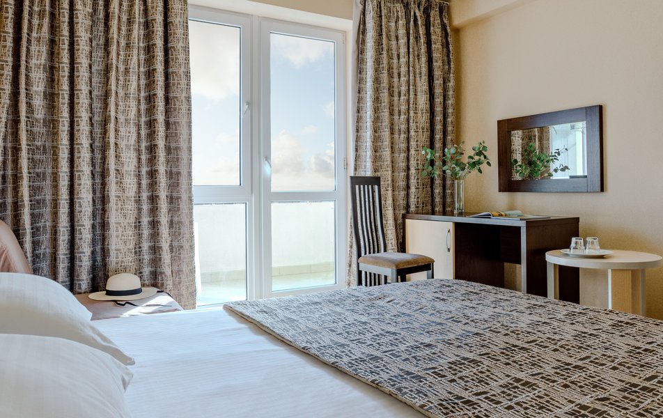 Стандартный 2-местный (с балконом) Количество комнат: 1-комнатный Тип номера: Стандартный Дополнительное место: кресло-кровать Кол-во доп. мест: 1 Кол-во номеров: 53 Кол-во основных мест: 2 Площадь (кв. м): 18 Балкон: с мебелью и сушилкой Мебель: вешалка, зеркало, кресло-кровать, кровати односпальные /одна двуспальная кровать, прикроватные тумбочки, столик журнальный, столик туалетный, стул, шкаф Оборудование: мини-холодильник, набор посуды, пляжные полотенца, сейф, сплит-система, телевизор ЖК, телефон Санузел: с душевой кабиной, тапочки, туалетные принадлежности, фен Сервис: Wi-Fi бесплатно, смена полотенец: ежедневно, смена постельного белья: 1 раз в 3 дня, уборка номера: ежедневно, услуги телефонной связи по территории отеля