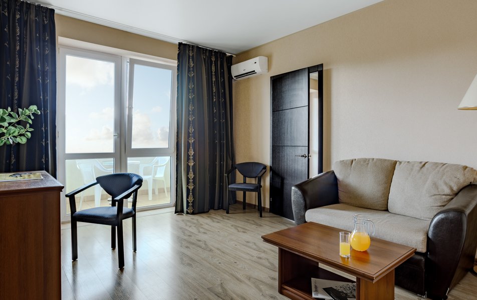 Люкс 2-местный 2-комнатный Количество комнат: 2-комнатный Тип номера: Люкс Дополнительное место: диван-кровать, кресло-кровать Вид из номера: на бассейн Кол-во доп. мест: 2 Кол-во номеров: 13 Кол-во основных мест: 2 Площадь (кв. м): 36 Этаж: 2-5 Балкон: с мебелью и сушилкой Мебель: вешалка, диван раскладной, зеркало, кресло-кровать, кровать двуспальная, прикроватные тумбочки, столик журнальный, столик туалетный, стул, шкаф Оборудование: мини-холодильник, набор посуды, пляжные полотенца, сейф, сплит-система, телевизор ЖК, телефон Санузел: с душем, тапочки, туалетные принадлежности, фен, халат Сервис: Wi-Fi бесплатно, смена полотенец: ежедневно, смена постельного белья: 1 раз в 3 дня, уборка номера: ежедневно, услуги телефонной связи по территории отеля