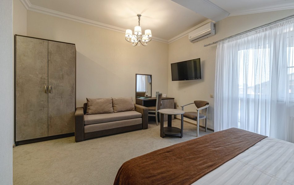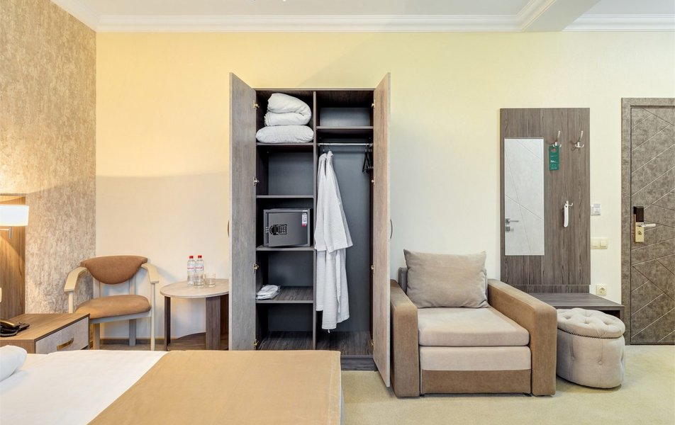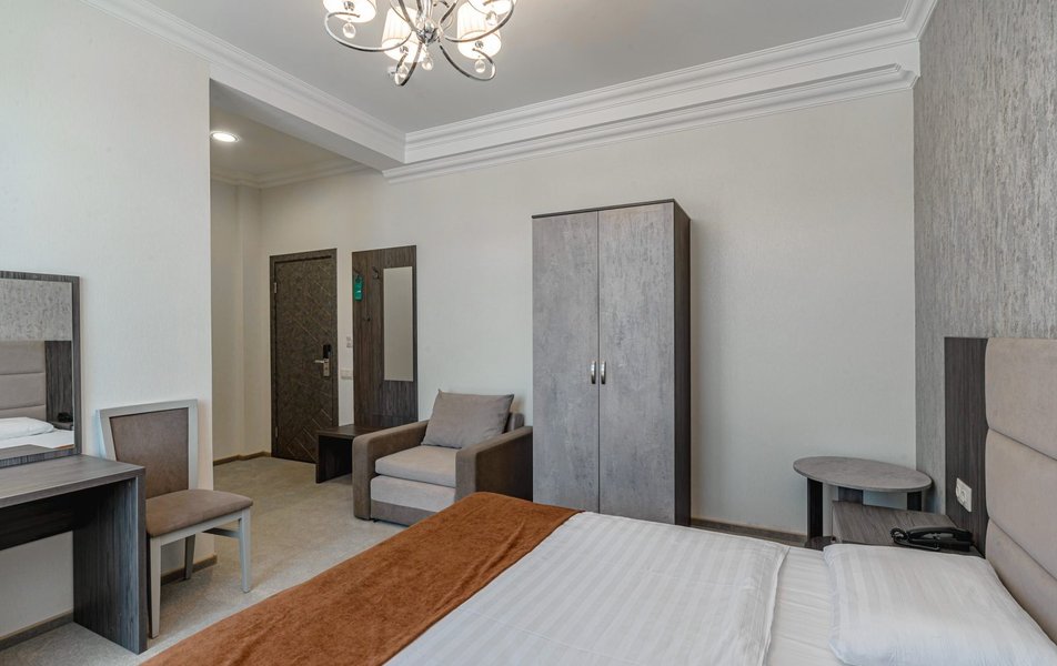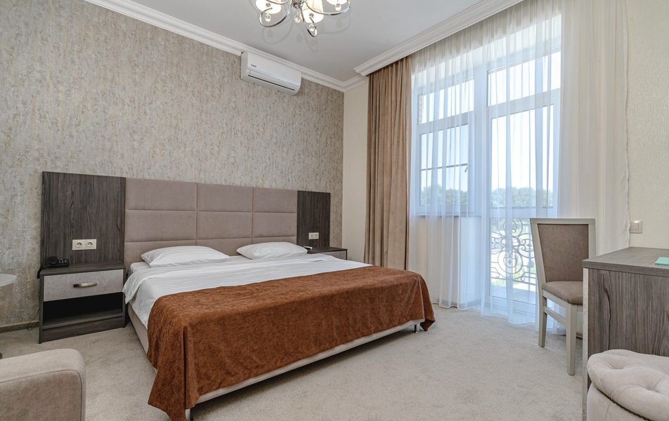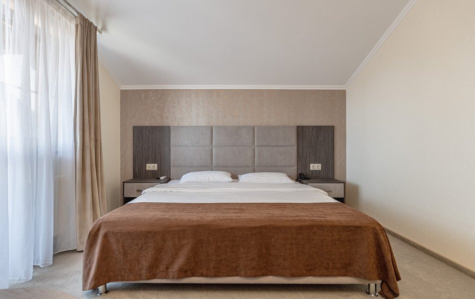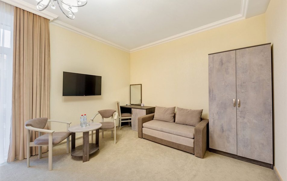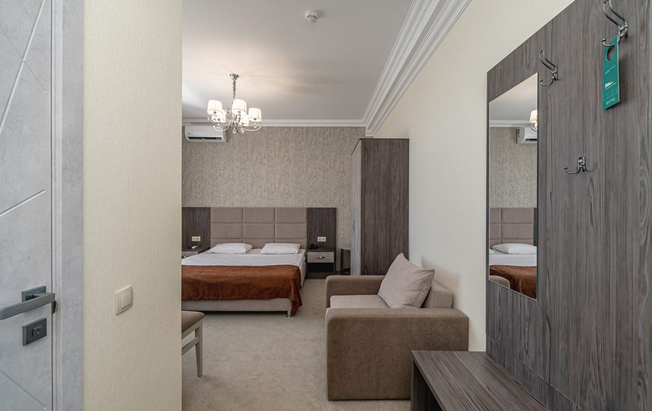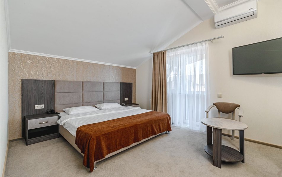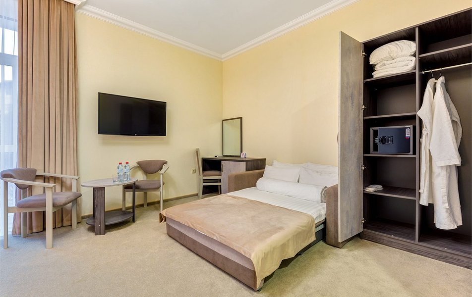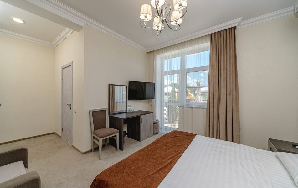 Делюкс 4-местный Количество комнат: 1-комнатный Тип номера: Делюкс Дополнительное место: еврораскладушка Кол-во доп. мест: 1 Кол-во основных мест: 4 Площадь (кв. м): 27 Балкон: с мебелью Мебель: вешалка, диван, зеркало, кровать двуспальная, прикроватные тумбочки, стол, стулья, шкаф Оборудование: мини-холодильник, сейф, сплит-система, телевизор, телефон, чайная станция Санузел: с душем, тапочки, туалетные принадлежности, фен, халат Сервис: Wi-Fi бесплатно, смена полотенец: 1 раз в 3 дня или по требованию, смена постельного белья: 1 раз в 3 дня или по требованию, уборка номера: 1 раз в 3 дня или по требованию, услуги внутренней телефонной связи
