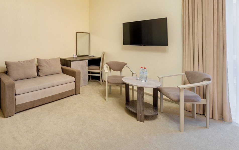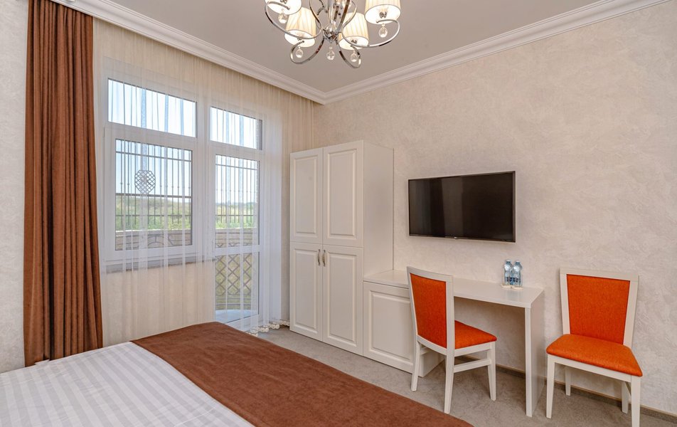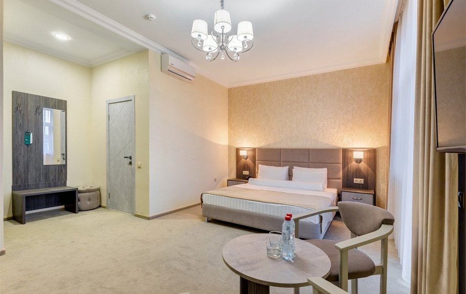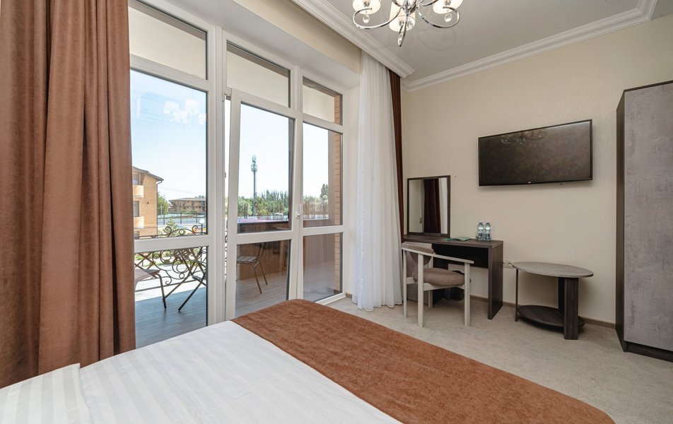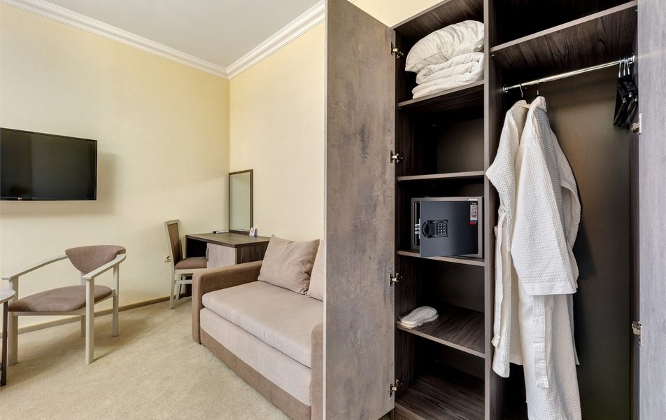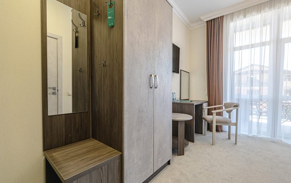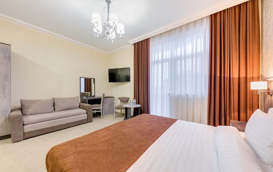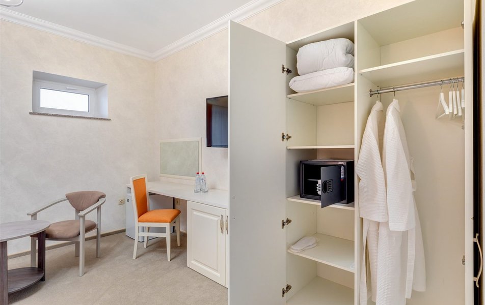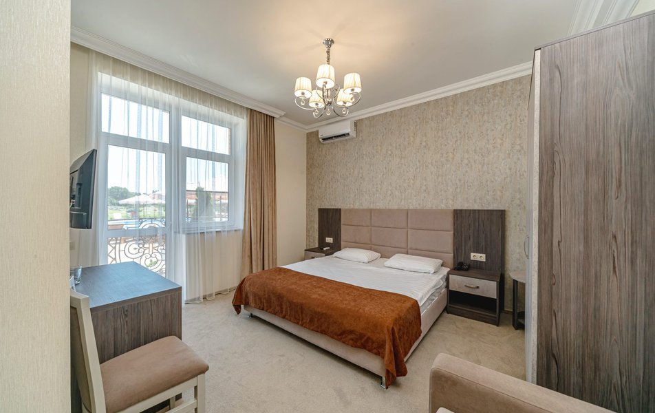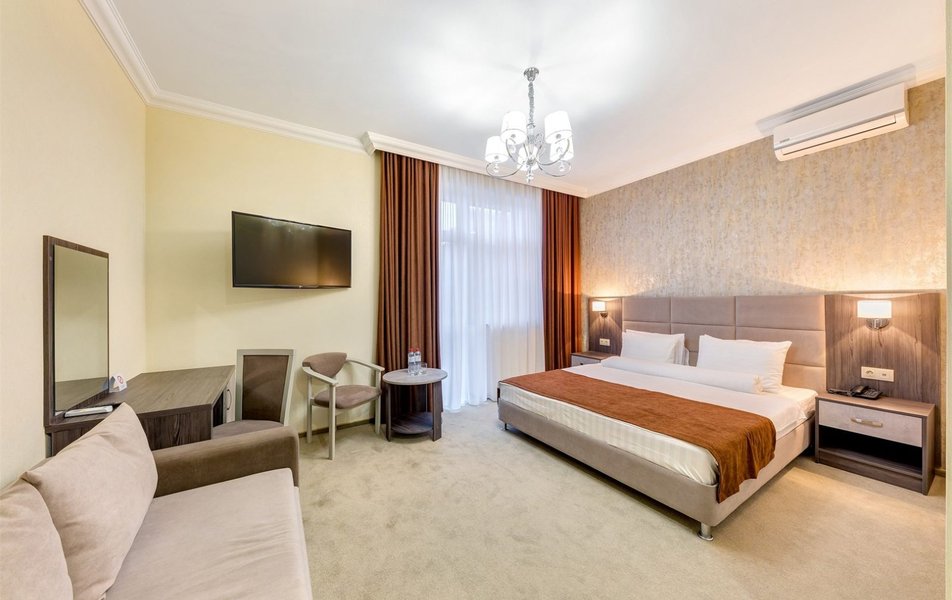 Делюкс 4-местный Количество комнат: 1-комнатный Тип номера: Делюкс Дополнительное место: еврораскладушка Кол-во доп. мест: 1 Кол-во основных мест: 4 Площадь (кв. м): 27 Балкон: с мебелью Мебель: вешалка, диван, зеркало, кровать двуспальная, прикроватные тумбочки, стол, стулья, шкаф Оборудование: мини-холодильник, сейф, сплит-система, телевизор, телефон, чайная станция Санузел: с душем, тапочки, туалетные принадлежности, фен, халат Сервис: Wi-Fi бесплатно, смена полотенец: 1 раз в 3 дня или по требованию, смена постельного белья: 1 раз в 3 дня или по требованию, уборка номера: 1 раз в 3 дня или по требованию, услуги внутренней телефонной связи