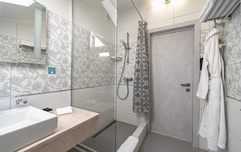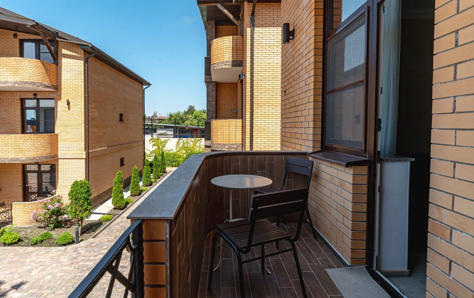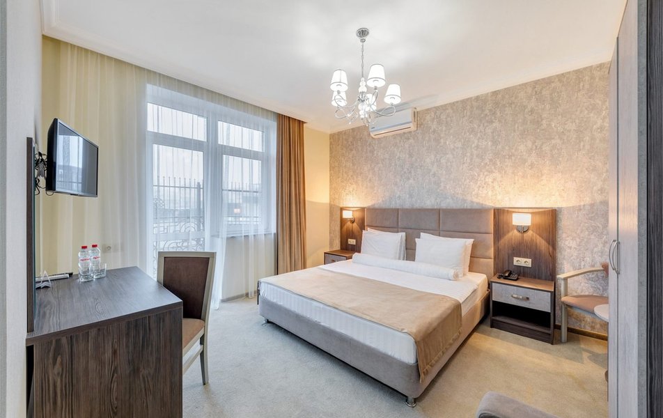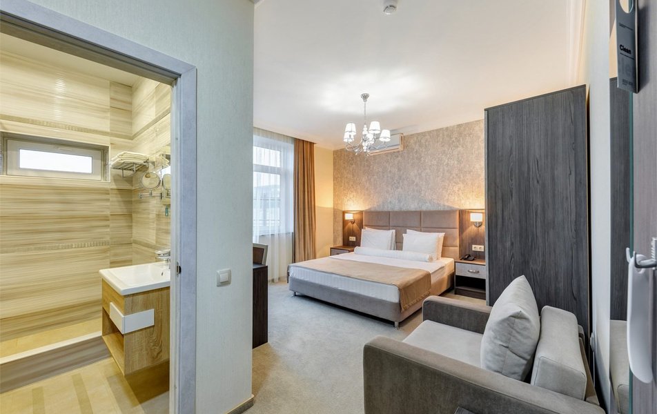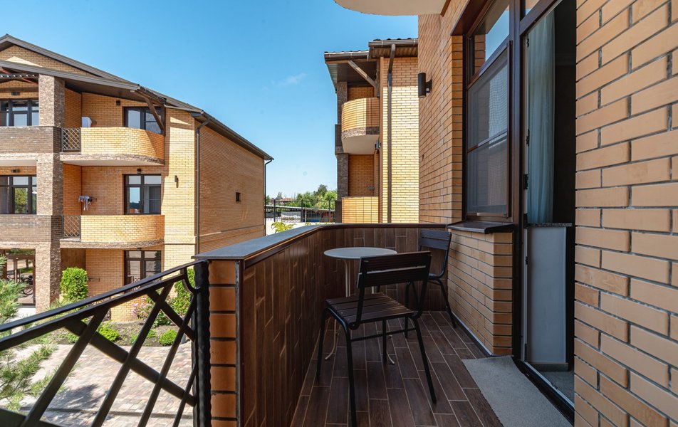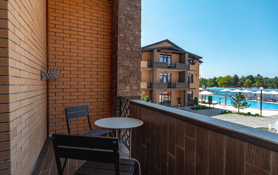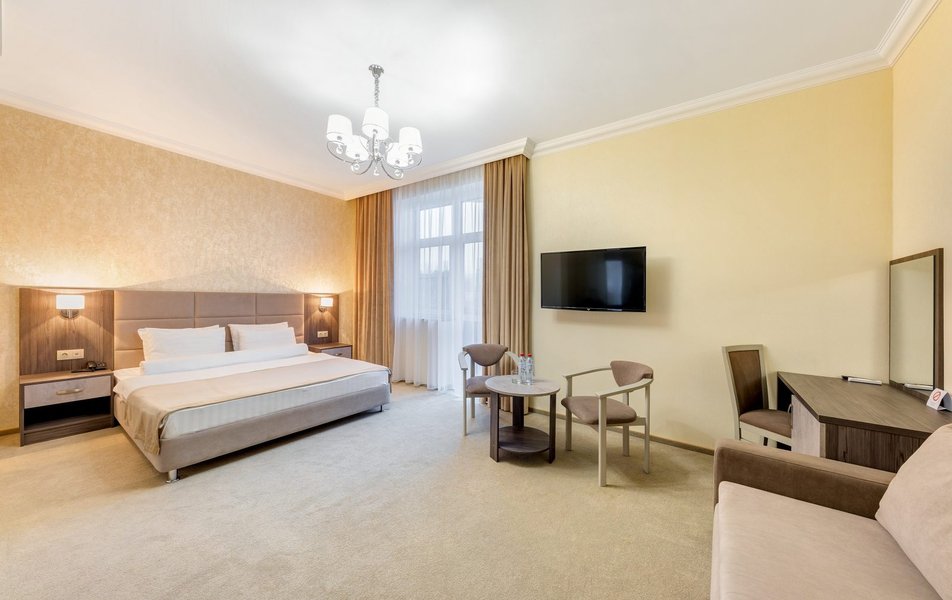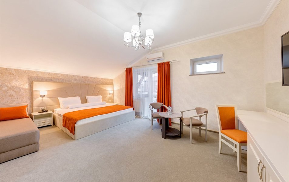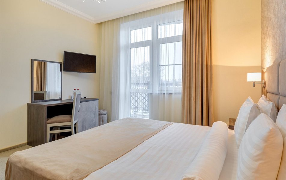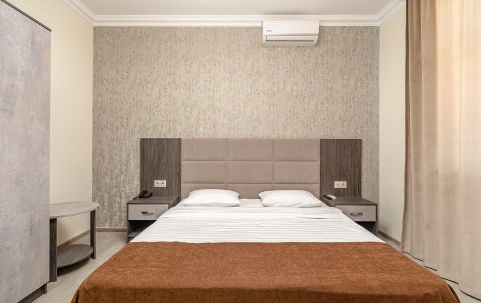 Делюкс 4-местный Количество комнат: 1-комнатный Тип номера: Делюкс Дополнительное место: еврораскладушка Кол-во доп. мест: 1 Кол-во основных мест: 4 Площадь (кв. м): 27 Балкон: с мебелью Мебель: вешалка, диван, зеркало, кровать двуспальная, прикроватные тумбочки, стол, стулья, шкаф Оборудование: мини-холодильник, сейф, сплит-система, телевизор, телефон, чайная станция Санузел: с душем, тапочки, туалетные принадлежности, фен, халат Сервис: Wi-Fi бесплатно, смена полотенец: 1 раз в 3 дня или по требованию, смена постельного белья: 1 раз в 3 дня или по требованию, уборка номера: 1 раз в 3 дня или по требованию, услуги внутренней телефонной связи