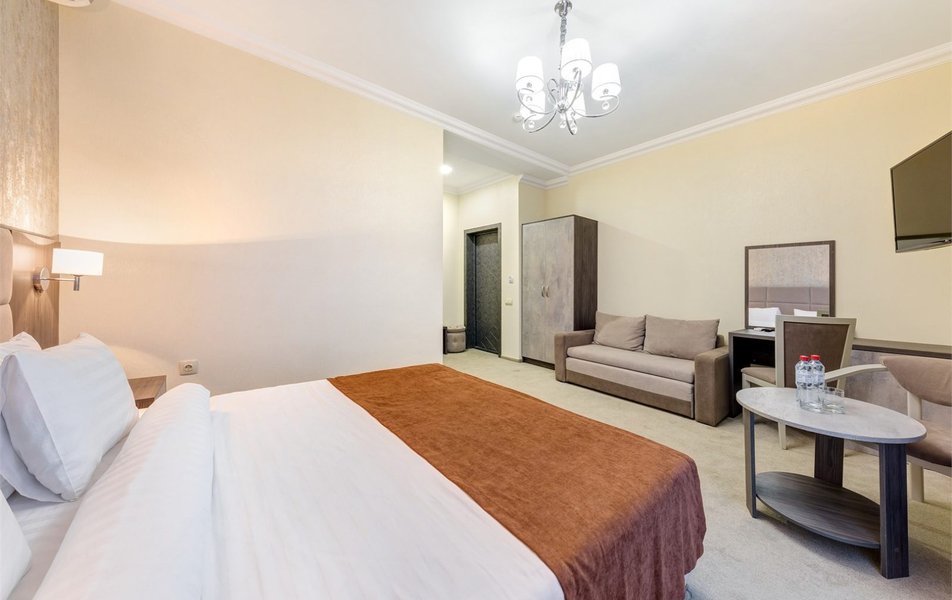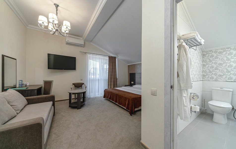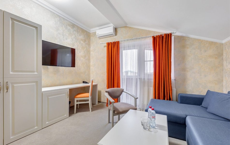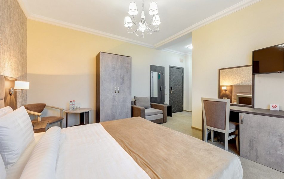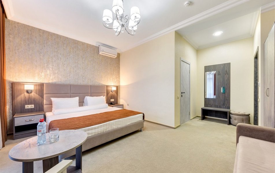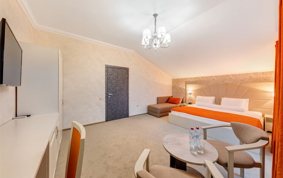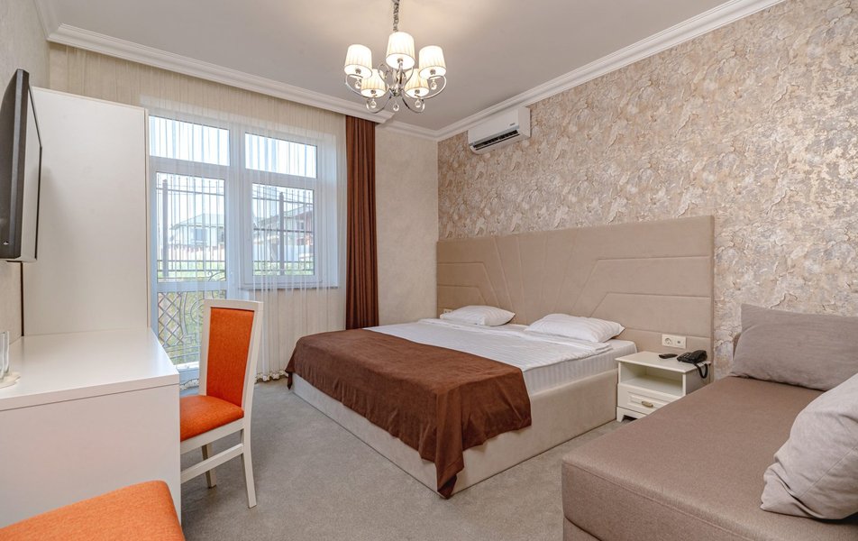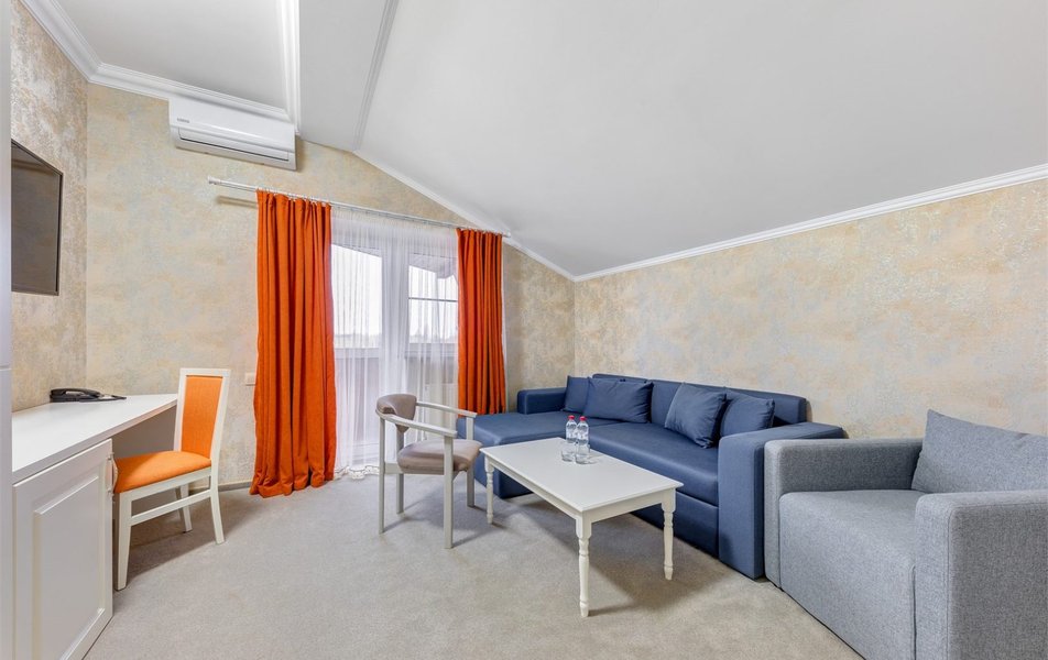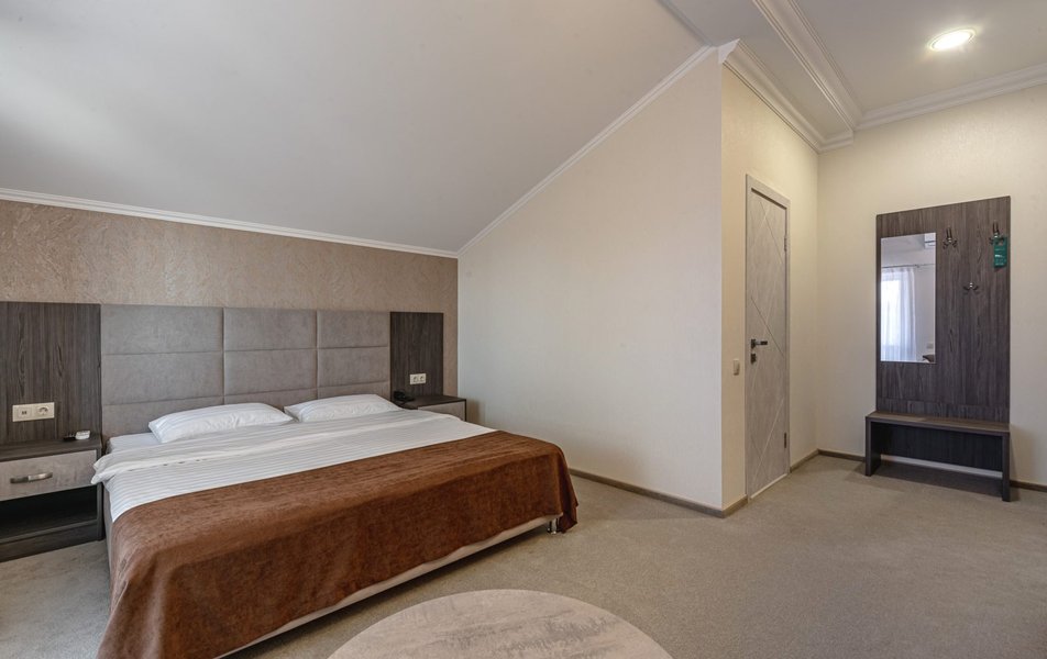 Делюкс 5-местный Количество комнат: 1-комнатный Тип номера: Делюкс Дополнительное место: еврораскладушка Кол-во доп. мест: 1 Кол-во основных мест: 5 Площадь (кв. м): 35 Балкон: французский балкон Мебель: вешалка, диван, зеркало, кровать двуспальная, кровать односпальная, прикроватные тумбочки, стол, стулья, шкаф Оборудование: мини-холодильник, сейф, сплит-система, телевизор, телефон, чайная станция Санузел: с душем, тапочки, туалетные принадлежности, фен, халат Сервис: Wi-Fi бесплатно, смена полотенец: 1 раз в 3 дня или по требованию, смена постельного белья: 1 раз в 3 дня или по требованию, уборка номера: 1 раз в 3 дня или по требованию, услуги внутренней телефонной связи