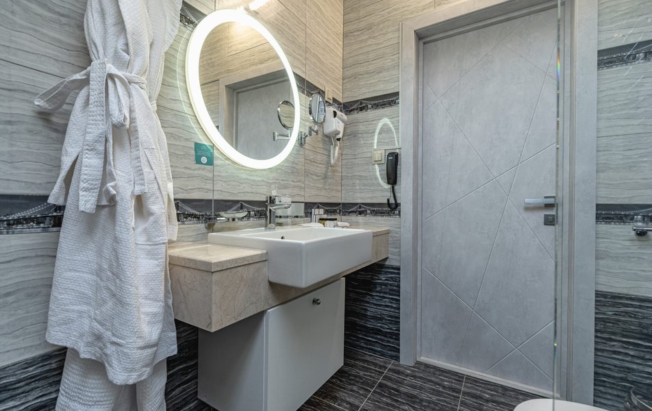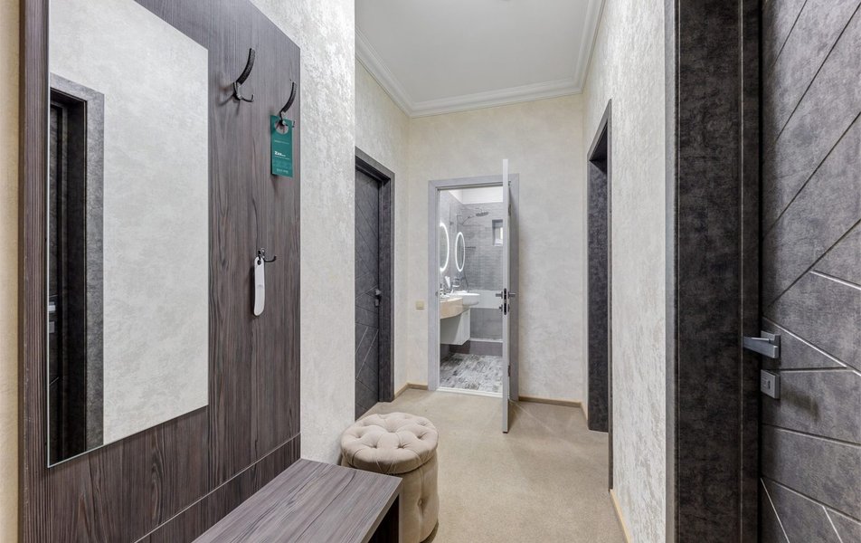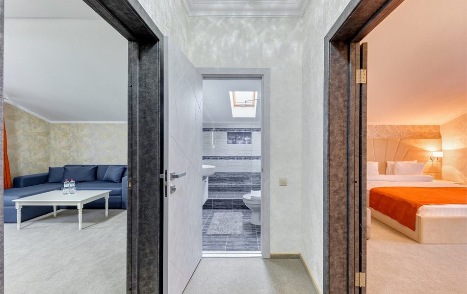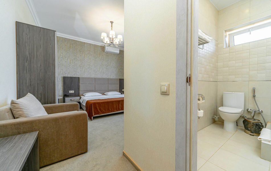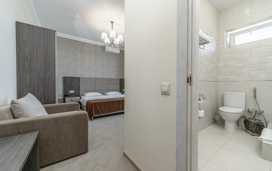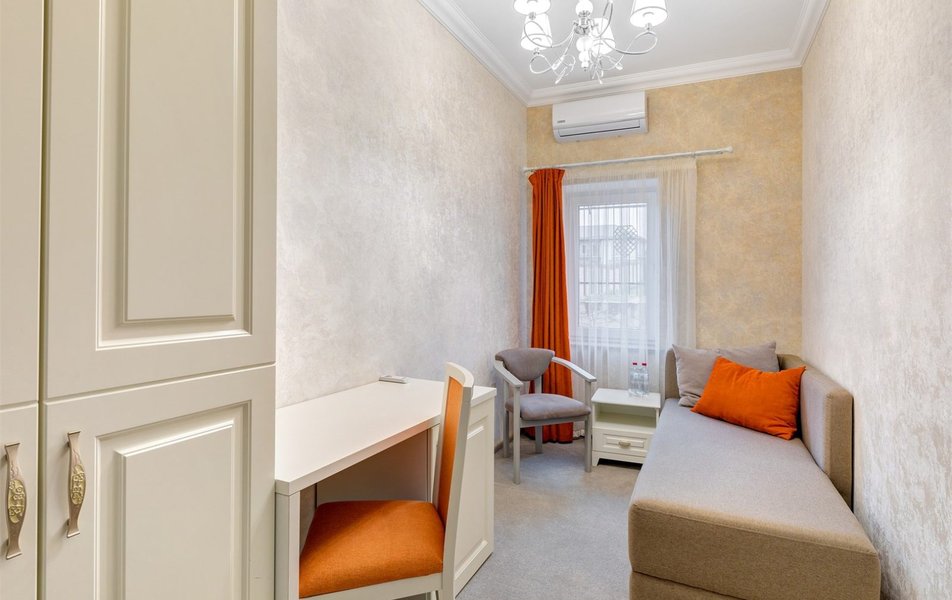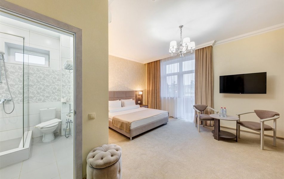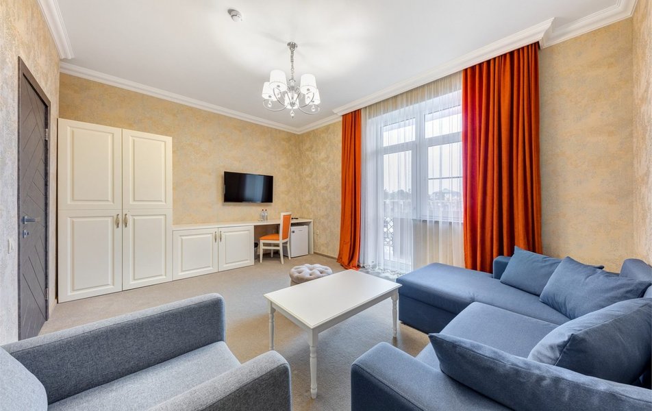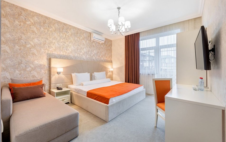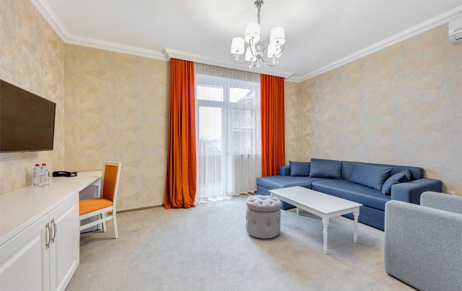Делюкс 5-местный Количество комнат: 1-комнатный Тип номера: Делюкс Дополнительное место: еврораскладушка Кол-во доп. мест: 1 Кол-во основных мест: 5 Площадь (кв. м): 35 Балкон: французский балкон Мебель: вешалка, диван, зеркало, кровать двуспальная, кровать односпальная, прикроватные тумбочки, стол, стулья, шкаф Оборудование: мини-холодильник, сейф, сплит-система, телевизор, телефон, чайная станция Санузел: с душем, тапочки, туалетные принадлежности, фен, халат Сервис: Wi-Fi бесплатно, смена полотенец: 1 раз в 3 дня или по требованию, смена постельного белья: 1 раз в 3 дня или по требованию, уборка номера: 1 раз в 3 дня или по требованию, услуги внутренней телефонной связи