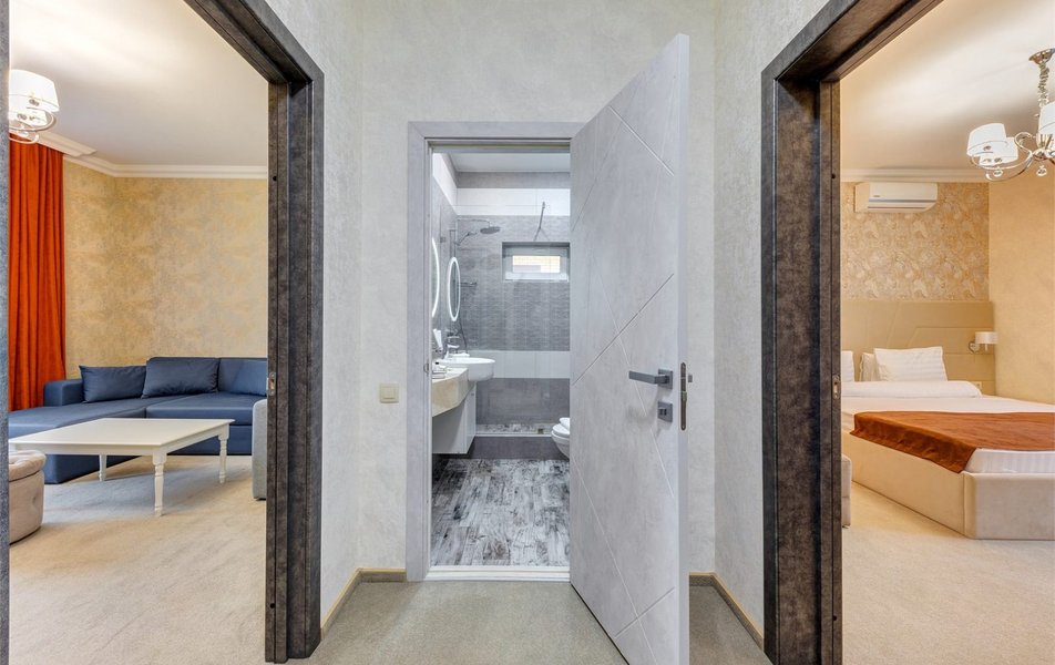 Апартаменты Семейный 6-местный 3-комнатный Количество комнат: 3-комнатный Тип номера: Апартаменты Дополнительное место: диван Кол-во доп. мест: 1 Кол-во основных мест: 6 Площадь (кв. м): 60 Балкон: французский балкон Мебель: вешалка, диван, зеркало, кровать двуспальная, кровать односпальная, прикроватные тумбочки, стол, стулья, шкаф Оборудование: мини-холодильник, сейф, сплит-система, телевизор, телефон, чайный набор посуды, электрочайник Санузел: с душем, тапочки, туалетные принадлежности, фен, халат Сервис: Wi-Fi бесплатно, смена полотенец: 1 раз в 3 дня или по требованию, смена постельного белья: 1 раз в 3 дня или по требованию, уборка номера: 1 раз в 3 дня или по требованию, услуги внутренней телефонной связи