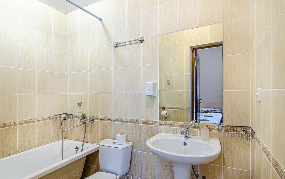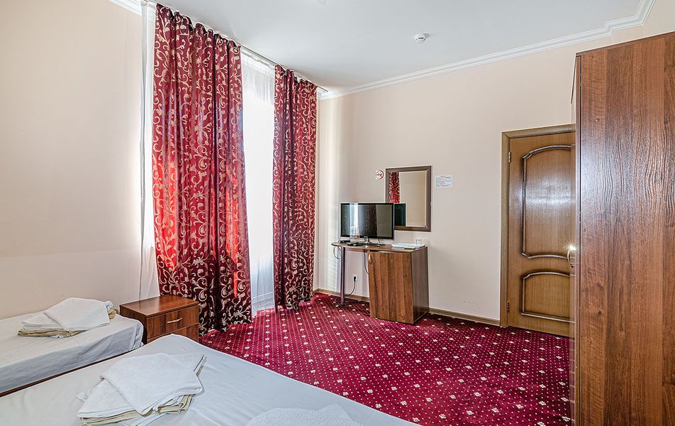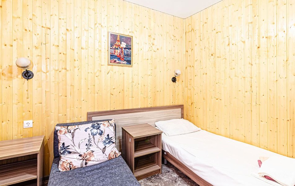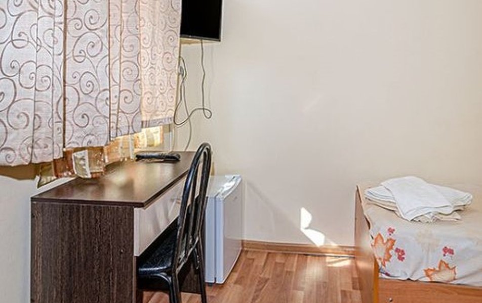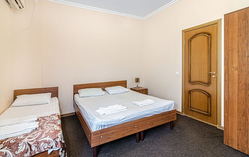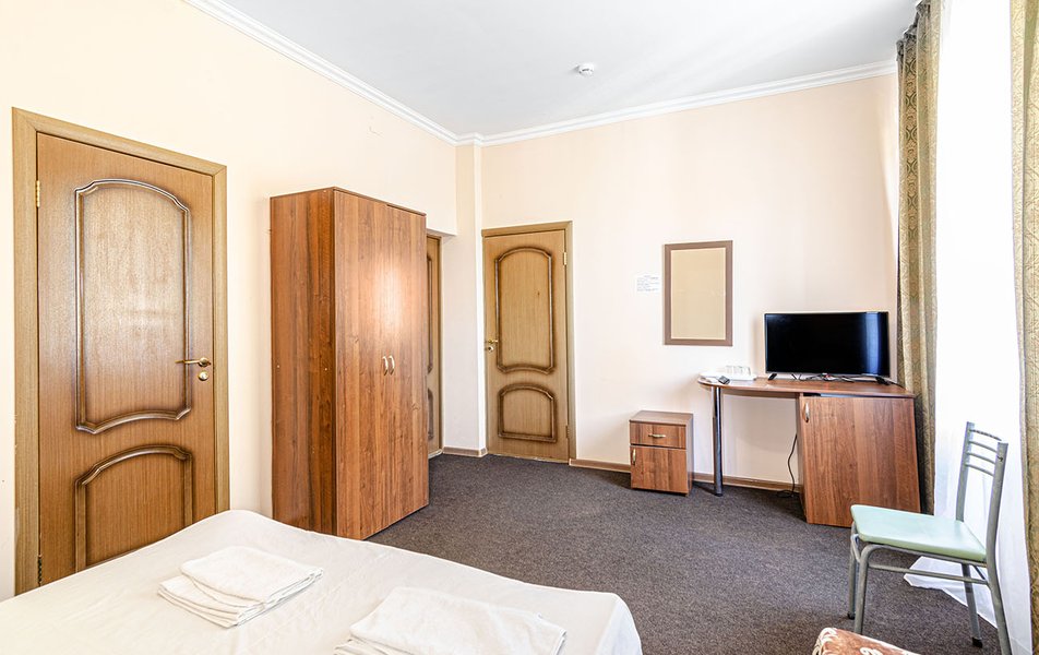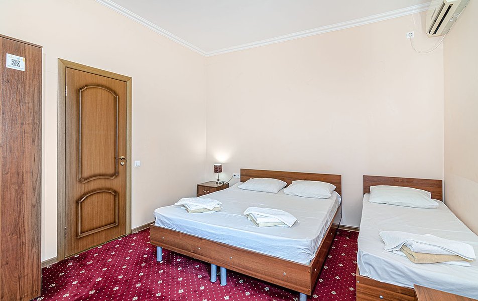 Комфорт 2-местный (с дополнительным местом) Количество комнат: 1-комнатный Тип номера: Комфорт Кол-во доп. мест: 1 Кол-во номеров: 32 Кол-во основных мест: 2 Корпус: №1 Площадь (кв. м): 18 Балкон: не во всех номерах Мебель: вешалка, зеркало, кровать двуспальная, прикроватные тумбочки, стол, стулья, шкаф Оборудование: кондиционер, телевизор, холодильник Санузел: с ванной, туалетные принадлежности Сервис: смена полотенец, смена постельного белья, уборка номера