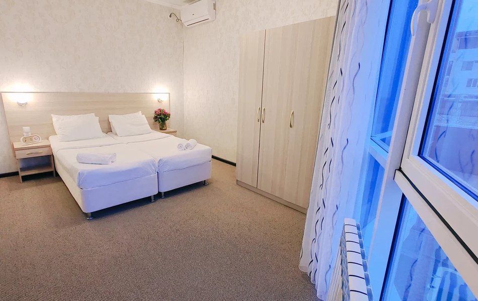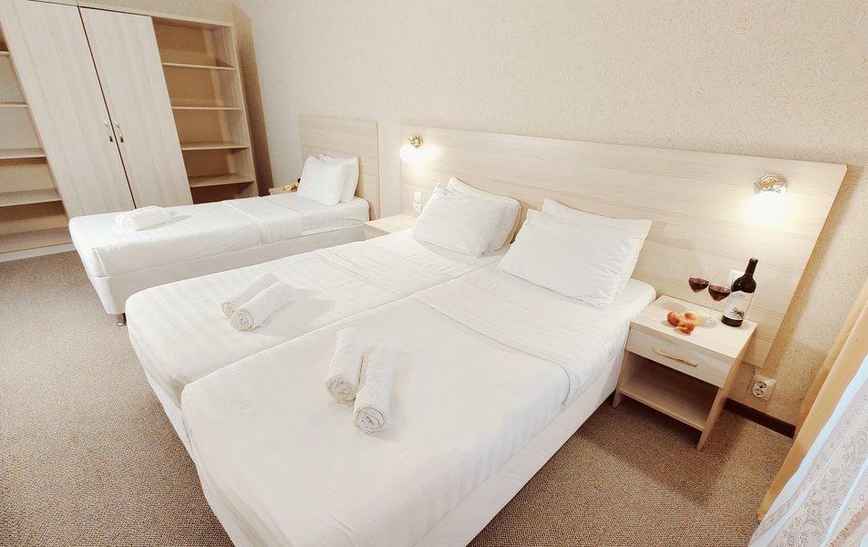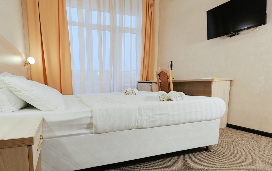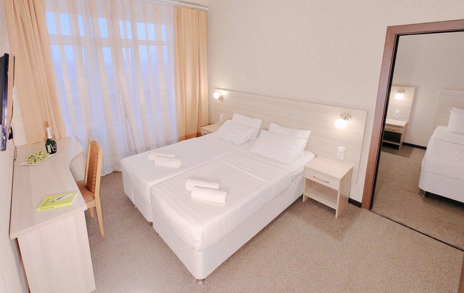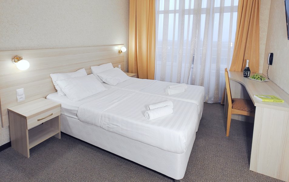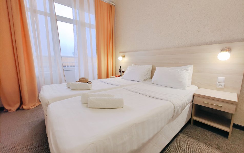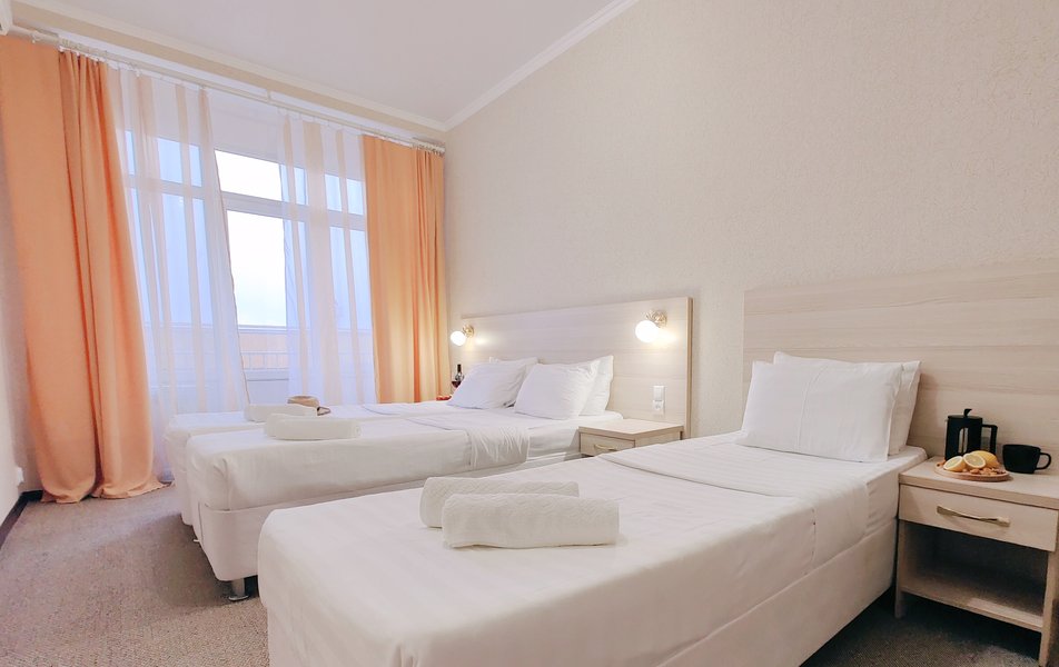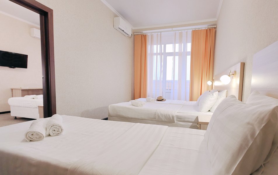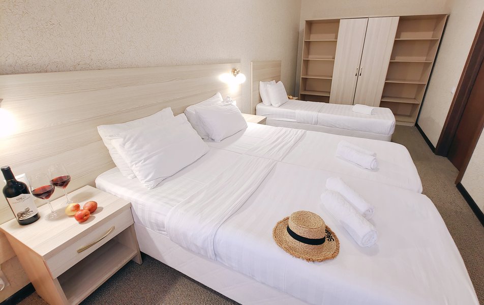 Забронировали номер на троих в августе, приехали днём и нас очень тепло встретили, сразу заселили. Номер был на 5 этаже, в отеле есть лифт. Сам номер небольшой, но уютный, есть всё необходимое для проживания, балкончик со столиком и стульями, я люблю такое. Питание понравилось, было разнообразие и вкус, ребёнку очень нравились запеканки, хотя дома не особо их ест. А ещё анимация была каждый день, так что скучать не пришлось. Особо хочу отметить сауну - нам администратор сказала, сто можно в сауну сходить и это бесплатно. Мы записались, и уже на следующий день попарились на славу, кстати, в сауне тоже есть бассейн. В общем, очень приятный отель на самом берегу Чёрного моря и по очень адекватной цене, рекомендую от души)