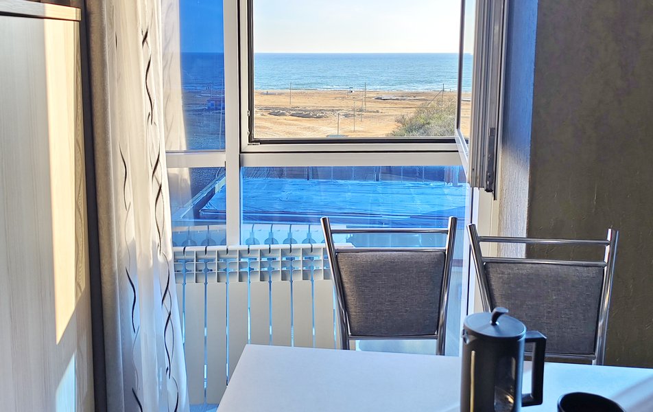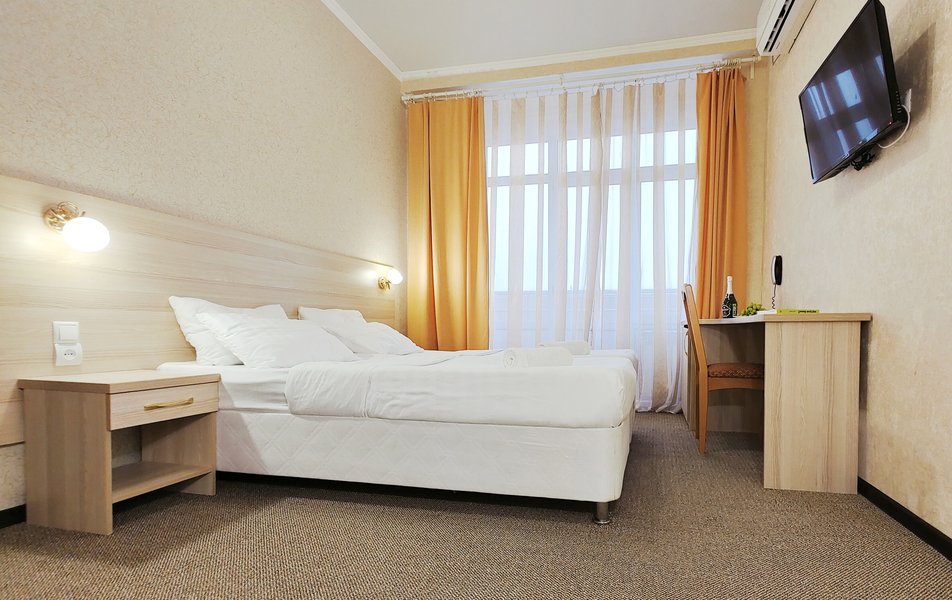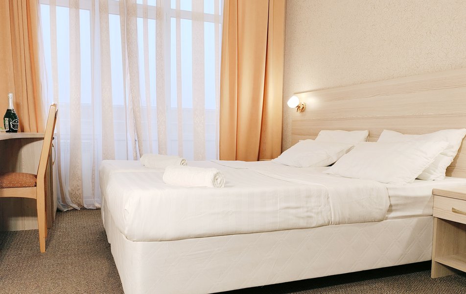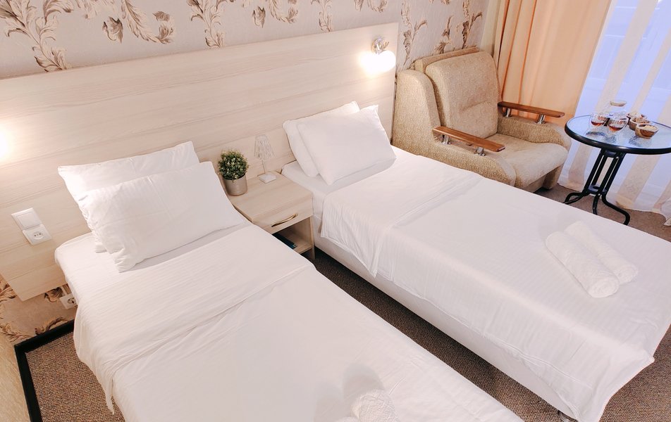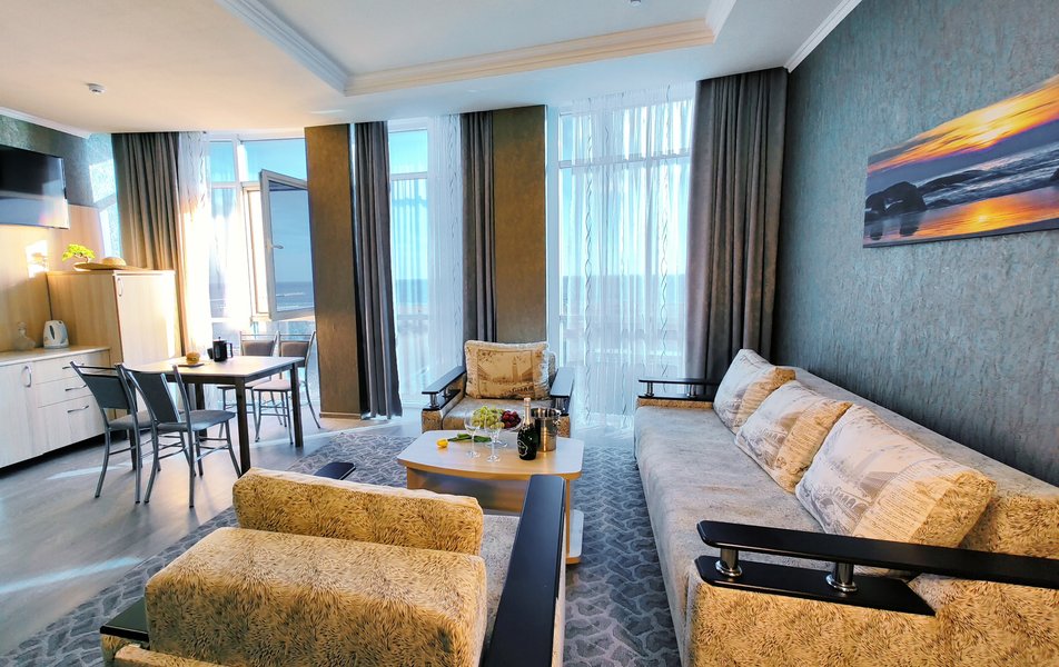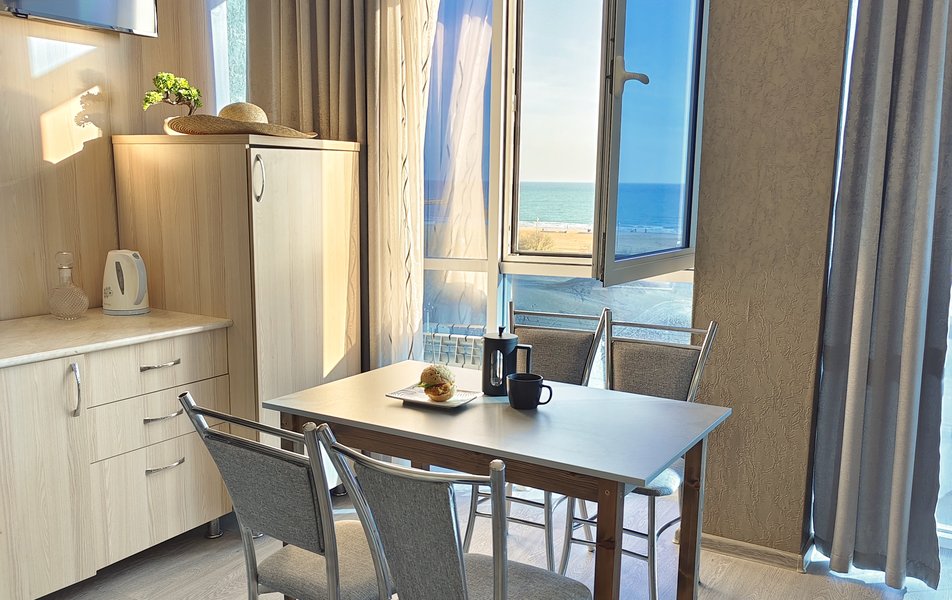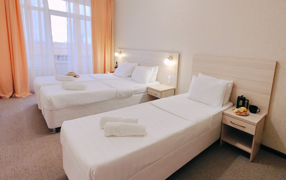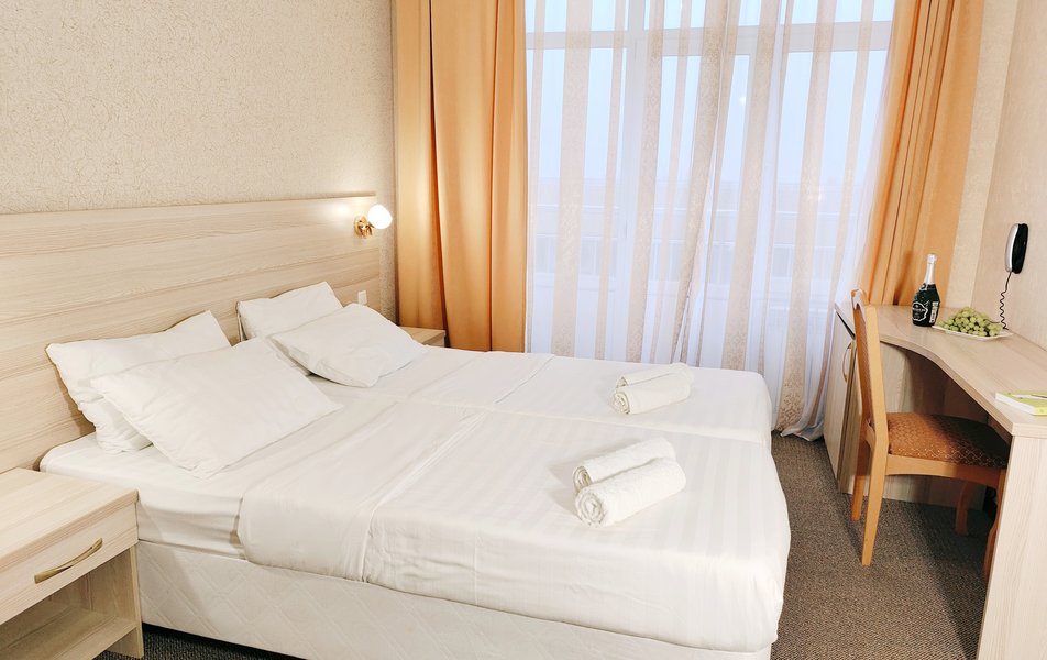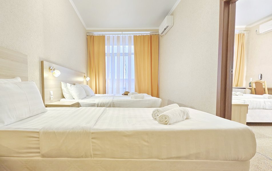 Забронировали номер на троих в августе, приехали днём и нас очень тепло встретили, сразу заселили. Номер был на 5 этаже, в отеле есть лифт. Сам номер небольшой, но уютный, есть всё необходимое для проживания, балкончик со столиком и стульями, я люблю такое. Питание понравилось, было разнообразие и вкус, ребёнку очень нравились запеканки, хотя дома не особо их ест. А ещё анимация была каждый день, так что скучать не пришлось. Особо хочу отметить сауну - нам администратор сказала, сто можно в сауну сходить и это бесплатно. Мы записались, и уже на следующий день попарились на славу, кстати, в сауне тоже есть бассейн. В общем, очень приятный отель на самом берегу Чёрного моря и по очень адекватной цене, рекомендую от души)