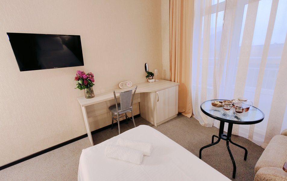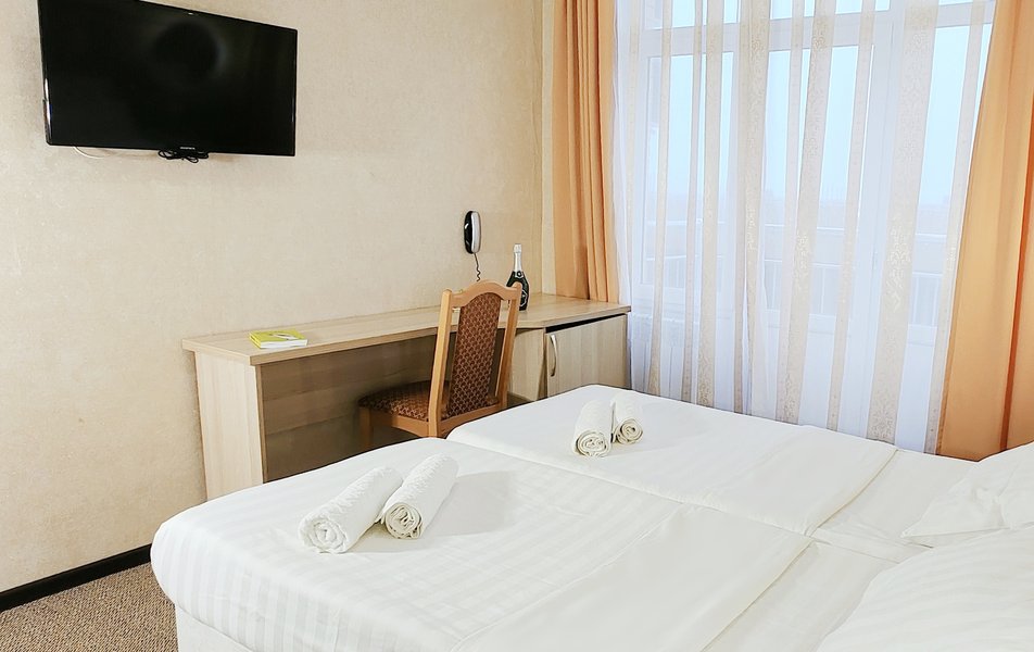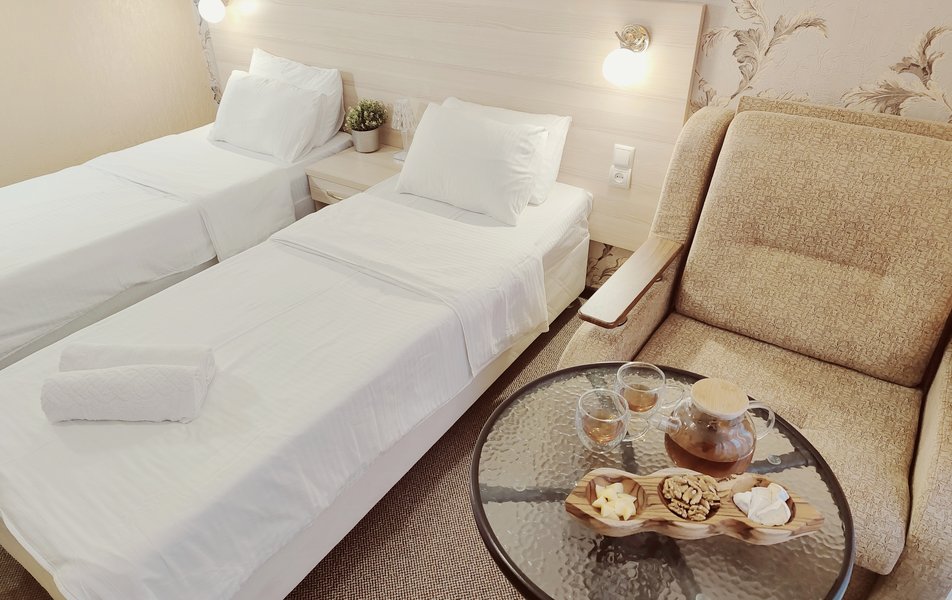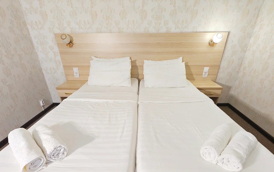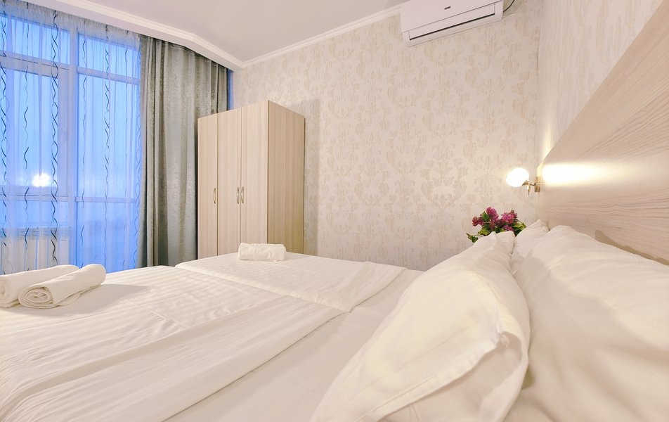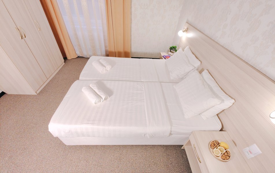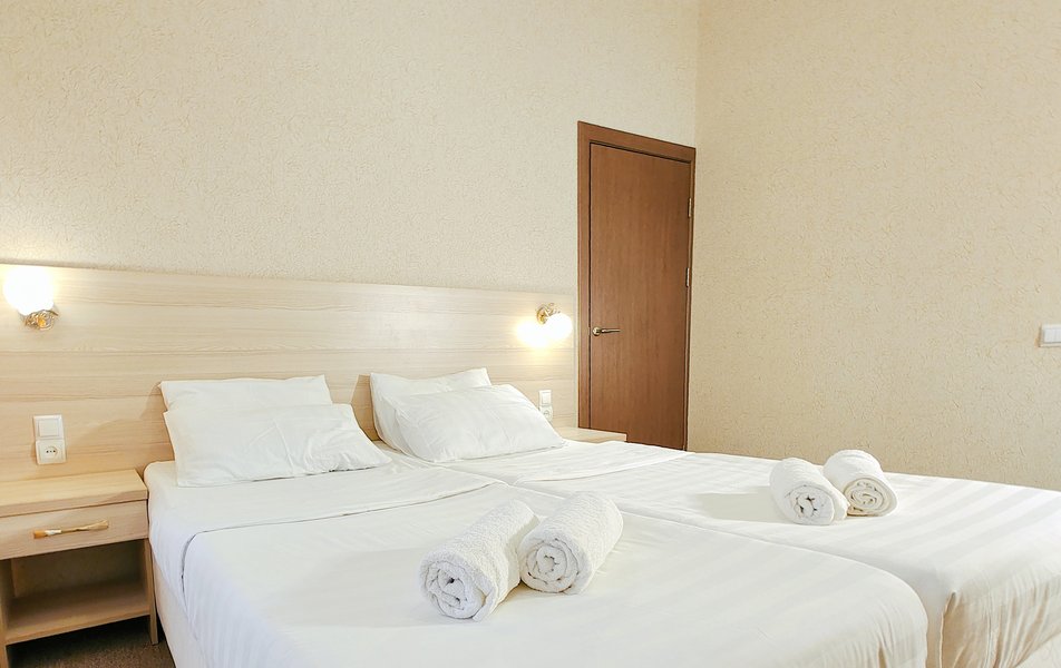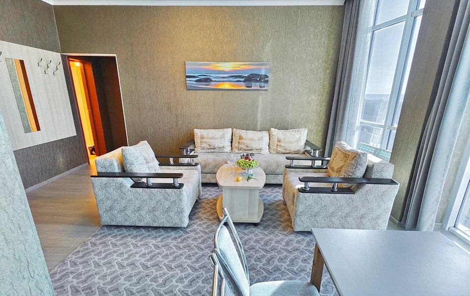 Забронировали номер на троих в августе, приехали днём и нас очень тепло встретили, сразу заселили. Номер был на 5 этаже, в отеле есть лифт. Сам номер небольшой, но уютный, есть всё необходимое для проживания, балкончик со столиком и стульями, я люблю такое. Питание понравилось, было разнообразие и вкус, ребёнку очень нравились запеканки, хотя дома не особо их ест. А ещё анимация была каждый день, так что скучать не пришлось. Особо хочу отметить сауну - нам администратор сказала, сто можно в сауну сходить и это бесплатно. Мы записались, и уже на следующий день попарились на славу, кстати, в сауне тоже есть бассейн. В общем, очень приятный отель на самом берегу Чёрного моря и по очень адекватной цене, рекомендую от души)