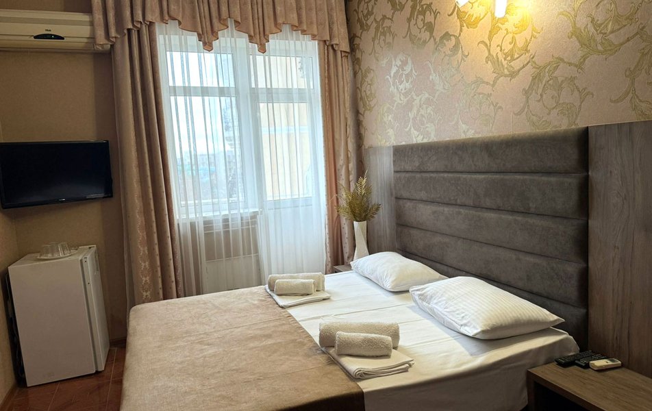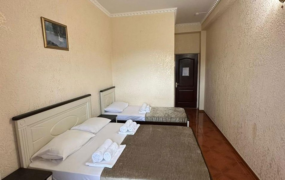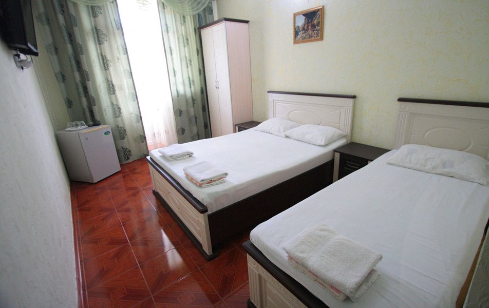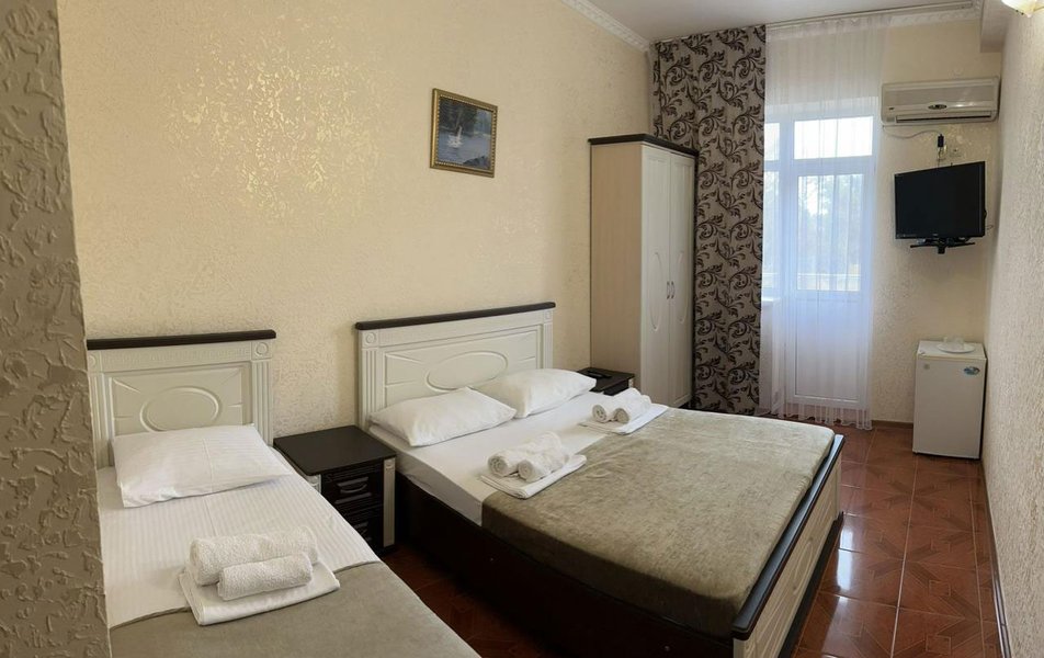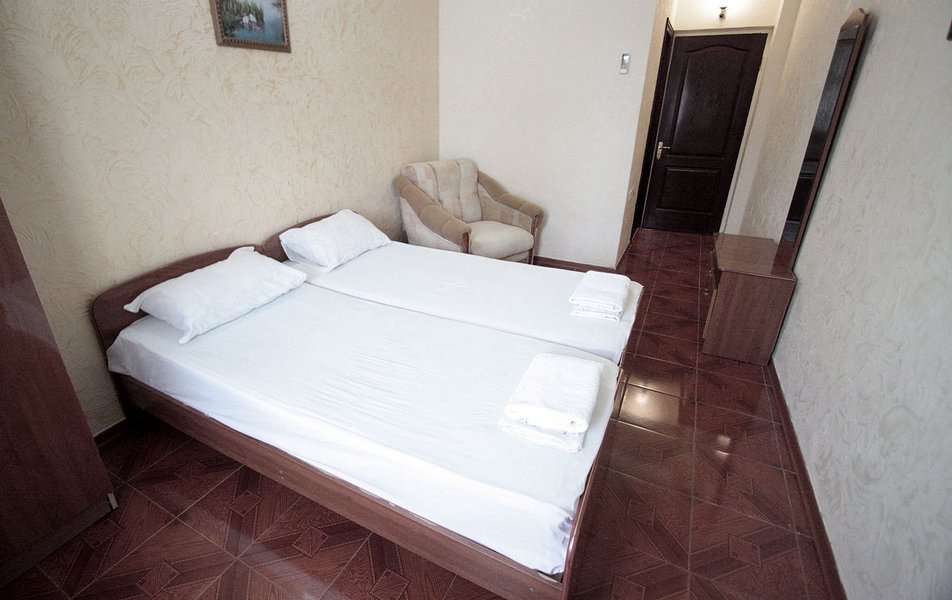 Отдыхали в середине сентября. Бронировали номер за месяц. Хозейва были предупреждены, что едем мы с 2 маленькими детьми. Поселили нас на 4 этаже. Это самый последний этаж. Номер относительно нормальный. Ковёр очень грязный. Предоставили детскую кроватку. Это надо видеть. Вся расшатана, дно вываливается, матрац совершенно не для детского сна, обоссанный и вонючий. В туалете воняет канализацией. Вид из окна поразил. Каждое утро мы просыпались и смотрели на кладбище. Вода воняет ржавчиной. Чистить зубы нет возможности. Есть кондиционер который не чистили лет 5. Торчит пыль. Телевизор показывает плохо. Трансфер платный. 400 от вокзала и 400 обратно. На сайте написано бесплатно!!!! Столовая!!! Неоправданно дорого, все холодное. Не всегда сегодняшнее. Все не накрыто и заветренно. Ходили кушать в "Бригантину" там все очень вкусно и дешевле. Уборка номера в лучшем случае 1 раз в 3 дня. Белье меняют 1 раз в 5 дней. Детская площадка оставила желать лучшего. Игрушки сломанны, все с острыми краями. Для детей до 3 лет там ловить нечего. Басейн чистый, но холодный. Находится в тени. Путь до моря минут 15. На центральном пляже яблоку негде упасть. Песок отвратительно грязный. Приплывает тина. Продукты стоят в 2 раза дороже. Особенно детское питание. Хачи, хачи, хачи кругом хачи. Ощущение что была в Армении.