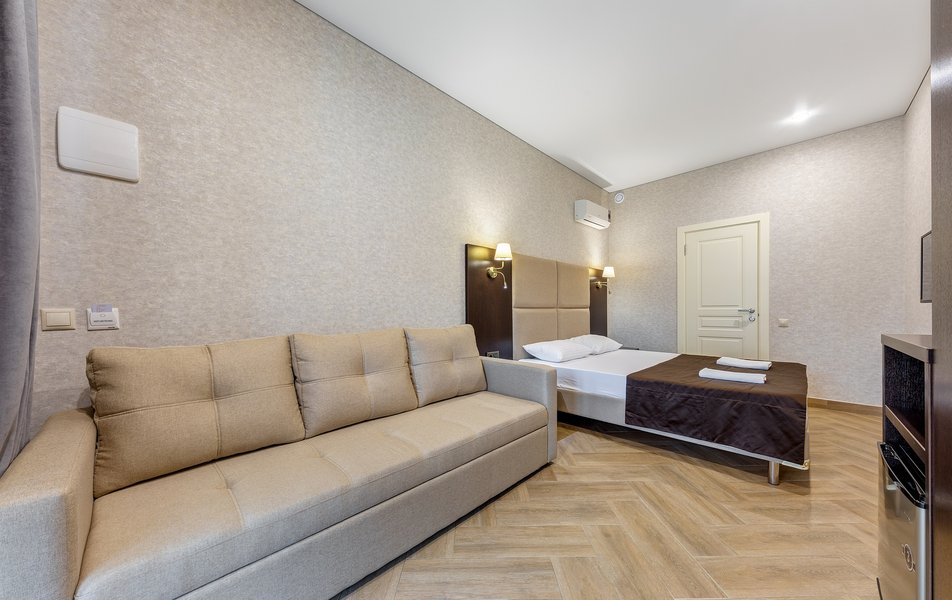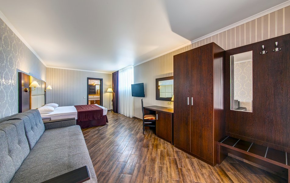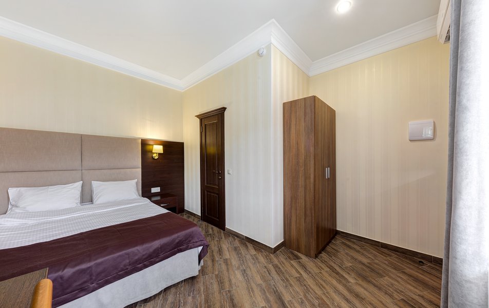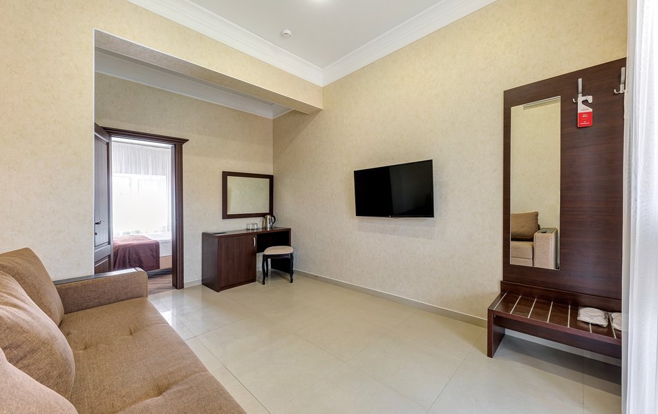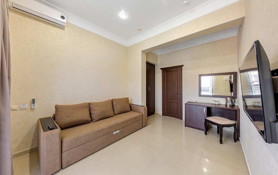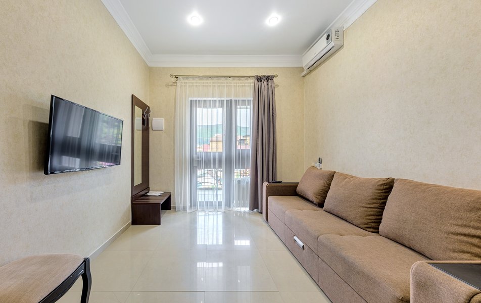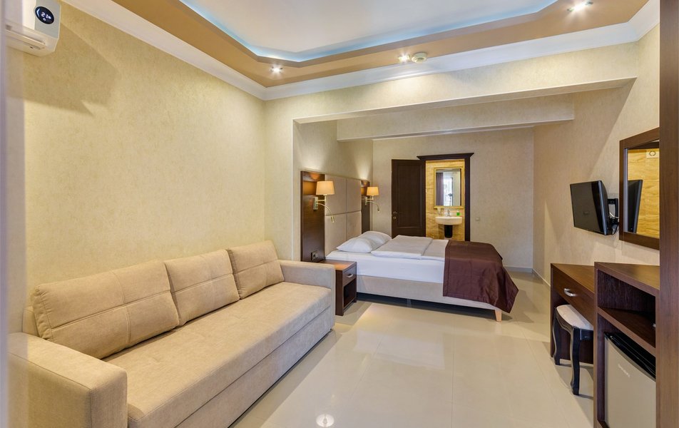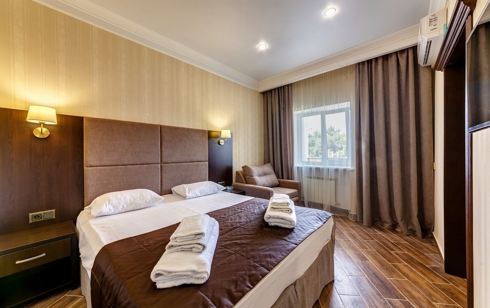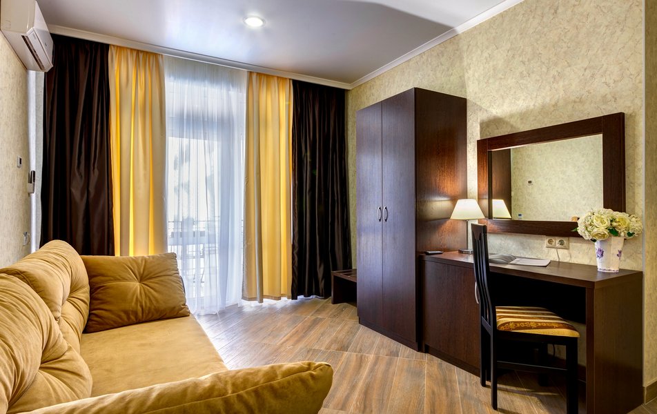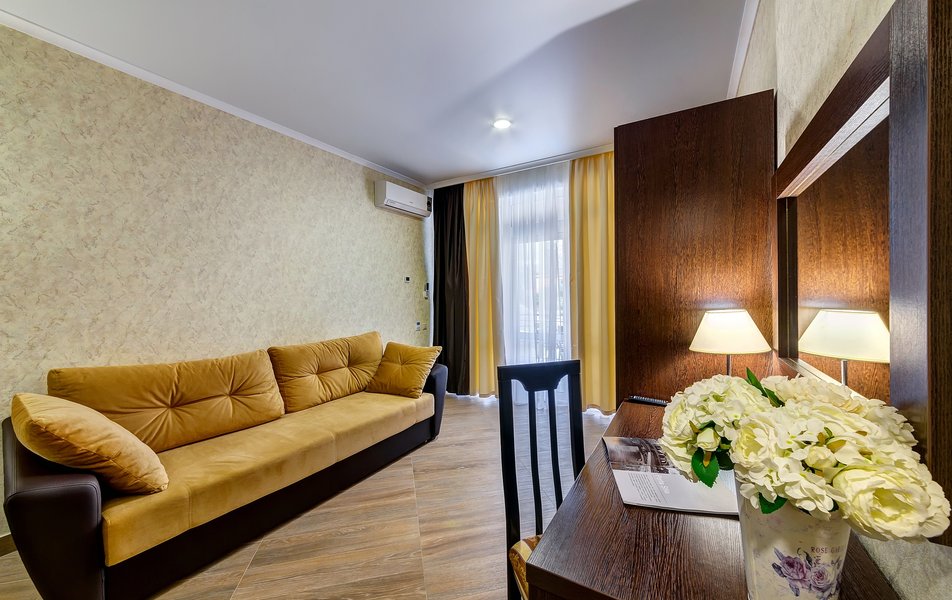 Отель хороший! Номер не большой, но вместительный (полулюкс: прихожая, комната с кроватью и креслом, ванная, холодильник, который не холодил). Номер чистый, убирались каждый день. Если не пускали, настойчиво просили пустить убраться) Персонал вежливый. До набережной и пляжа 5 минут, рядом продуктовый магазин, аптека. Парковка есть, но она в 25 минутах пешком от отеля. Из минусов - завтрак ну очень скудный, однообразный и не вкусный, но найти что поесть можно всегда (яйца, каши, сыр и колбаса, сырники, запеканка). Общий балкон подразумевает, что часто кто-то проходит мимо окна (а дети пробегают :) ) и если не повезет с соседями, то может быть очень шумно. Бассейн есть, но он маленький и почти всегда занят. Лифта нет, узенькая лестница, с чемоданом будет трудно, но вам с ним и не каждый день ходить.Территории у отеля нет, ну это для Геленджика нормально. В номере из доп.удобств был только фен и жидкое мыло, стаканы. Советую выбирать номера повыше этажом и только с видом во двор, на бассейн. Отель рекомендую отдыхающим без претензий)