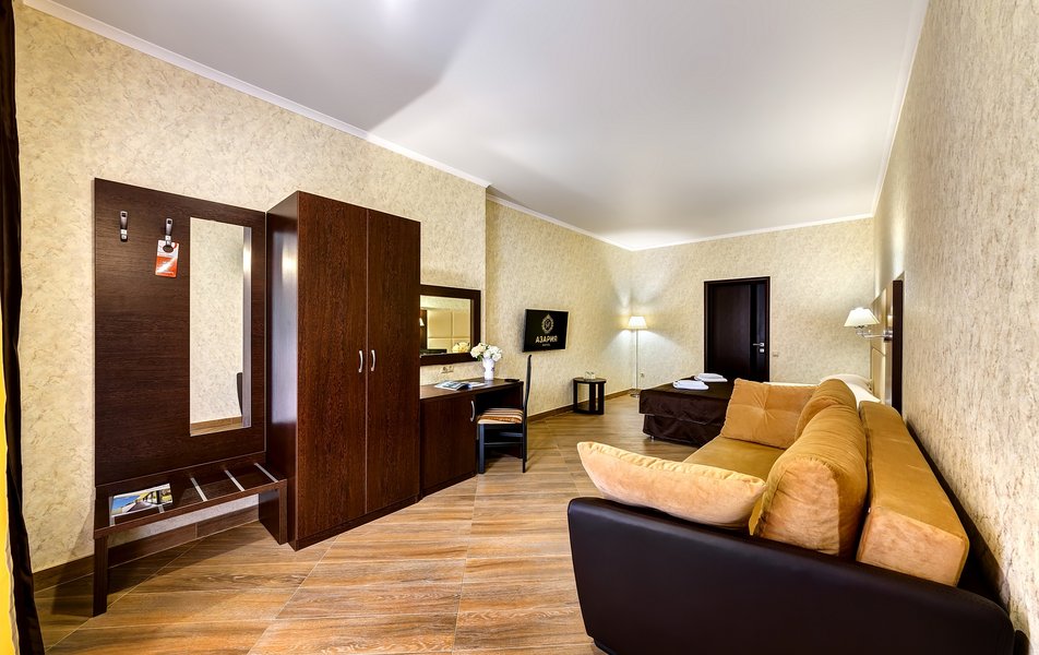 Отель Азария. Нет парковки у отеля, отсылают в другой конец города на парковку от отеля, а она не охраняемая. При полной загруженности отеля столовая не справляется. Уборка номера - плохо. Пол под кровать и диваном не моется, плинтуса до сих пор после клея от ремонта не отмыты, на потолке паутина. Это был люкс номер. Грязь в душевой, плиточные швы в черной плесени. Грязь на балконах, окна не вымыты. Питание как домашнее. Без изысков. Дают спиртное в обед и ужин. Мороженое самое простое 2 вида в полдник. Пироги 1 вид каждый день. Бассейн чистый, но без подогрева. Нет никакой анимации, детям делать нечего.