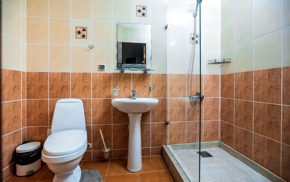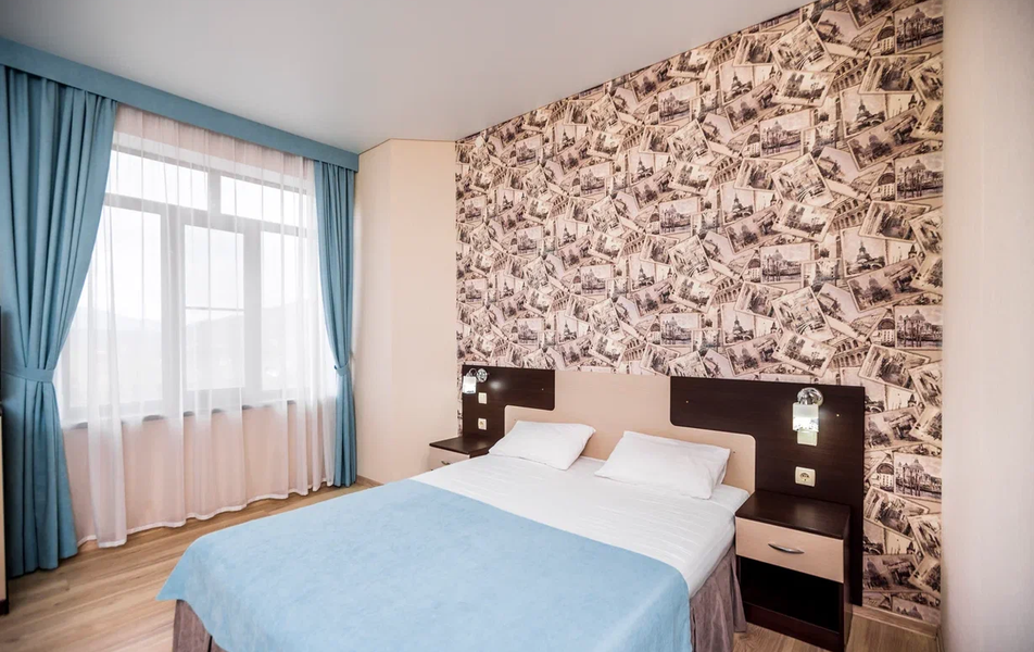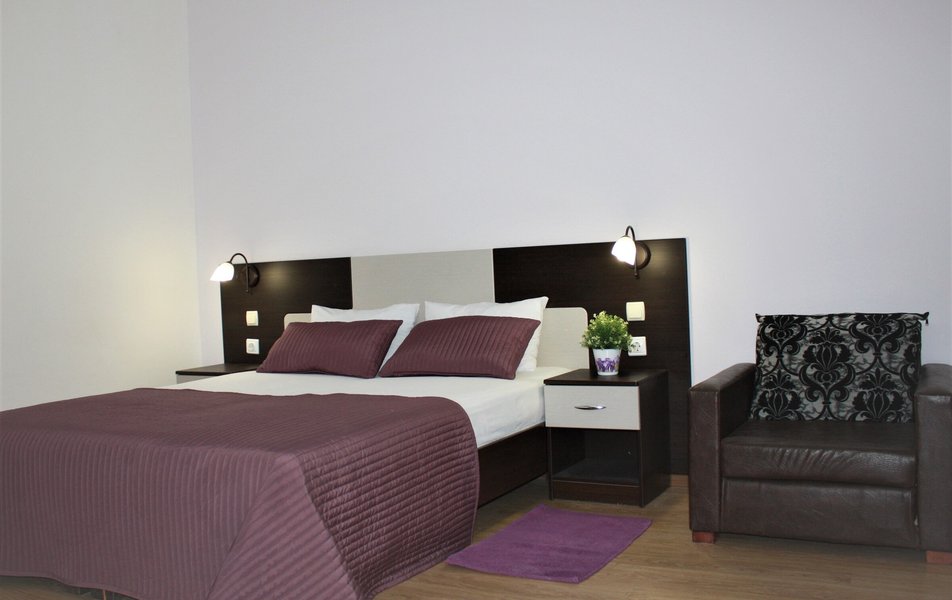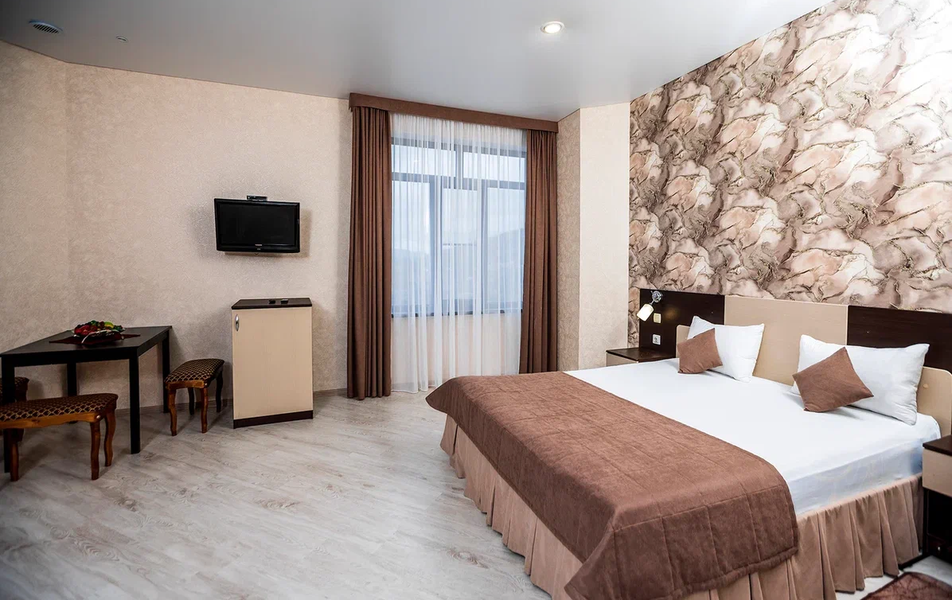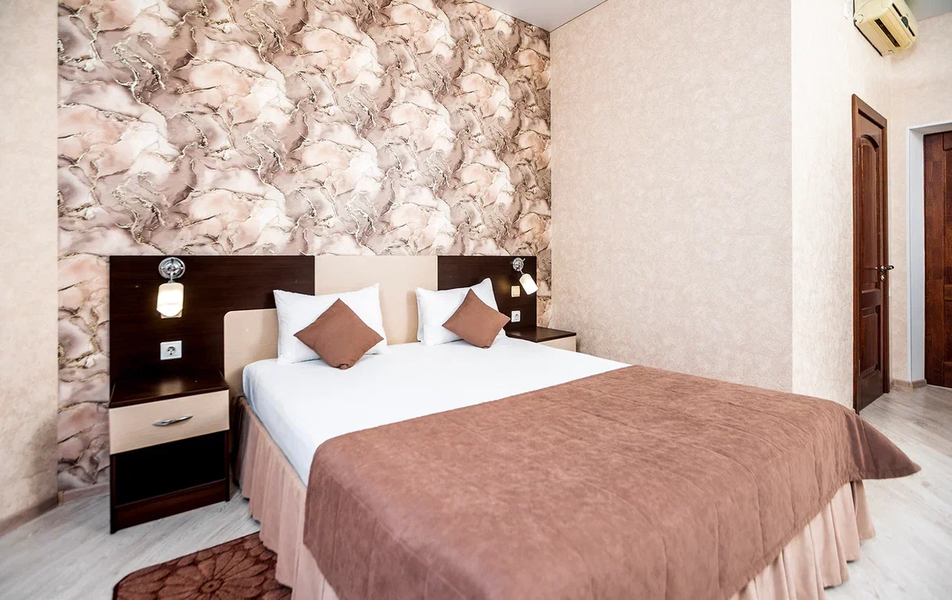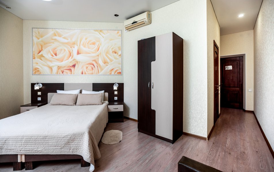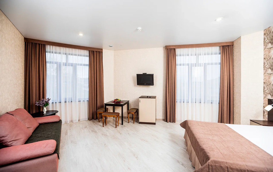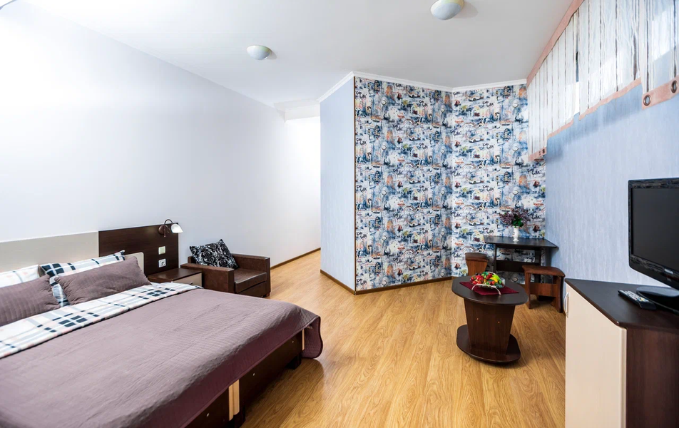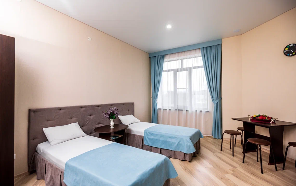 Стандартный 2-местный Количество комнат: 1-комнатный Тип номера: Стандартный Кол-во основных мест: 2 Площадь (кв. м): 23 Мебель: вешалка, зеркало, кресло, кровать двуспальная, прикроватные тумбочки, столик журнальный, стулья, тумба, шкаф Оборудование: набор посуды, сплит-система, телевизор, холодильник, электрочайник Санузел: с душевой кабиной, туалетные принадлежности Сервис: Wi-Fi бесплатно, смена полотенец, смена постельного белья, уборка номера