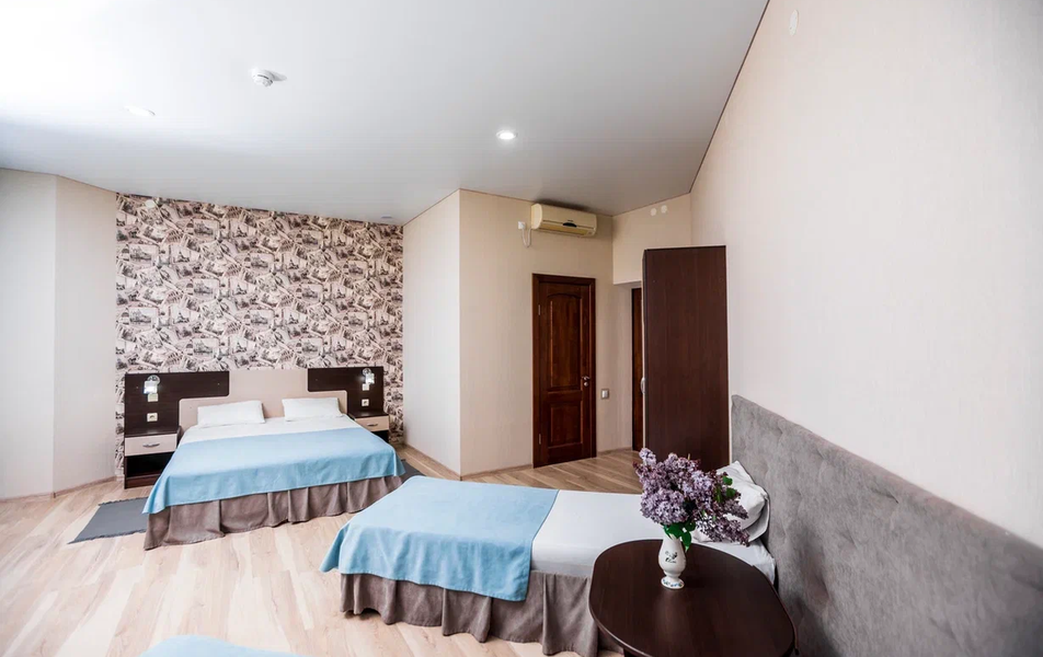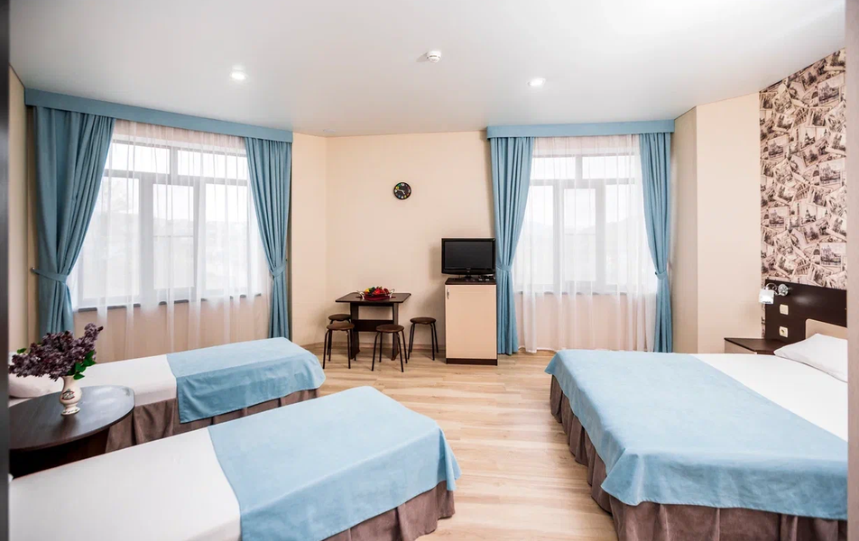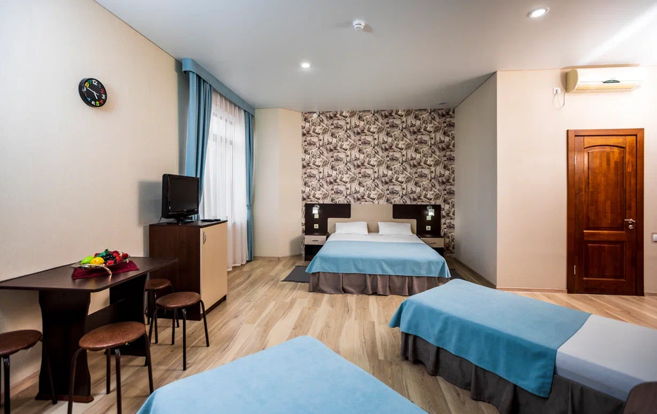 Стандартный 3-местный Количество комнат: 1-комнатный Тип номера: Стандартный Кол-во основных мест: 3 Площадь (кв. м): 23 Мебель: вешалка, диван раскладной, зеркало, кровать двуспальная, прикроватные тумбочки, стол, столик журнальный, стулья, тумба, шкаф Оборудование: набор посуды, сплит-система, телевизор, холодильник, электрочайник Санузел: с душем, туалетные принадлежности Сервис: Wi-Fi бесплатно, смена полотенец, смена постельного белья, уборка номера