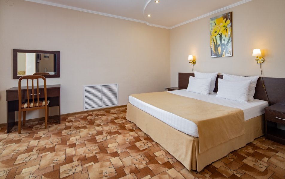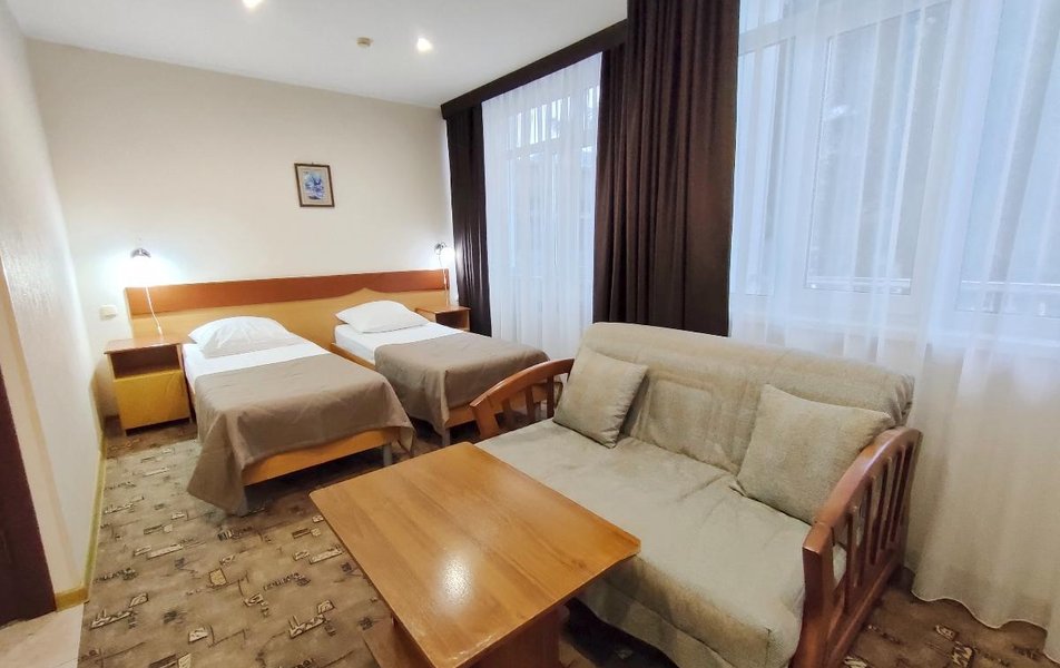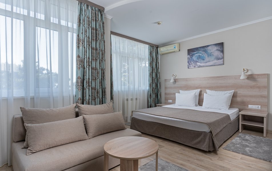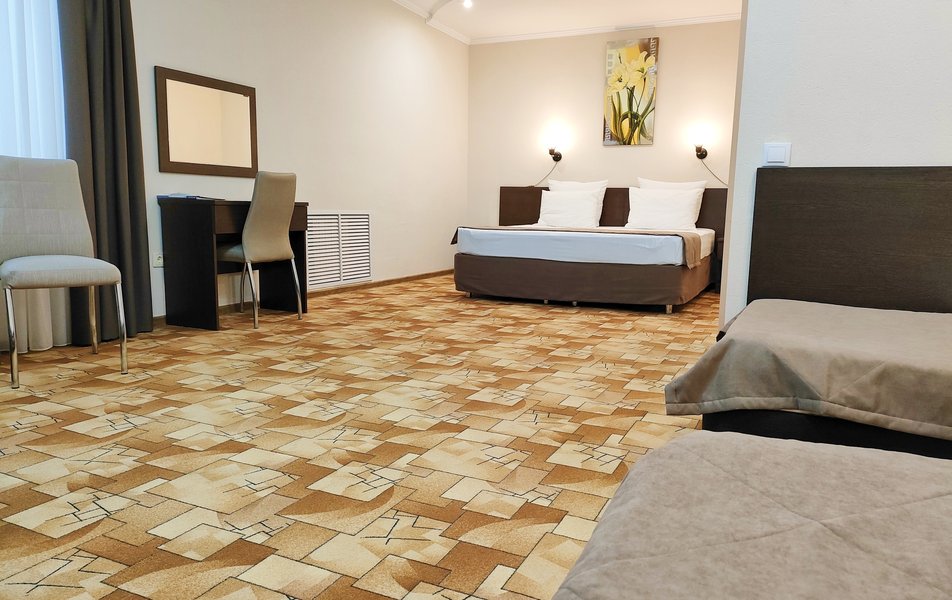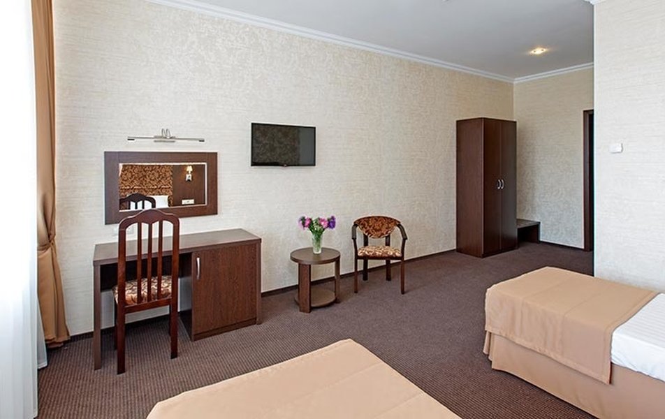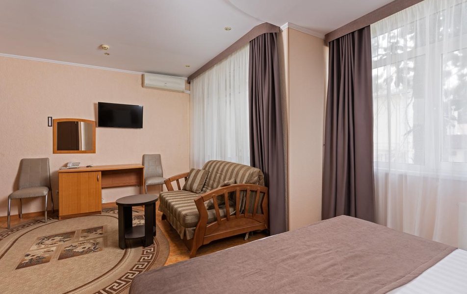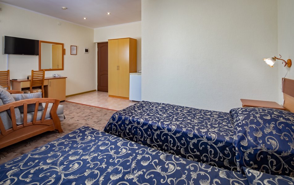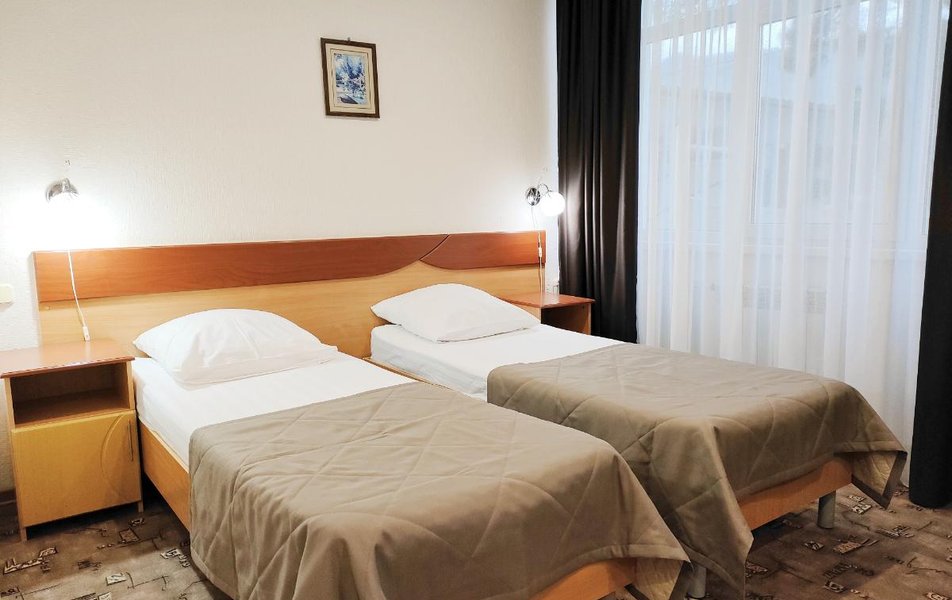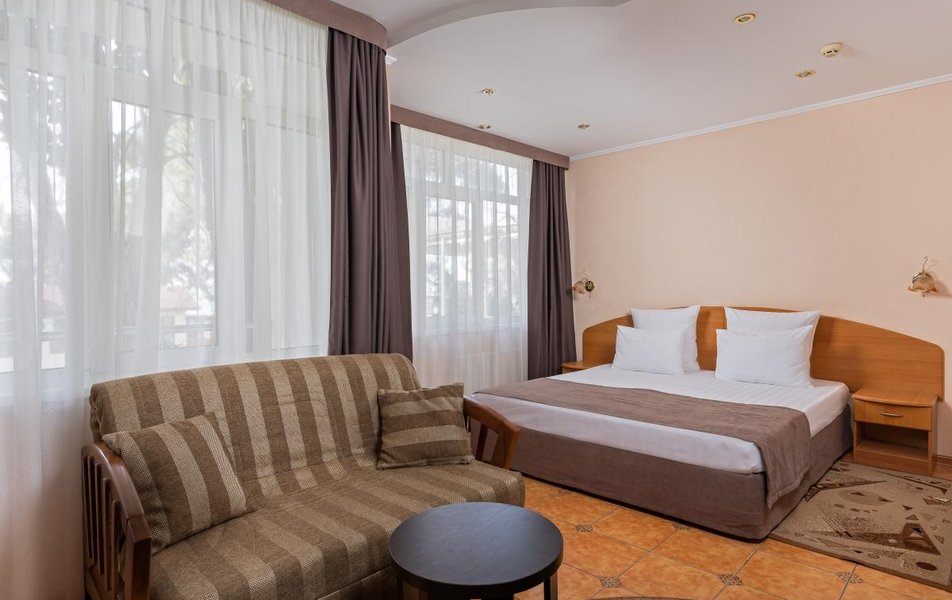 Екатерина Сафиуллина Отдыхали семьёй за свой счёт не по путевке. Что хочется сказать из плюсов первое это бассейн и локация. До моря 1 мин. Все остальное сплошной минус. Начнем с номера: окно открыть невозможно, запах канализации невозможный. Полотенец пляжных нет. На телевизоре один канал. Сантехника в ванной о боже ( воду нужно открывать очень тихо, иначе вас так окатит. Жуть. Далее переходим к питанию. Да шведский стол, нооооо! Каждый день на протяжении двух недель: макароны,гречка,рис и тефтели, курица жареная. Компот и морс один и тот же. Ни пюре картофельного, не картошки по деревенски. Один раз были вареники с картошкой если это можно назвать так. Сплошная каша теста в перемешку с картошкой. Это треш. Ни выпечки, ни сладостей, на ужин нет кисломолочной продукции от слова совсем. Обед и ужин одно и то же каждый день в течении 14 дней. За исключением того,что в обед супы. Да оно вкусно, нооооо одно и тоже 14 дней три раза в день. Это через 4 дня до тошноты. Хочется покушать отбивные, пельмени, манты. Выпить чай с пироженкой. Ноо к чаю печенье с начинкой , разрезанное на две или три части каждая Стоимость не малая, мы за 12 дней отдали 270 тысяч на 4 человека. Не рекомендую от слова совсем данный отель за такие деньги. Если за вас оплачивает предприятие, то да. Не обидно будет. Но за свой счёт ни в коем случае. Социальная столовая причем очень социальная за 270 тысяч и запах канализации это ужасно. Вечером ходили в 5 ку и покупали ночной дожор))) . То есть отдай такие деньги и ещё покупай еду. Пансионат больше подходит, чем отель к данному заведению. За стенкой из же столовая, но платная тут вуаля. Разнообразие сразу заметно,ооо платите деньги к тому, что отдали. Вам там и чизкейк и фри детям и соки на выбор. А не морс из вишни 14 дней. Будьте внимательны по брони данного "отеля" .