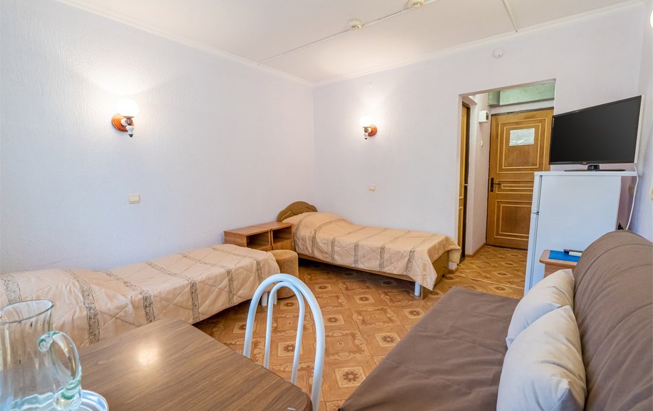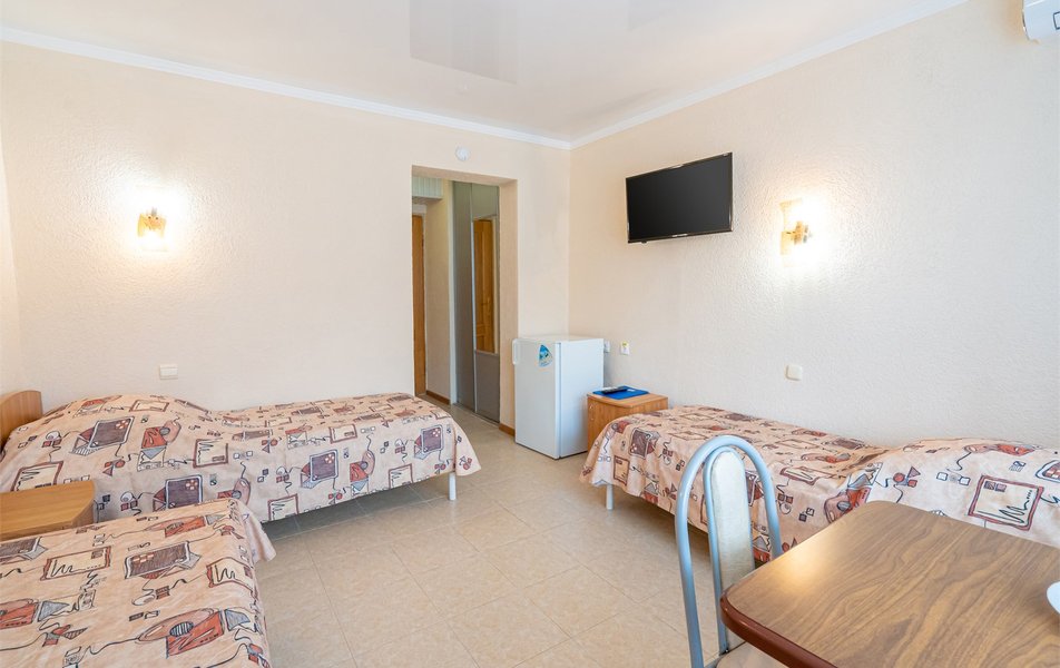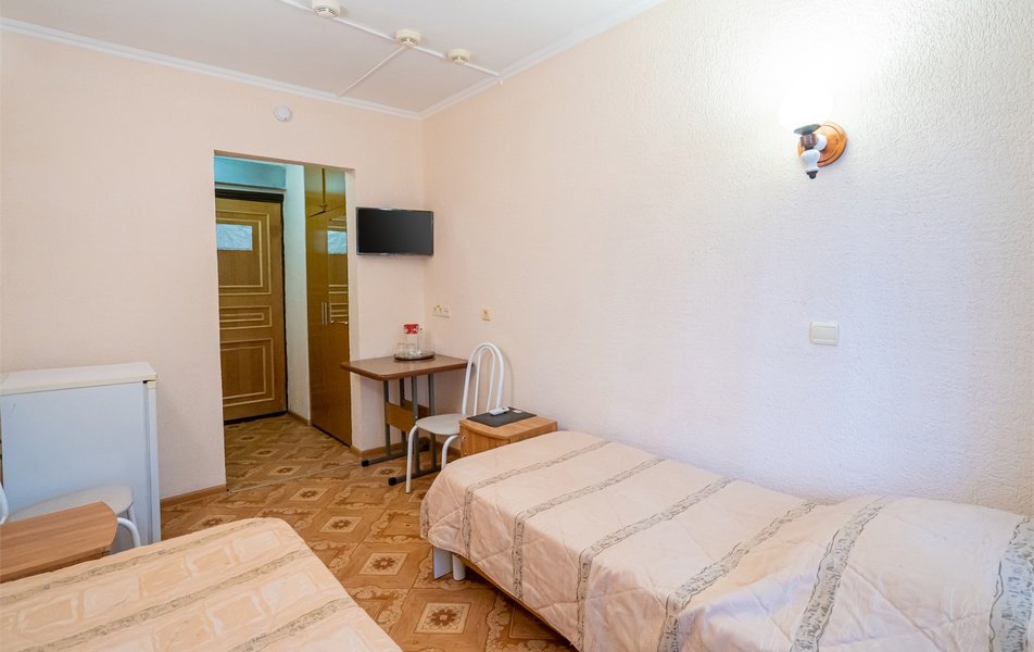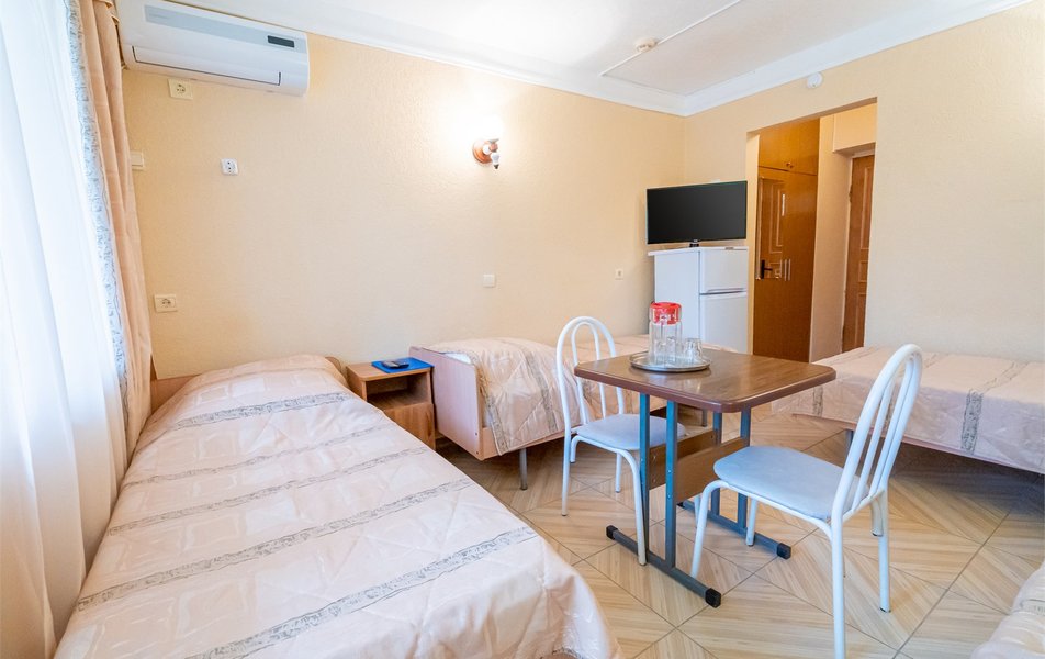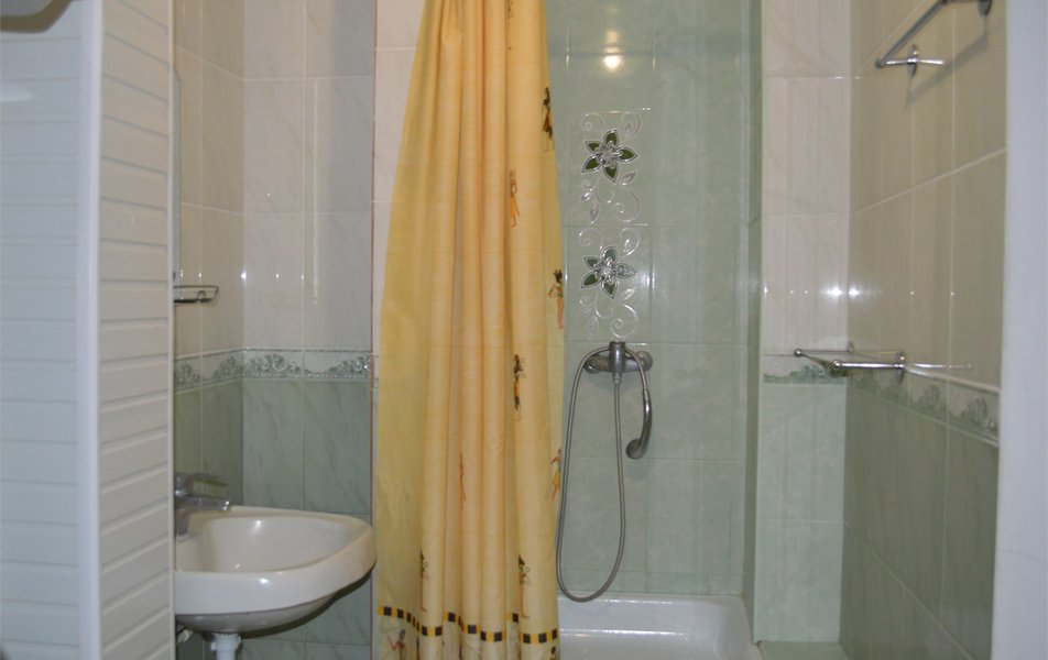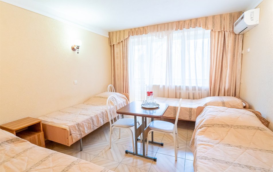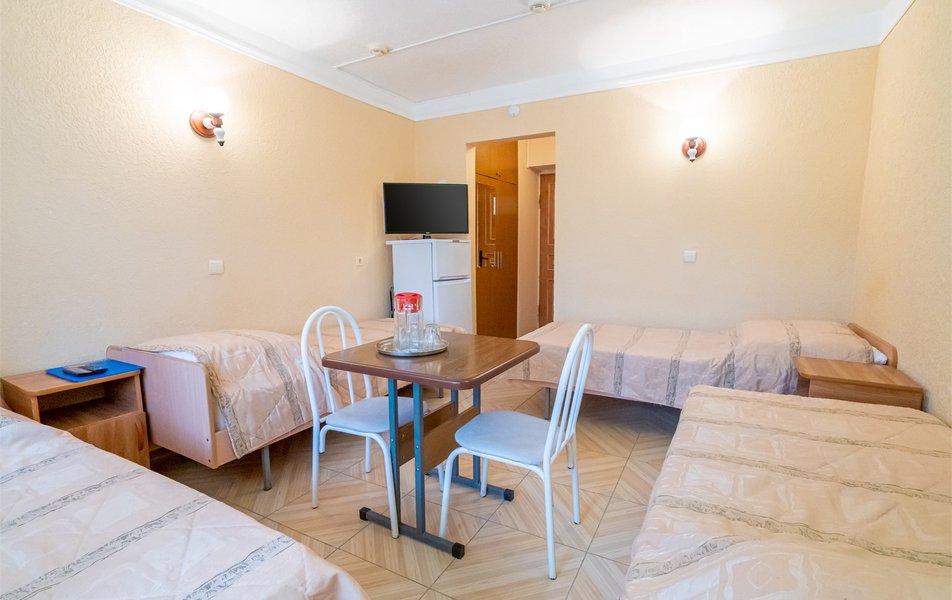 Номер на четверых - стандарт. В сан узле поломано всё что можно. Сломан душ, протекает лейка. Сантехник заменил. Крепление не держит. Плитка вся потресканая. В стояке пробиты дыры, так и не заделаны. Ржавое дно в душе. Стульчак оторван. Розетка для подключения кондиционера разбита. Электрик будет через несколько дней. В комнате нет центральной люстры. Только бра у кроватей. Территория не охраняется и не загорожена, проходит поток людей на пляж и расположен рынок. Собственный пляж он же общественный. Народу не протолкнешься. В столовой не наедаешься. Гарнир, например, рис положат не более столовой ложки. И так во всём. Аниматор - бабуля, с разукрашками для детей приходит по будням.