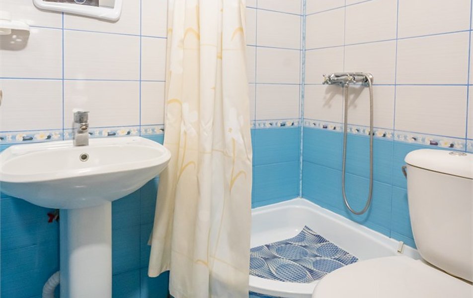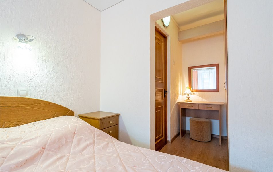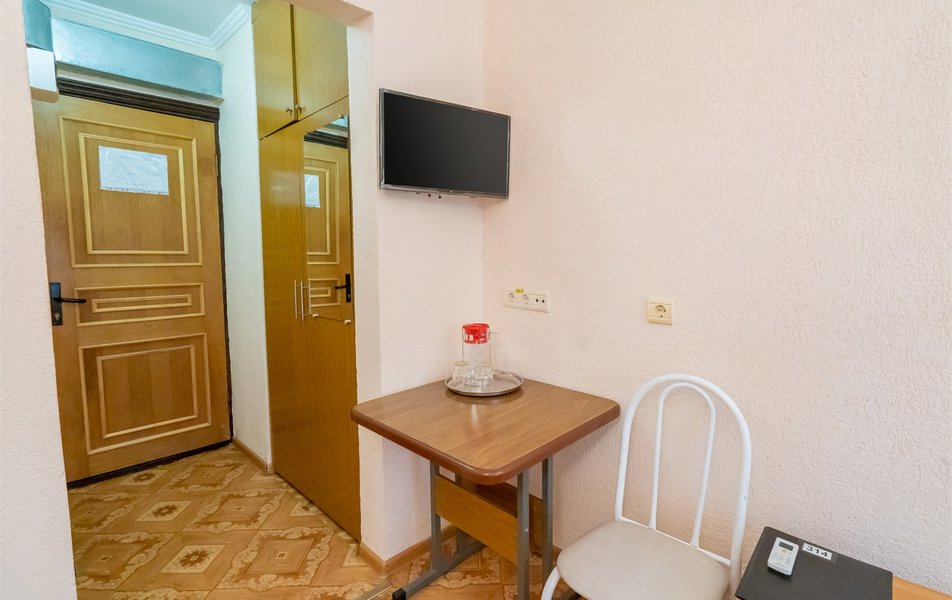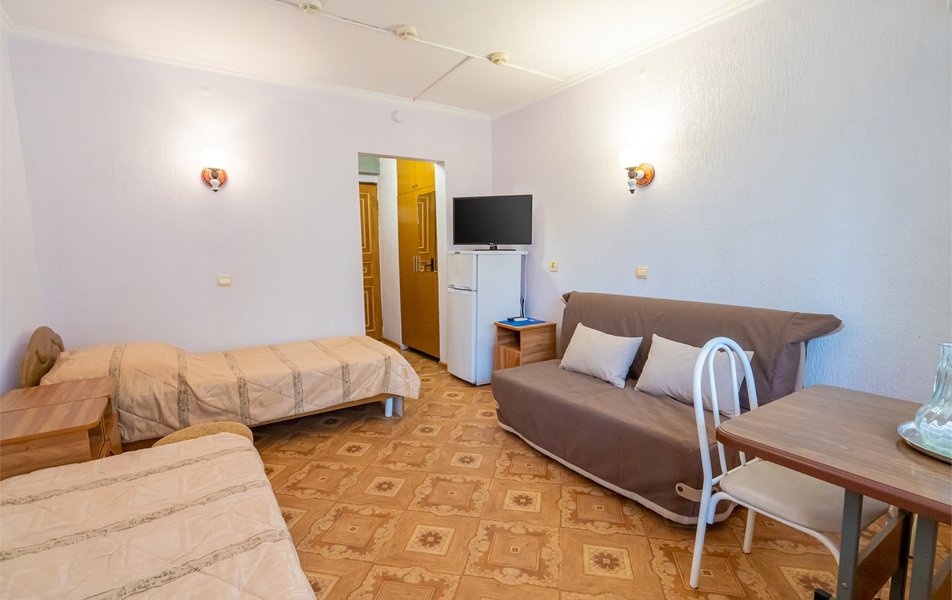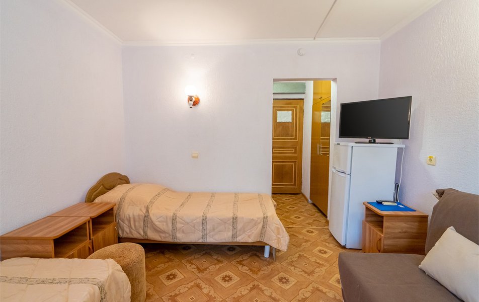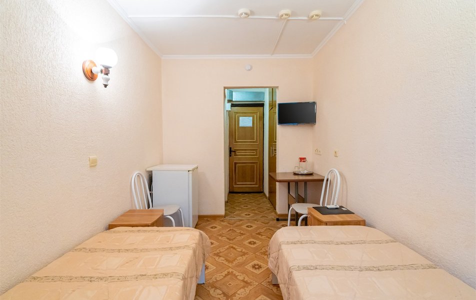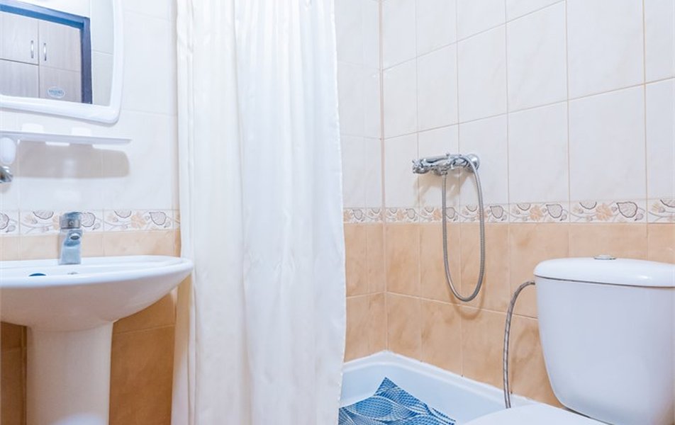 Номер на четверых - стандарт. В сан узле поломано всё что можно. Сломан душ, протекает лейка. Сантехник заменил. Крепление не держит. Плитка вся потресканая. В стояке пробиты дыры, так и не заделаны. Ржавое дно в душе. Стульчак оторван. Розетка для подключения кондиционера разбита. Электрик будет через несколько дней. В комнате нет центральной люстры. Только бра у кроватей. Территория не охраняется и не загорожена, проходит поток людей на пляж и расположен рынок. Собственный пляж он же общественный. Народу не протолкнешься. В столовой не наедаешься. Гарнир, например, рис положат не более столовой ложки. И так во всём. Аниматор - бабуля, с разукрашками для детей приходит по будням.