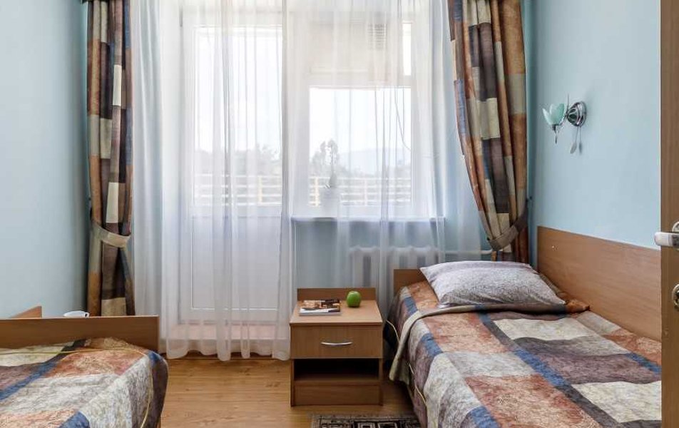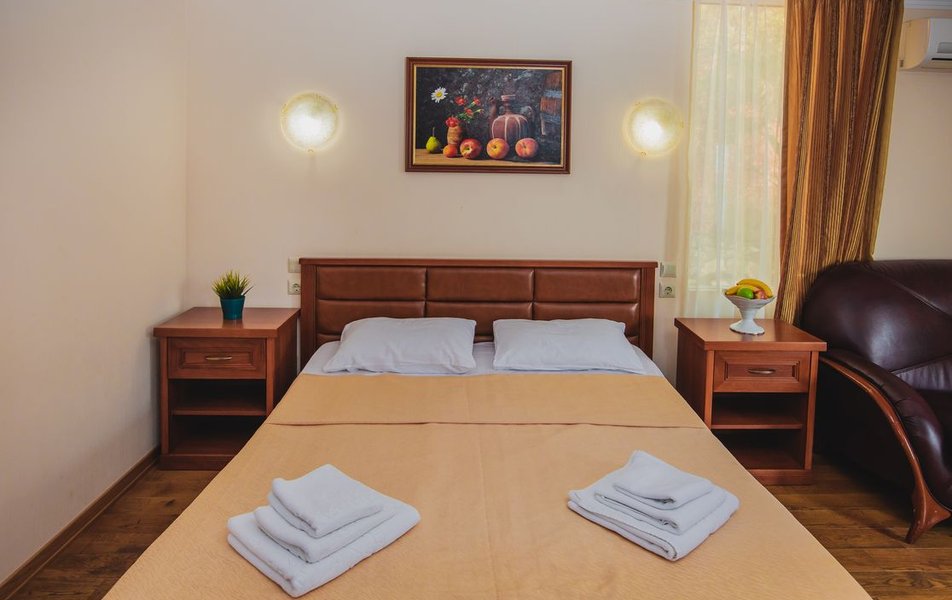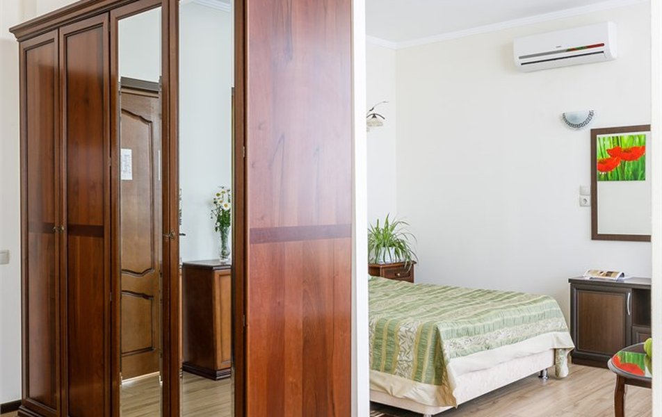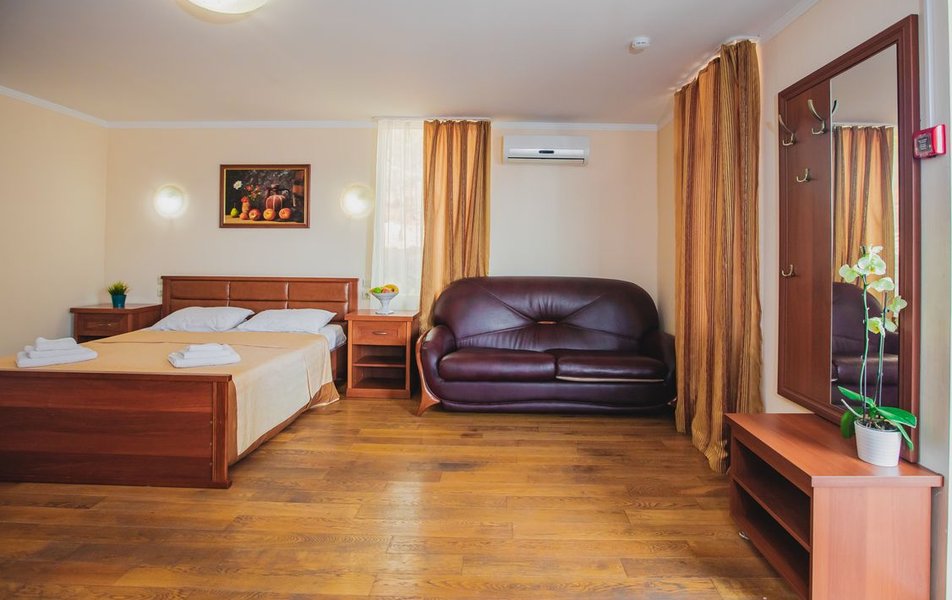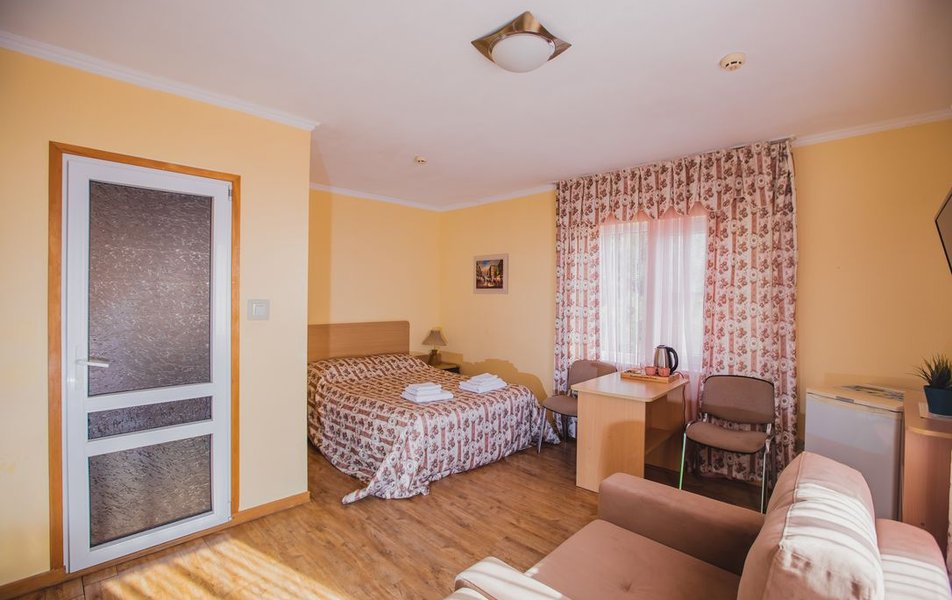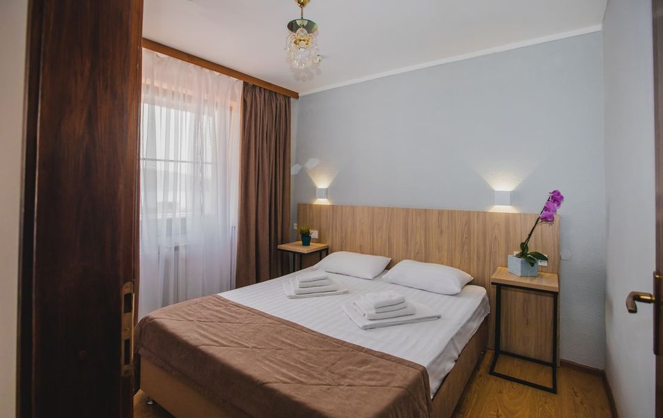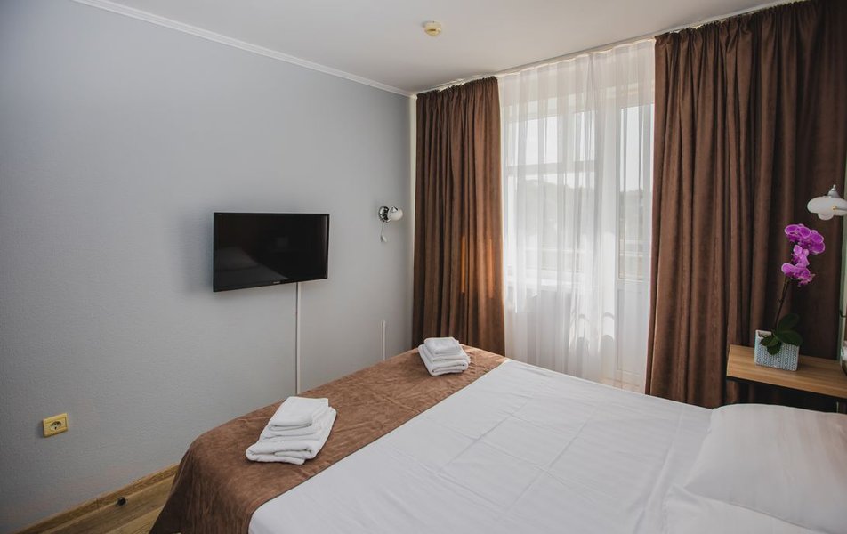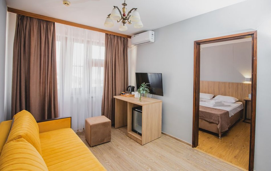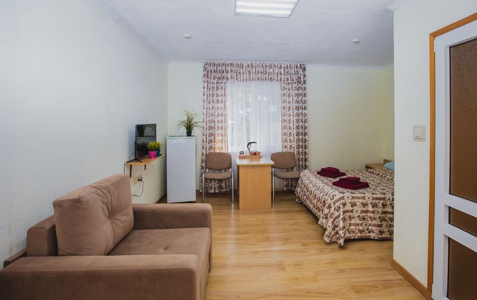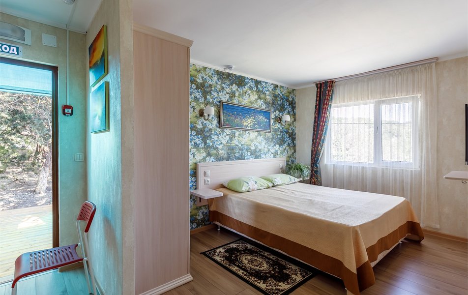 Люкс 2-местный 2-комнатный (вид на горы) Количество комнат: 2-комнатный Тип номера: Люкс Дополнительное место: раскладной диван Вид из номера: на горы Кол-во доп. мест: 2 Кол-во основных мест: 2 Площадь (кв. м): 28 Мебель: вешалка, диван раскладной, зеркало, кресло, кровать двуспальная, прикроватные тумбочки, стол, шкаф Оборудование: сплит-система, телевизор, холодильник, чайный набор посуды, электрочайник Санузел: с душем, туалетные принадлежности, фен Сервис: смена полотенец, смена постельного белья, уборка номера