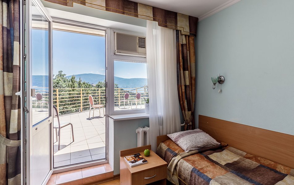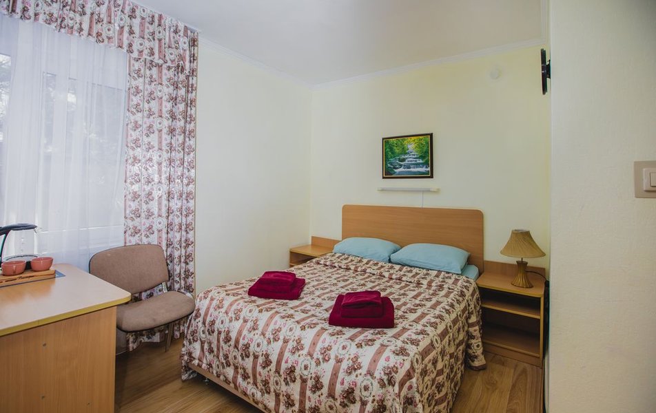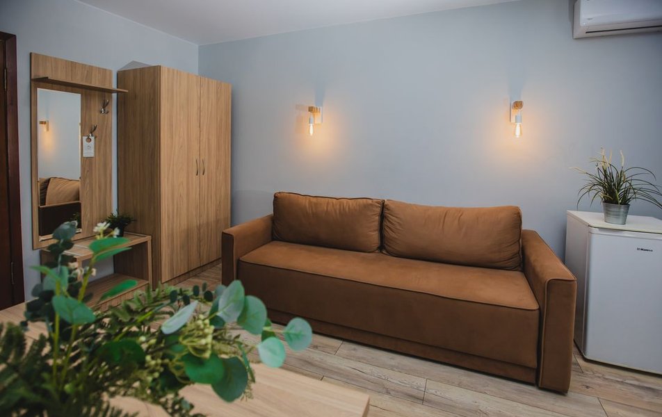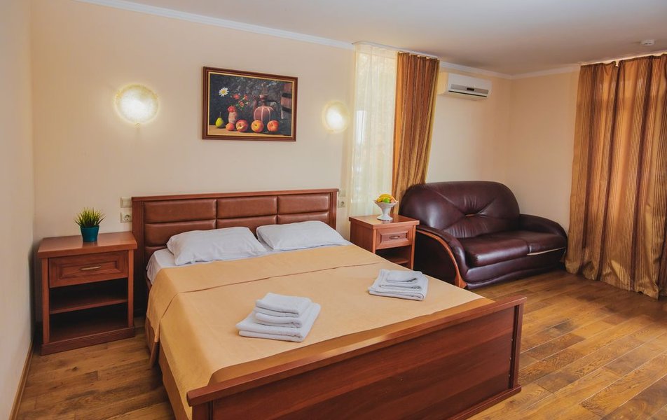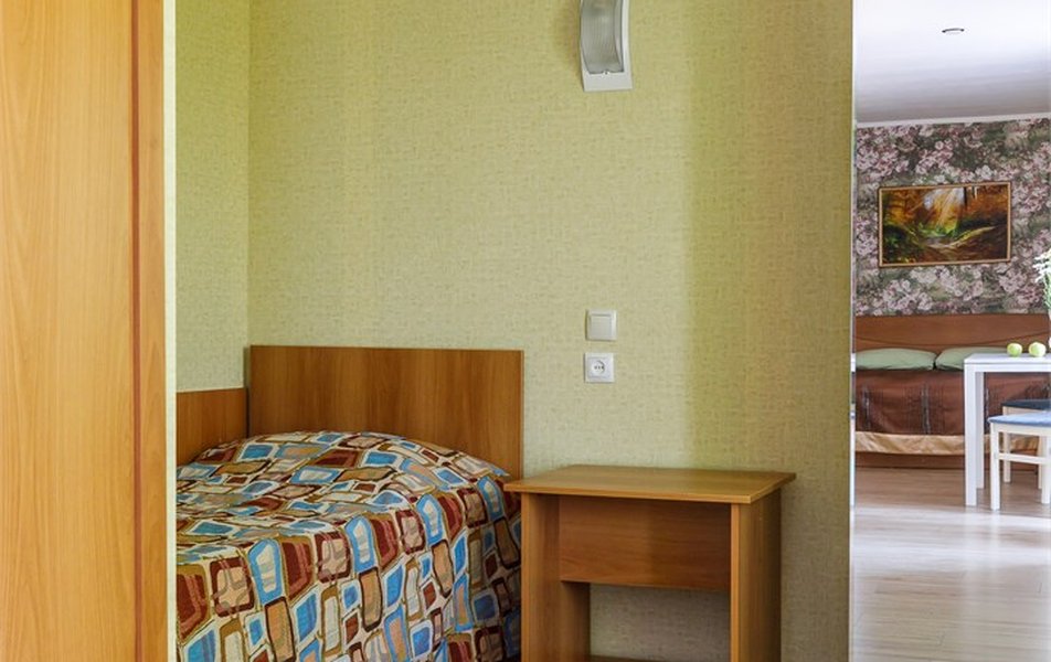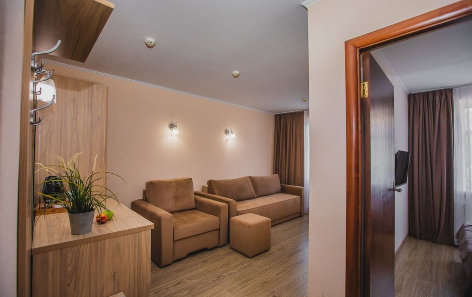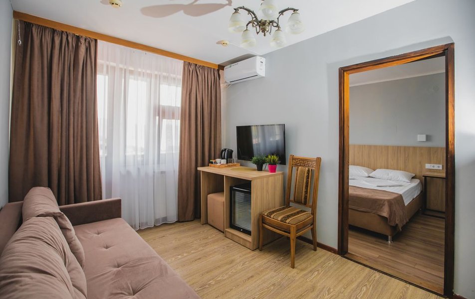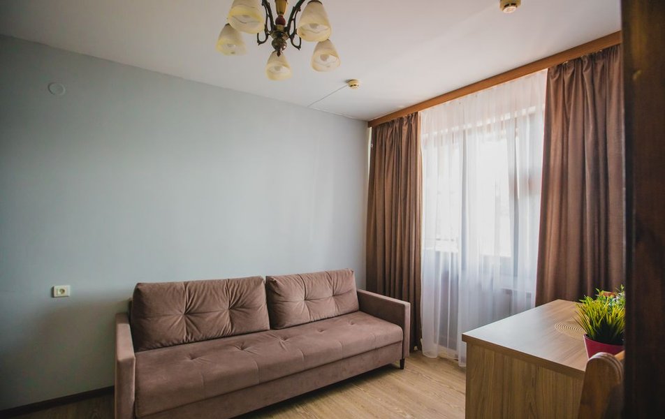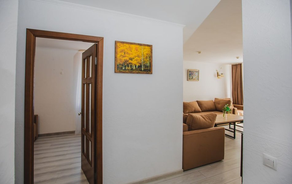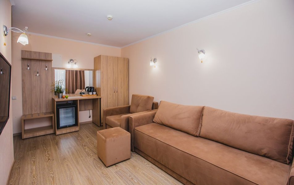 Люкс 2-местный 2-комнатный (вид на горы) Количество комнат: 2-комнатный Тип номера: Люкс Дополнительное место: раскладной диван Вид из номера: на горы Кол-во доп. мест: 2 Кол-во основных мест: 2 Площадь (кв. м): 28 Мебель: вешалка, диван раскладной, зеркало, кресло, кровать двуспальная, прикроватные тумбочки, стол, шкаф Оборудование: сплит-система, телевизор, холодильник, чайный набор посуды, электрочайник Санузел: с душем, туалетные принадлежности, фен Сервис: смена полотенец, смена постельного белья, уборка номера