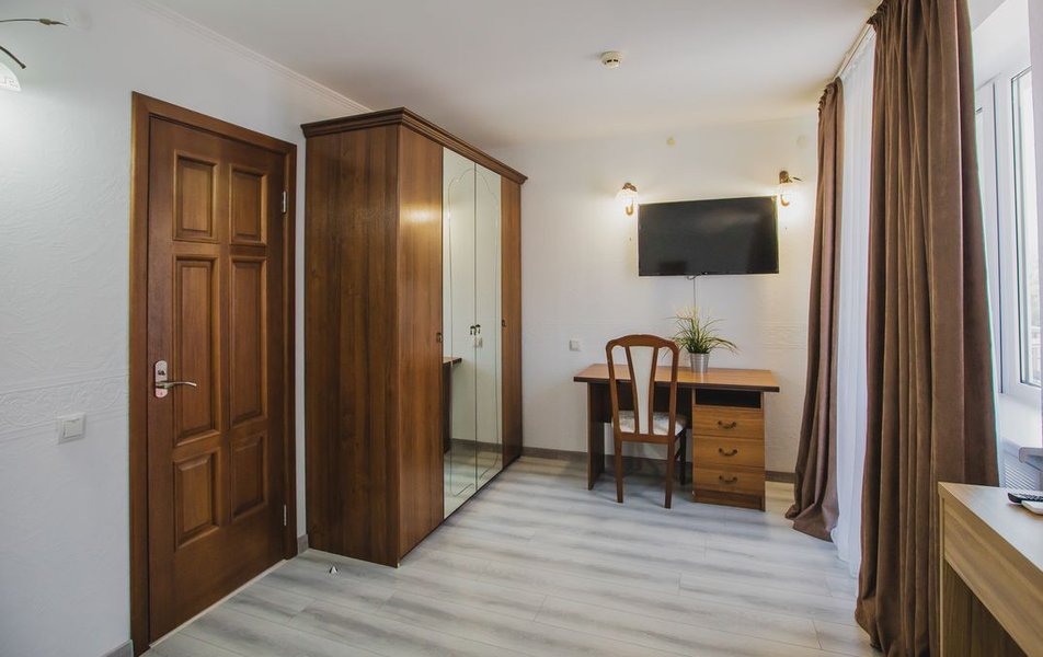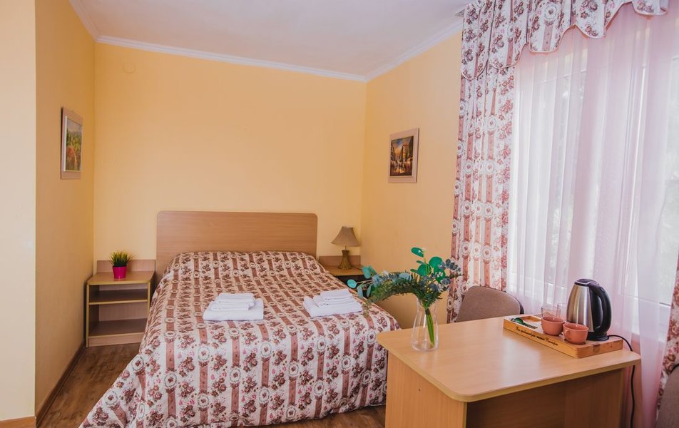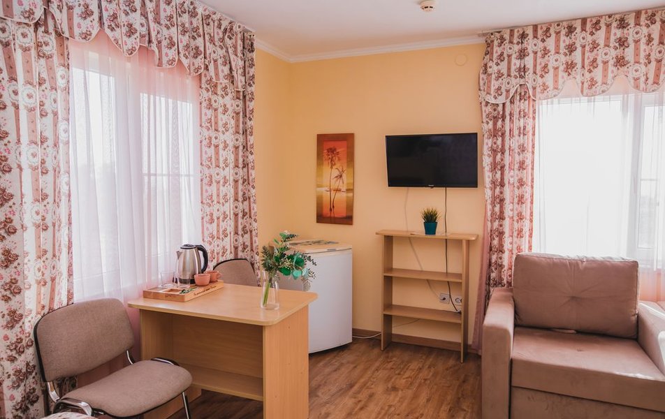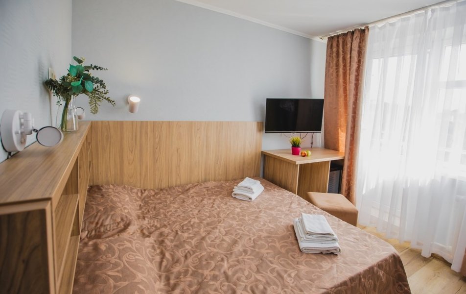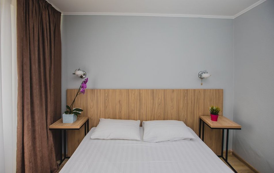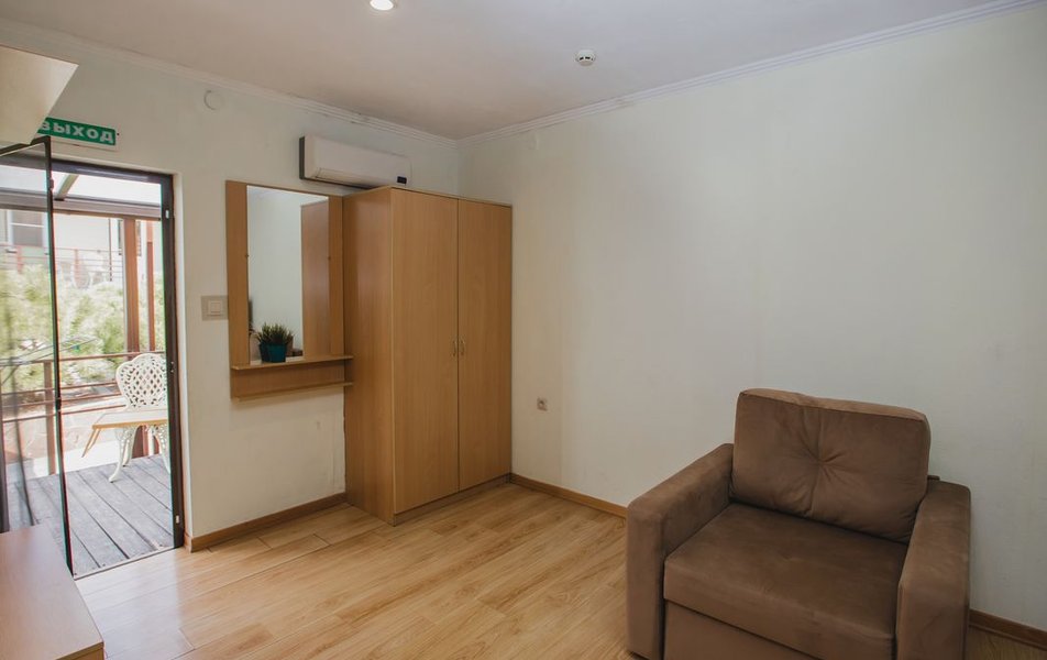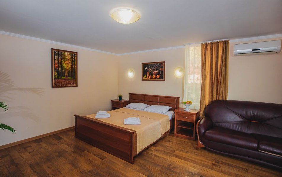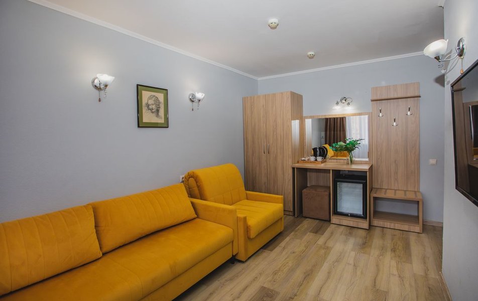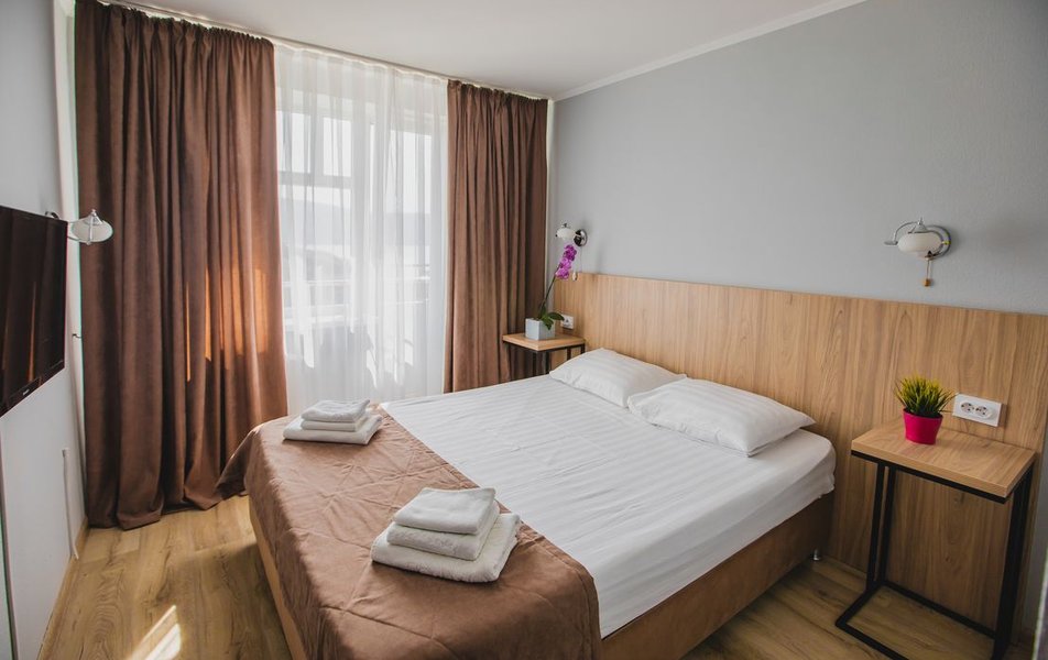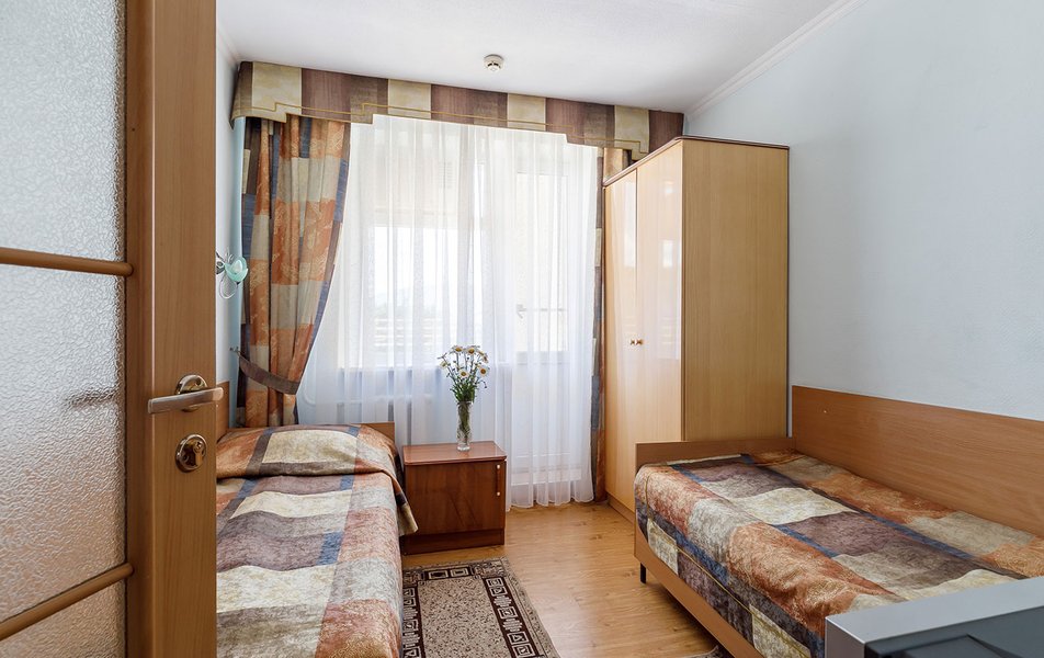 Люкс 2-местный 2-комнатный (вид на горы) Количество комнат: 2-комнатный Тип номера: Люкс Дополнительное место: раскладной диван Вид из номера: на горы Кол-во доп. мест: 2 Кол-во основных мест: 2 Площадь (кв. м): 28 Мебель: вешалка, диван раскладной, зеркало, кресло, кровать двуспальная, прикроватные тумбочки, стол, шкаф Оборудование: сплит-система, телевизор, холодильник, чайный набор посуды, электрочайник Санузел: с душем, туалетные принадлежности, фен Сервис: смена полотенец, смена постельного белья, уборка номера