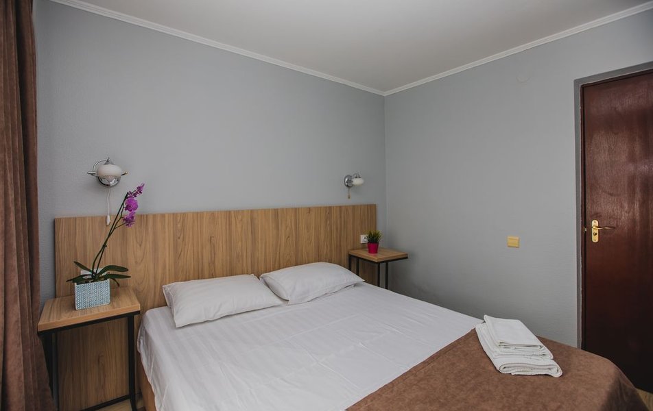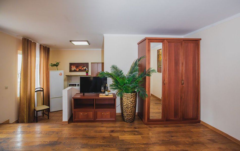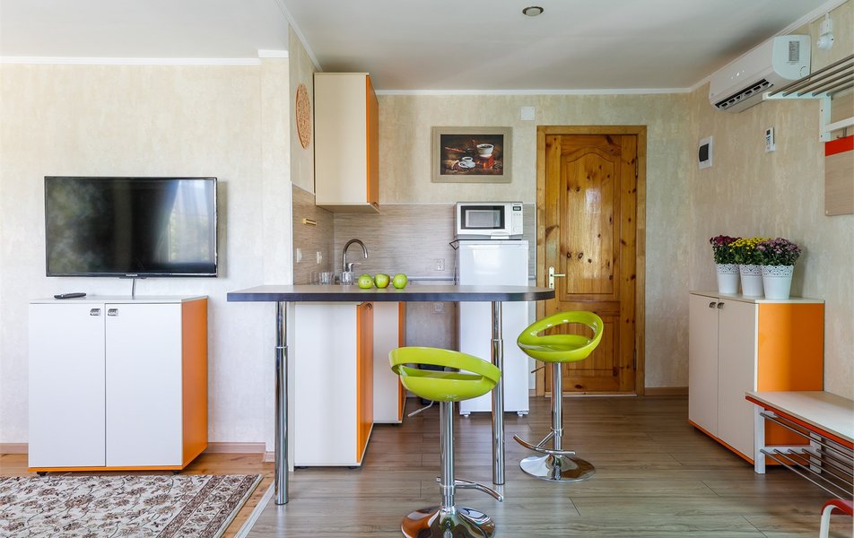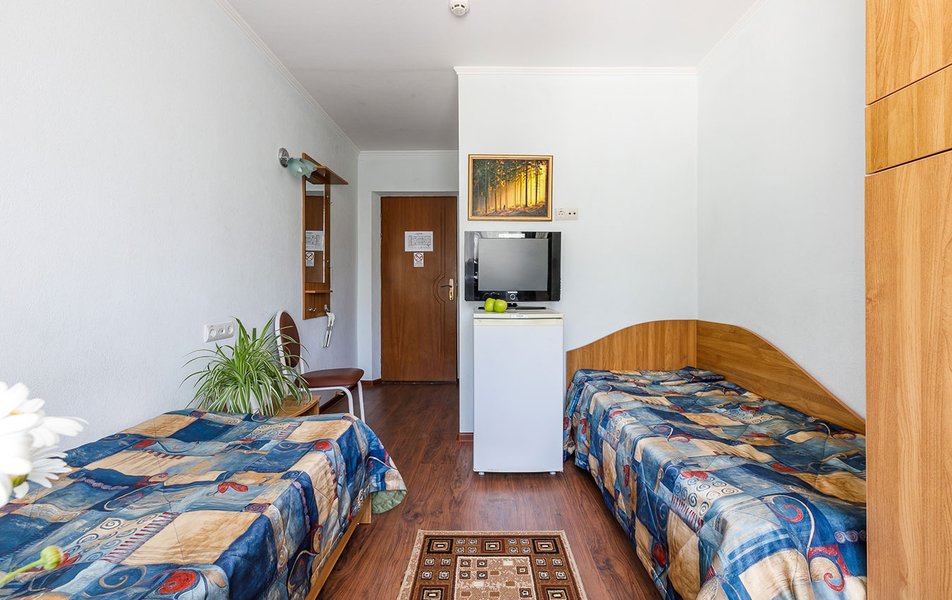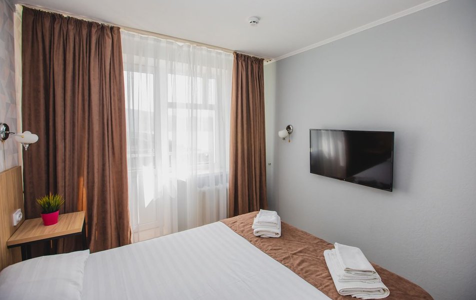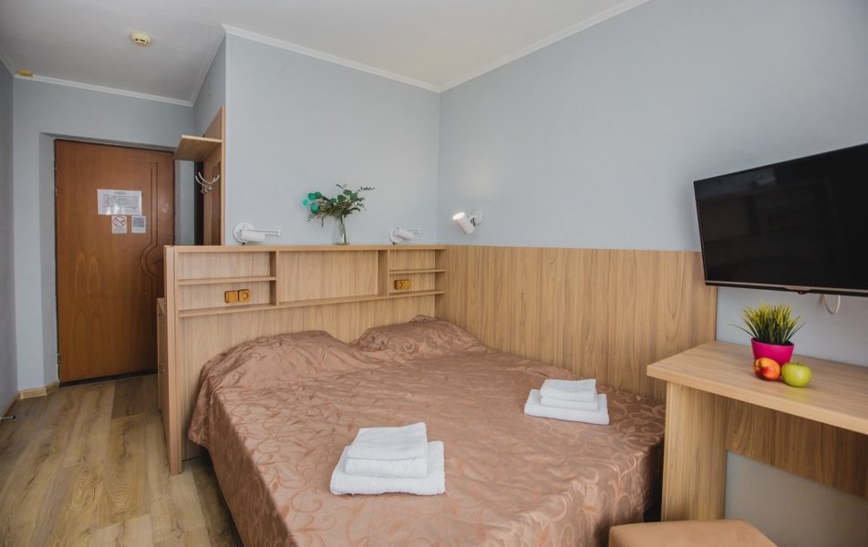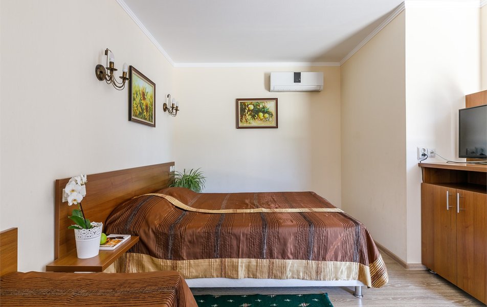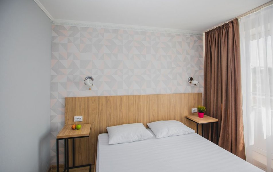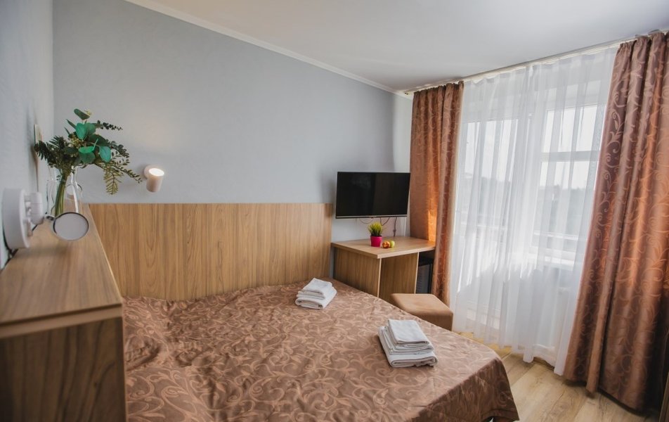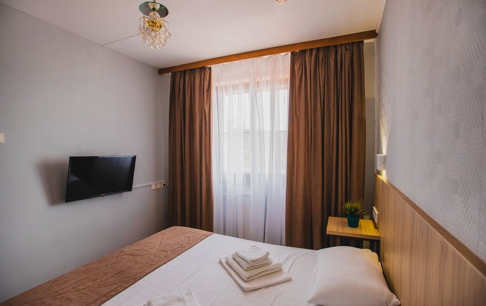 Люкс 2-местный 2-комнатный (вид на горы) Количество комнат: 2-комнатный Тип номера: Люкс Дополнительное место: раскладной диван Вид из номера: на горы Кол-во доп. мест: 2 Кол-во основных мест: 2 Площадь (кв. м): 28 Мебель: вешалка, диван раскладной, зеркало, кресло, кровать двуспальная, прикроватные тумбочки, стол, шкаф Оборудование: сплит-система, телевизор, холодильник, чайный набор посуды, электрочайник Санузел: с душем, туалетные принадлежности, фен Сервис: смена полотенец, смена постельного белья, уборка номера