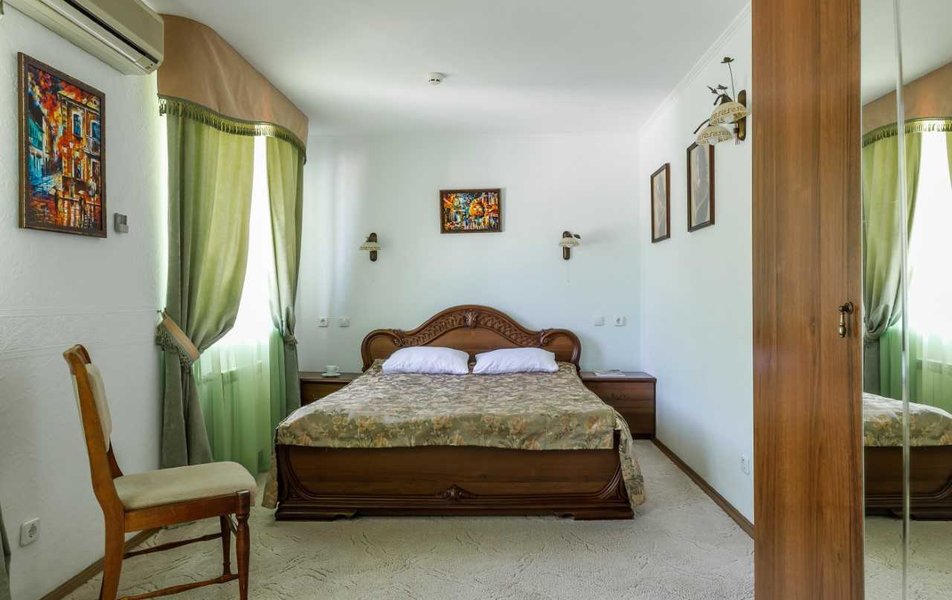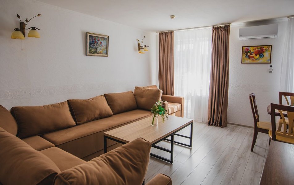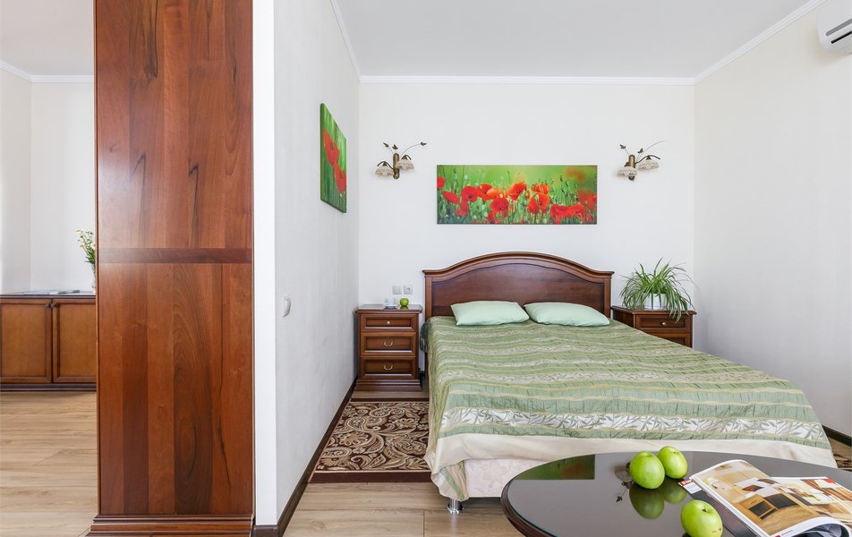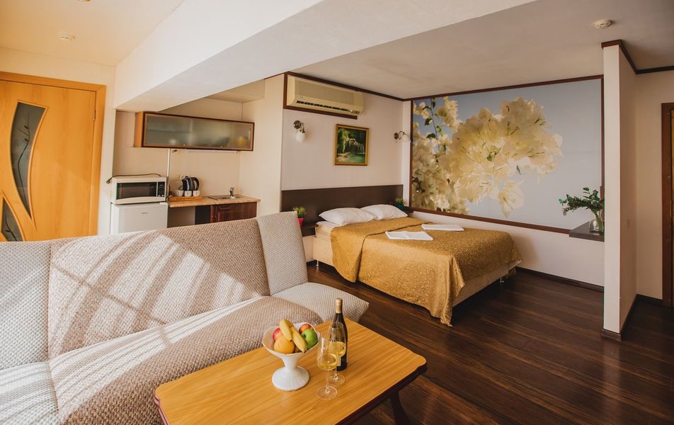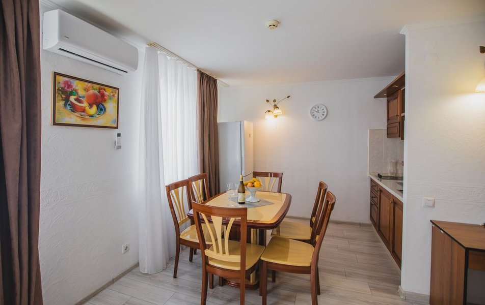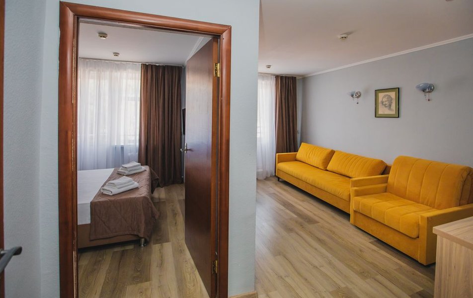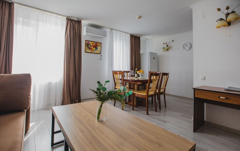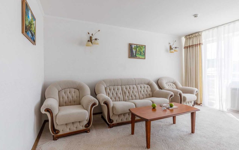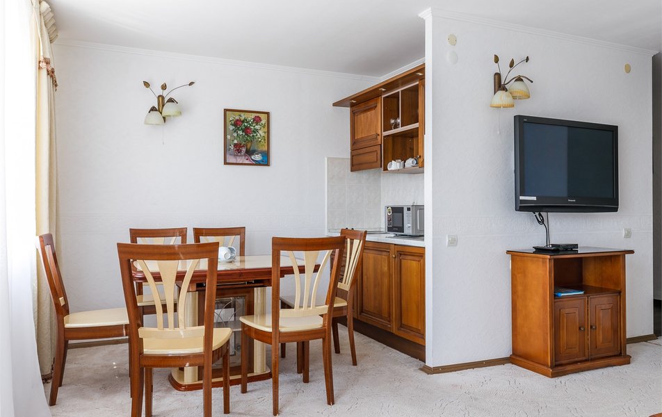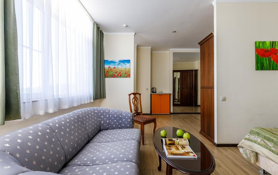 Люкс Апартаменты 2-местный 3-комнатный Количество комнат: 3-комнатный Тип номера: Люкс Дополнительное место: 2 дивана: и кресла-кровати Кол-во доп. мест: 4 Кол-во основных мест: 2 Площадь (кв. м): 60 Балкон: с мебелью Мебель: вешалка, диван раскладной: 2, зеркало, кресла, кровать двуспальная, кухонная мебель, прикроватные тумбочки, столик журнальный, столик туалетный, стол обеденный, стулья, шкаф Оборудование: микроволновая печь, набор посуды, сплит-система, телевизор, холодильник, чайный набор посуды, электрочайник Санузел: 2 санузла, биде, с душевой кабиной, туалетные принадлежности, фен Сервис: смена полотенец, смена постельного белья, уборка номера