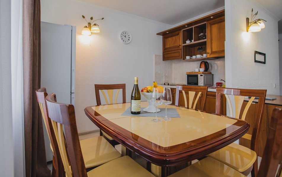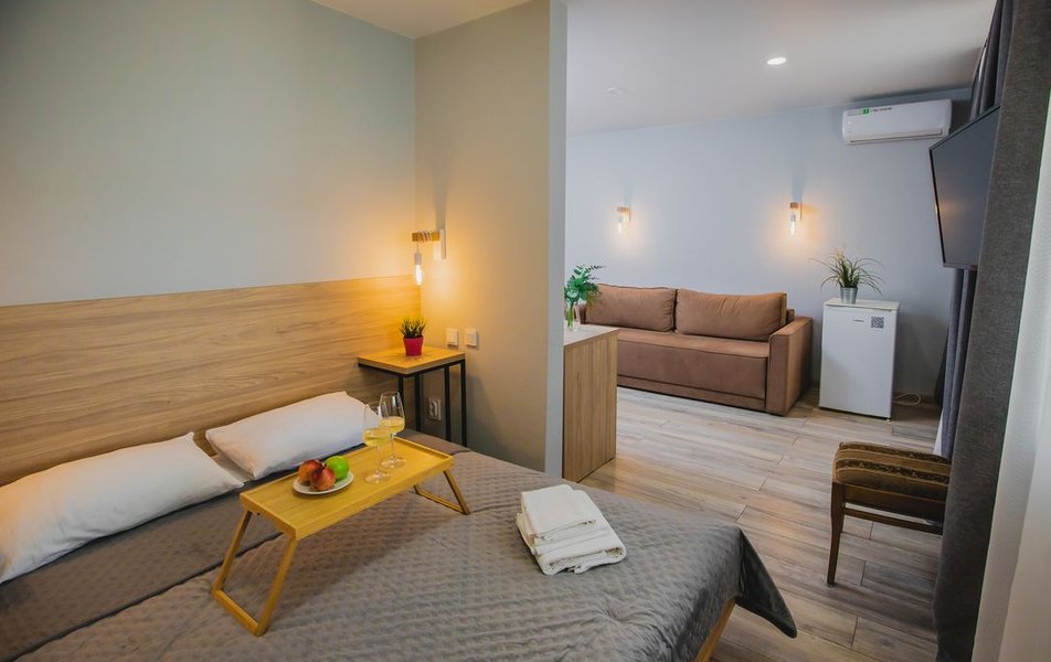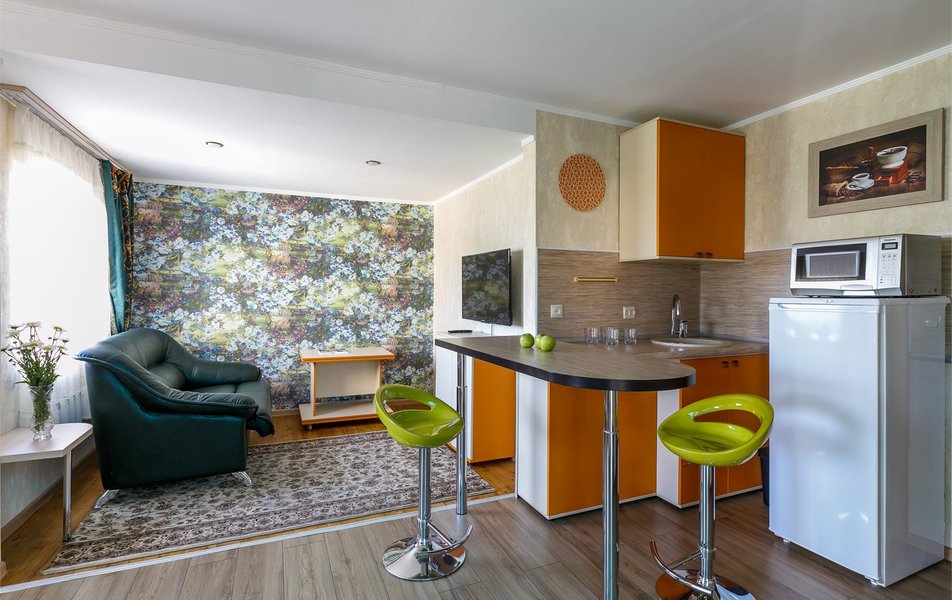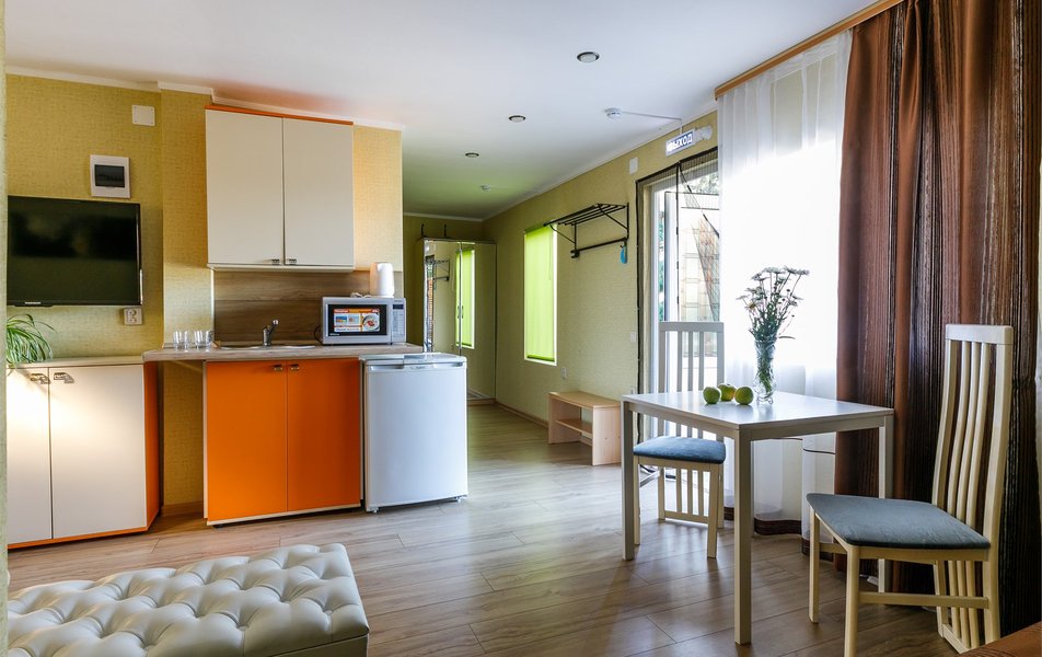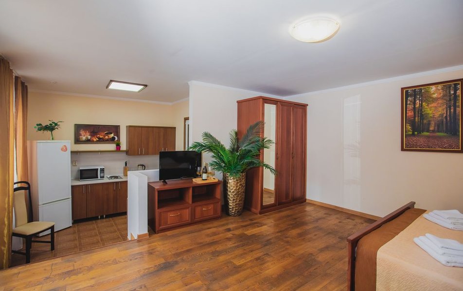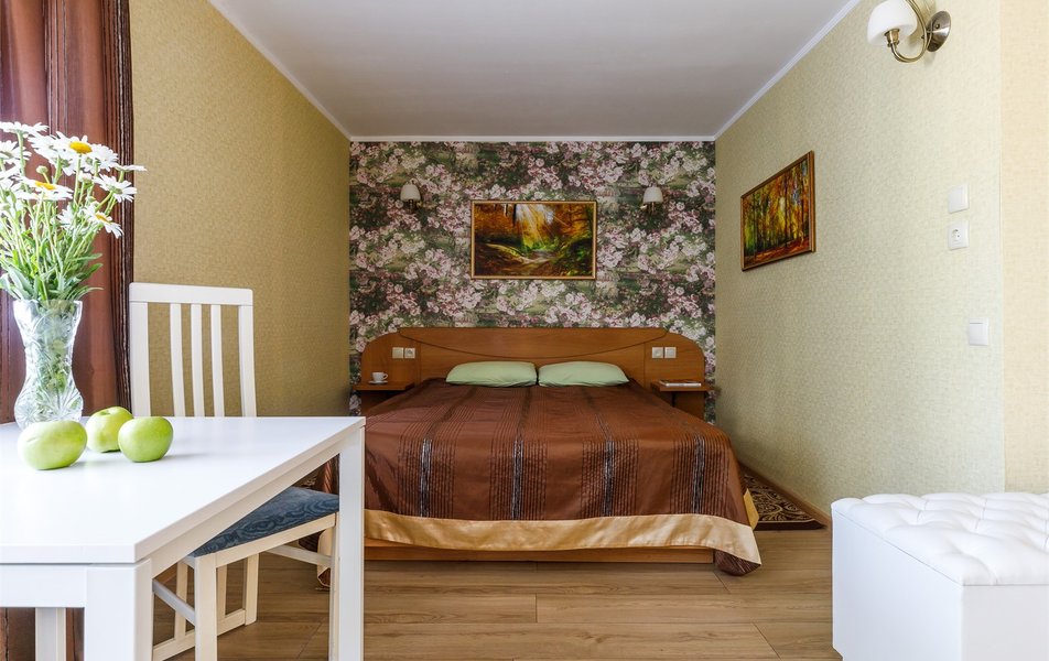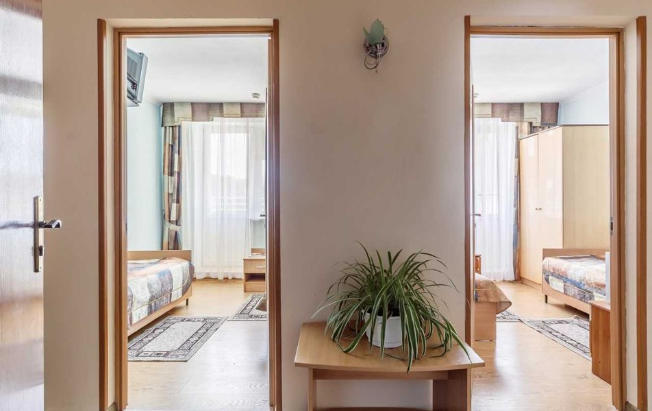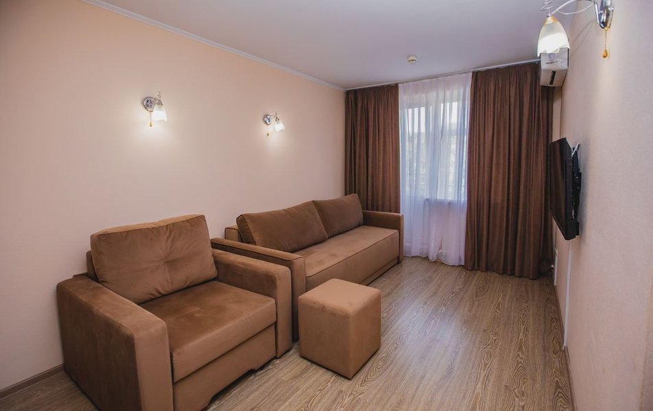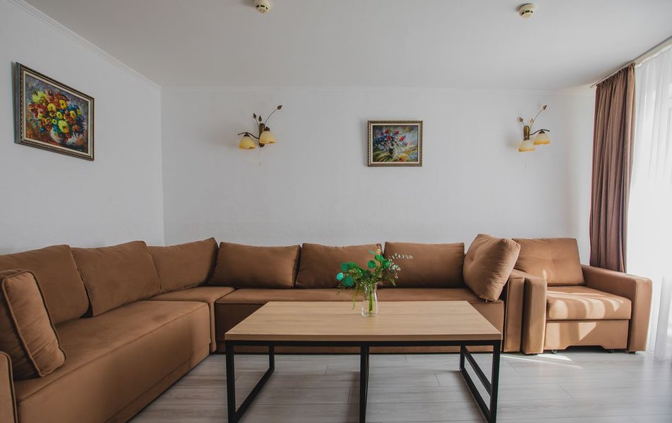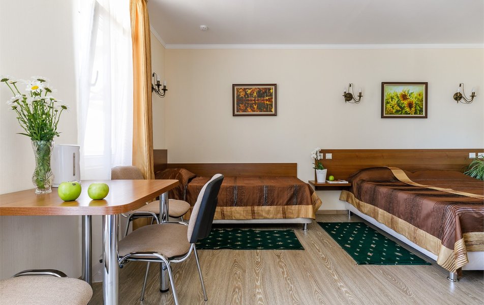 Люкс Апартаменты 2-местный 3-комнатный Количество комнат: 3-комнатный Тип номера: Люкс Дополнительное место: 2 дивана: и кресла-кровати Кол-во доп. мест: 4 Кол-во основных мест: 2 Площадь (кв. м): 60 Балкон: с мебелью Мебель: вешалка, диван раскладной: 2, зеркало, кресла, кровать двуспальная, кухонная мебель, прикроватные тумбочки, столик журнальный, столик туалетный, стол обеденный, стулья, шкаф Оборудование: микроволновая печь, набор посуды, сплит-система, телевизор, холодильник, чайный набор посуды, электрочайник Санузел: 2 санузла, биде, с душевой кабиной, туалетные принадлежности, фен Сервис: смена полотенец, смена постельного белья, уборка номера