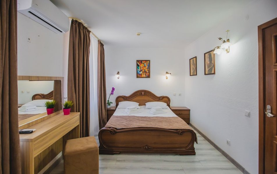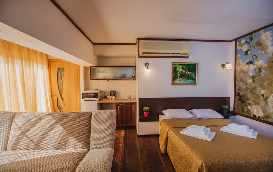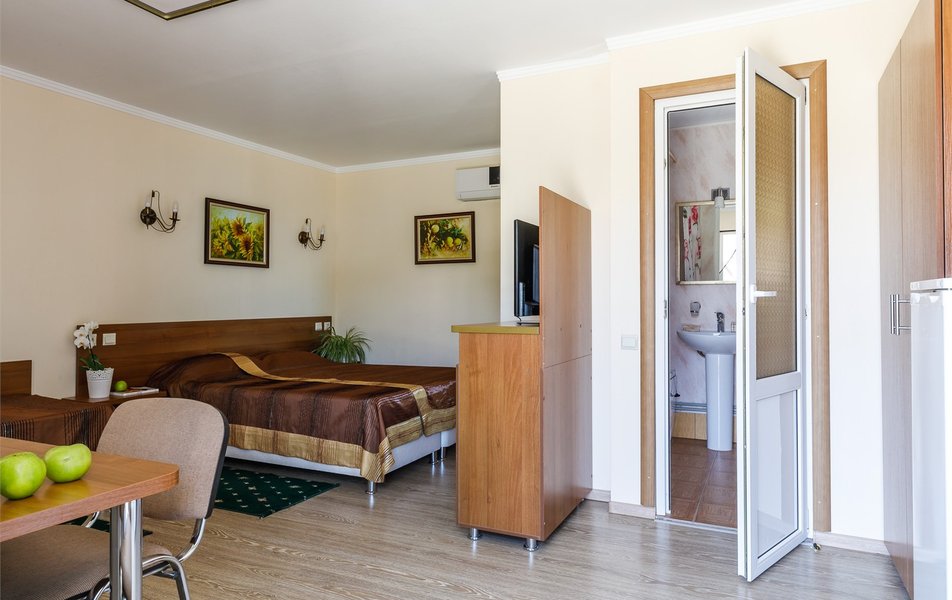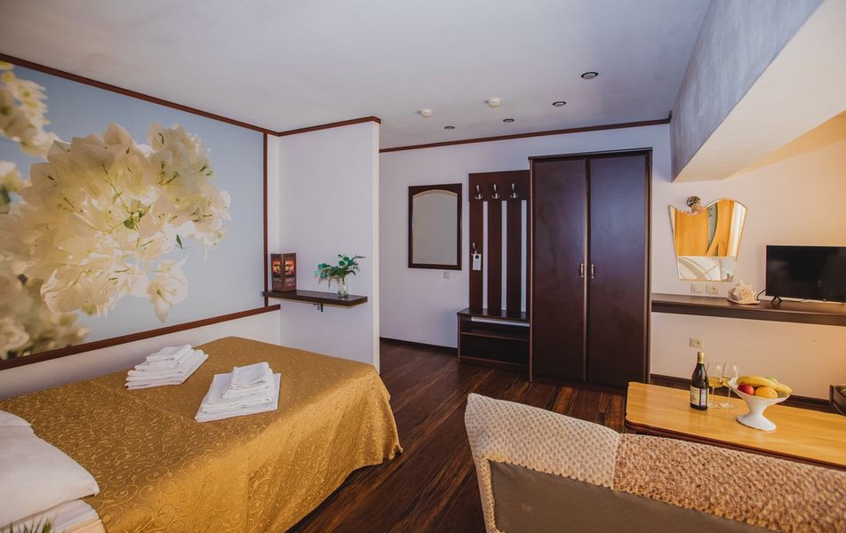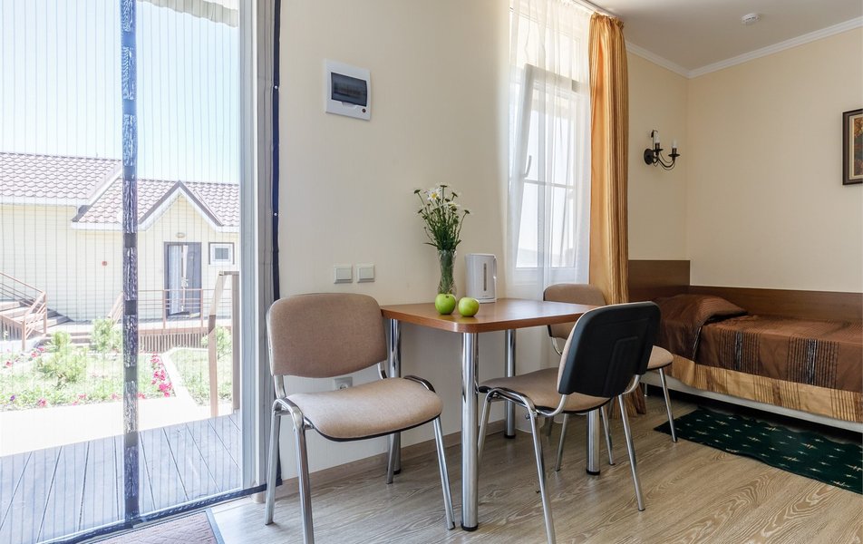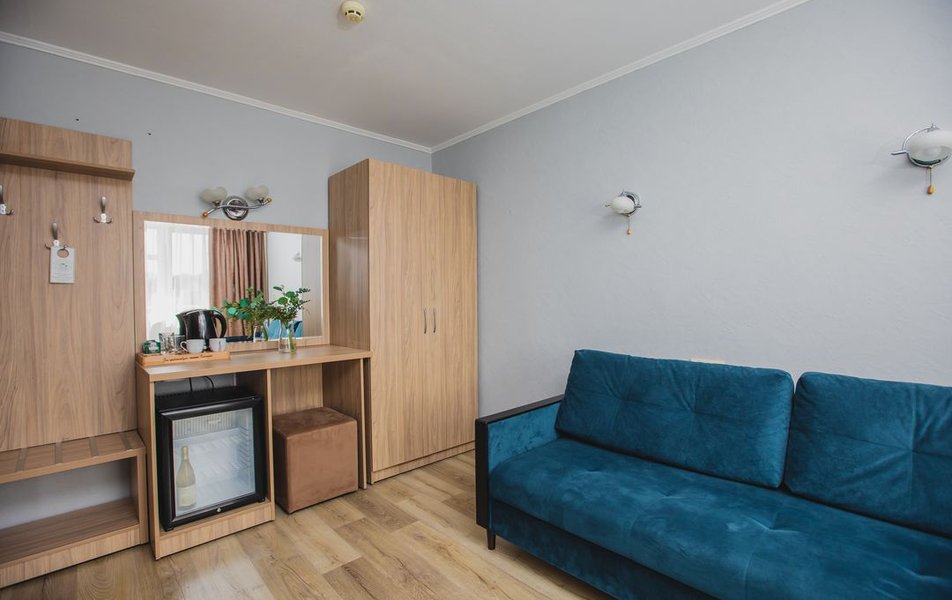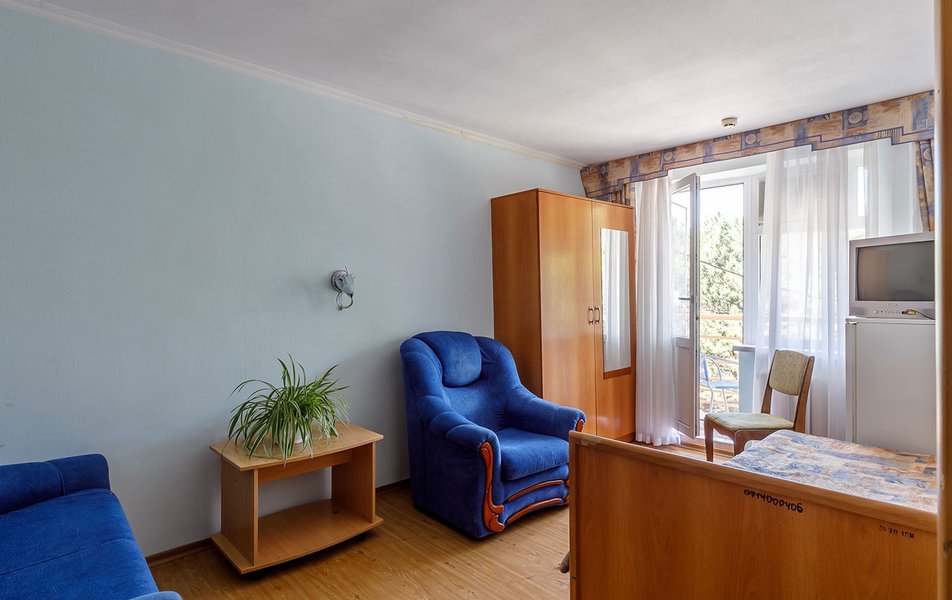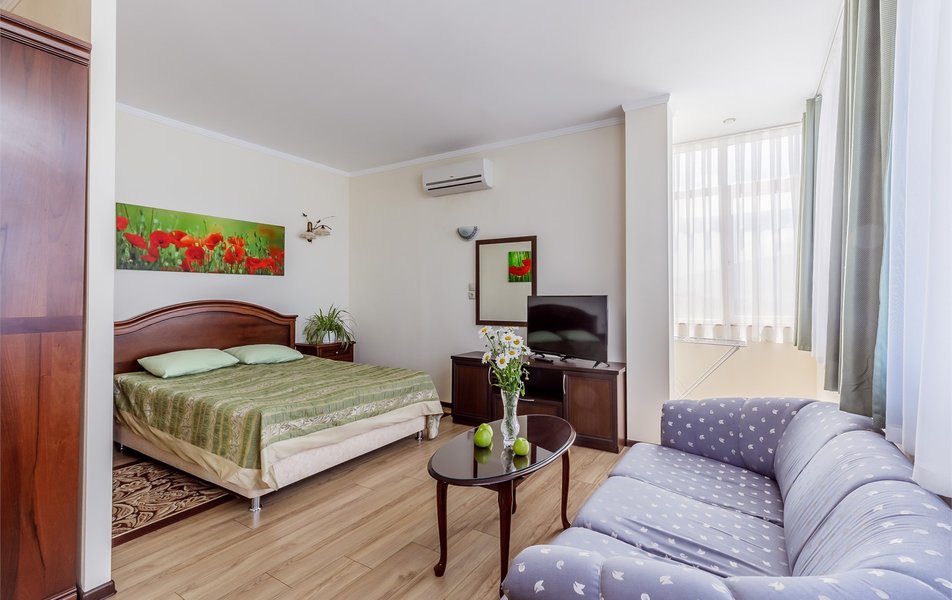 Люкс 2-местный 2-комнатный (вид на море и бассейн) Количество комнат: 2-комнатный Тип номера: Люкс Дополнительное место: раскладной диван, кресло-кровать Вид из номера: на море: и бассейн Кол-во доп. мест: 3 Кол-во основных мест: 2 Площадь (кв. м): 28 Балкон: с мебелью Мебель: вешалка, диван раскладной, зеркало, кресло-кровать, кровать двуспальная, прикроватные тумбочки, стол, стул, шкаф Оборудование: сплит-система, телевизор, холодильник, чайный набор посуды, электрочайник Санузел: с душем, туалетные принадлежности, фен Сервис: смена полотенец, смена постельного белья, уборка номера